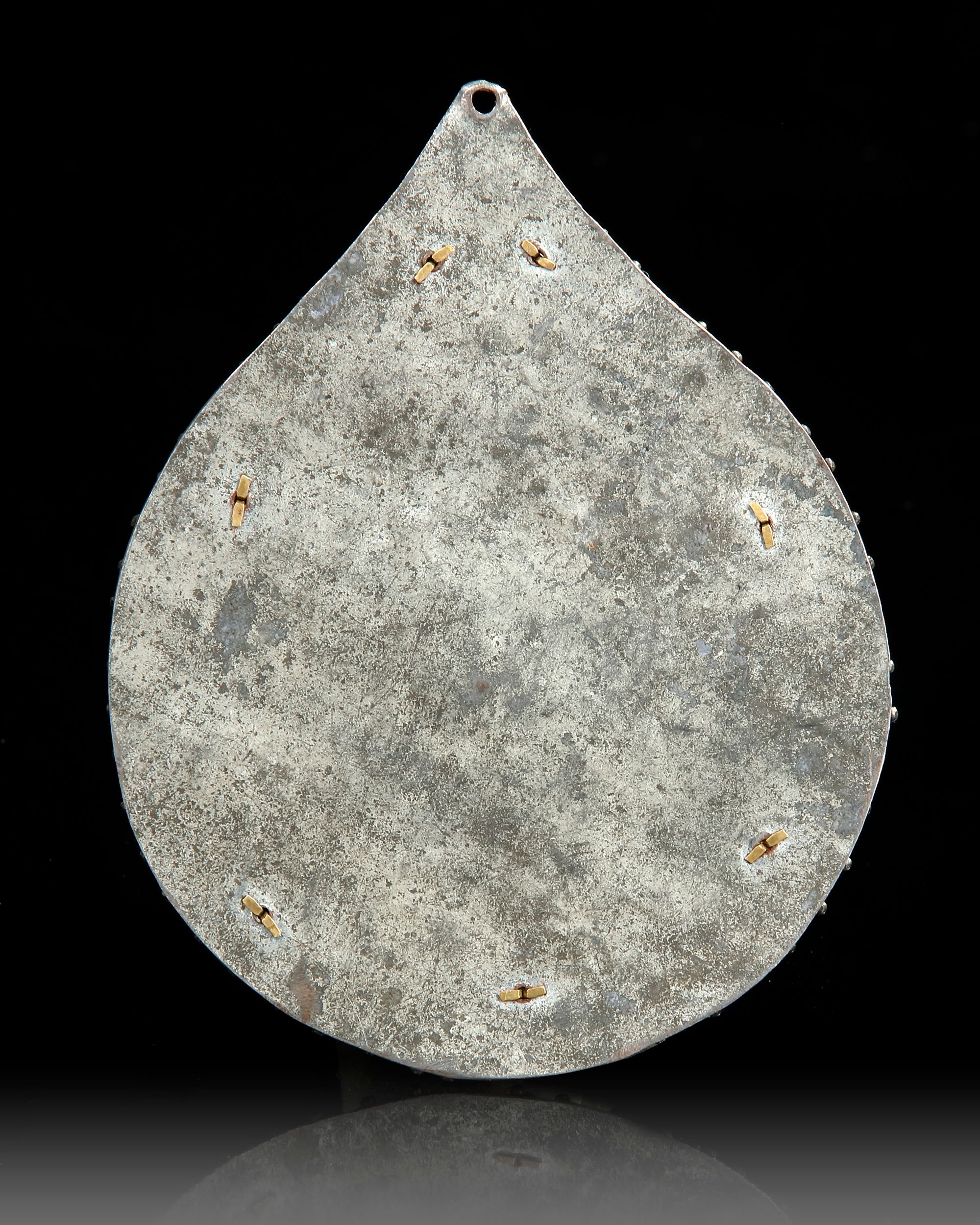 Of tear drop form, with stamped thin gold sheets sandwiching a metal plate,