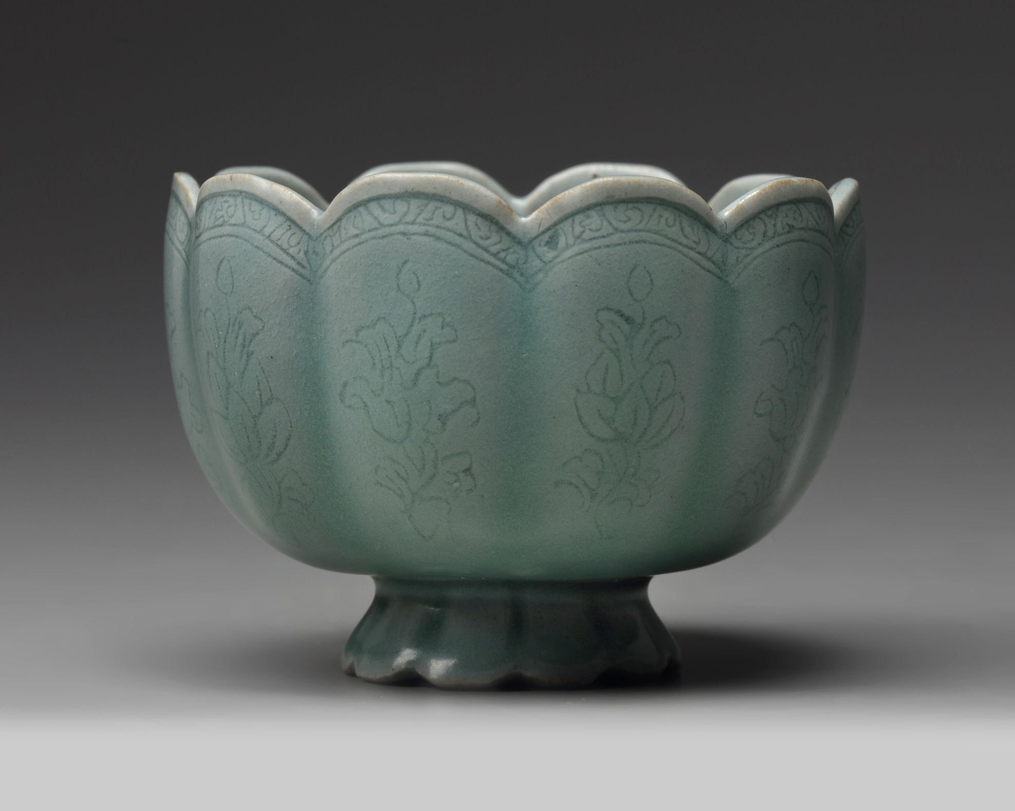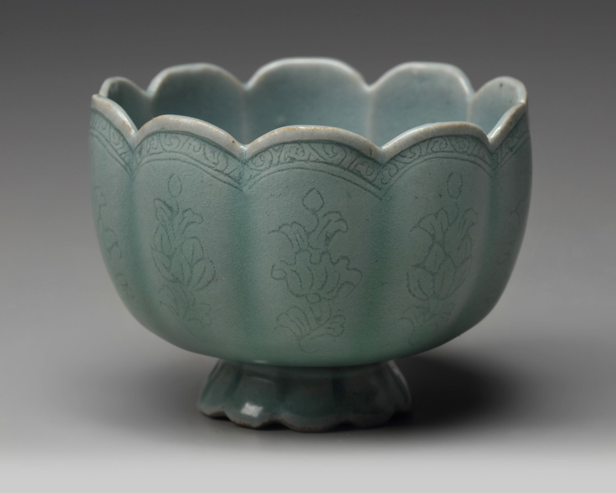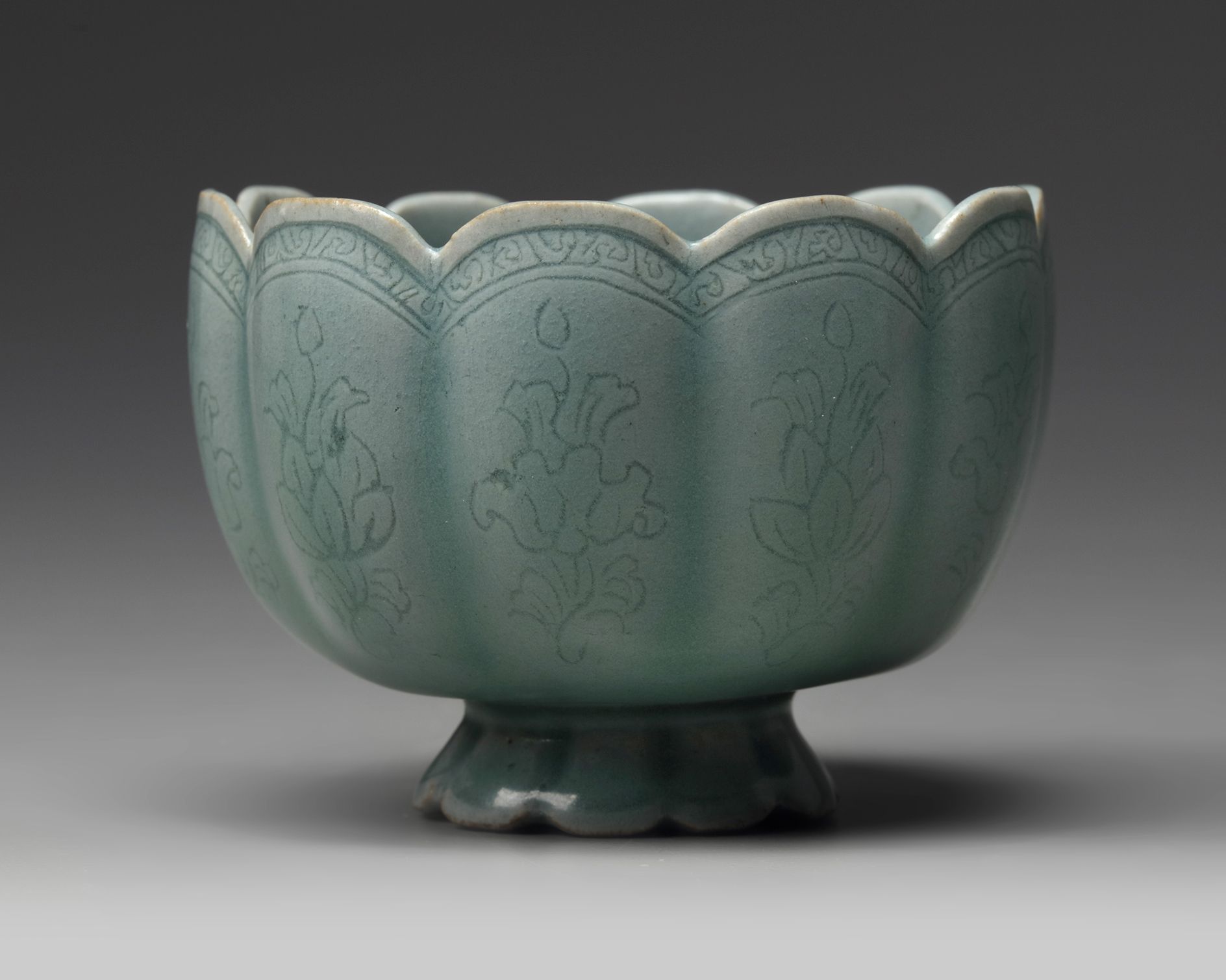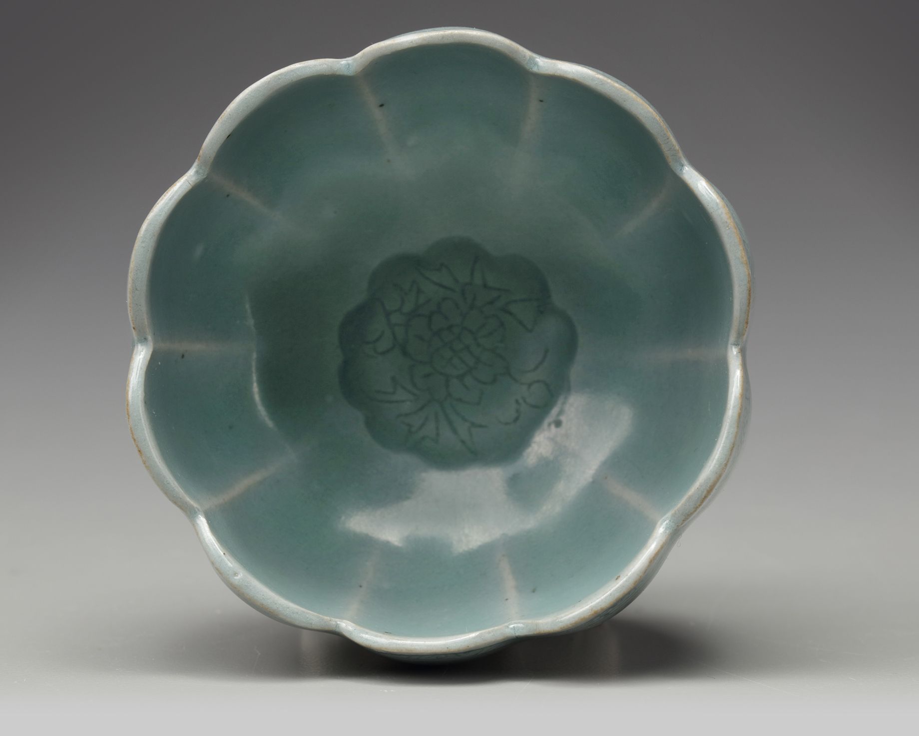 The cup is moulded with lobes in the form of the petals of the flower, each lobe is carved to the exterior with an upright floral design, all below the rim which is decorated with a foliate band. The interior is fashioned with a recessed flowerhead-shaped depression in which a flower spray is carved.