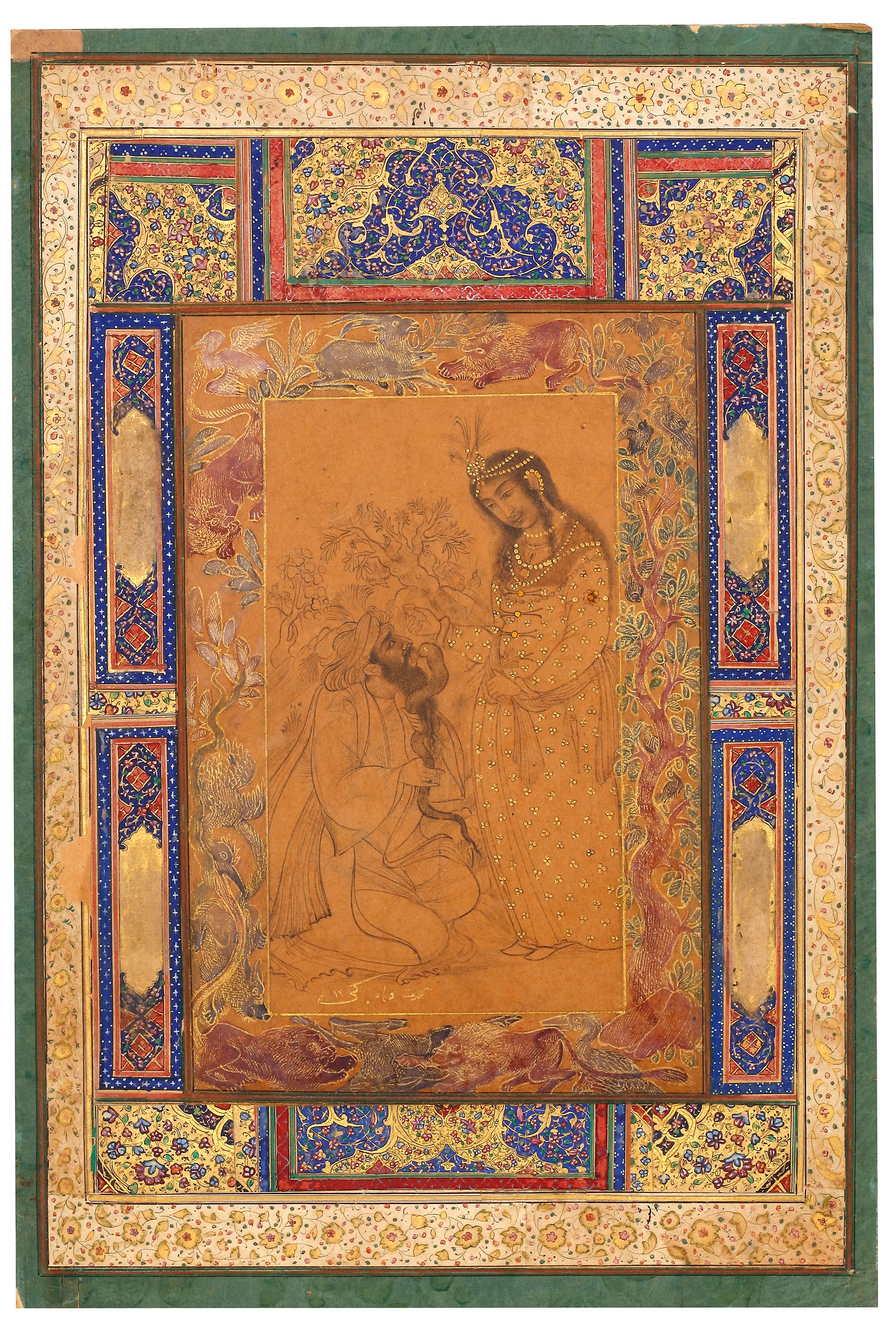 Ink on paper with the use of gold, inner borders decorated with animals and vegetation in colors and gold, outer border with illuminated panels cut out from earlier manuscripts.