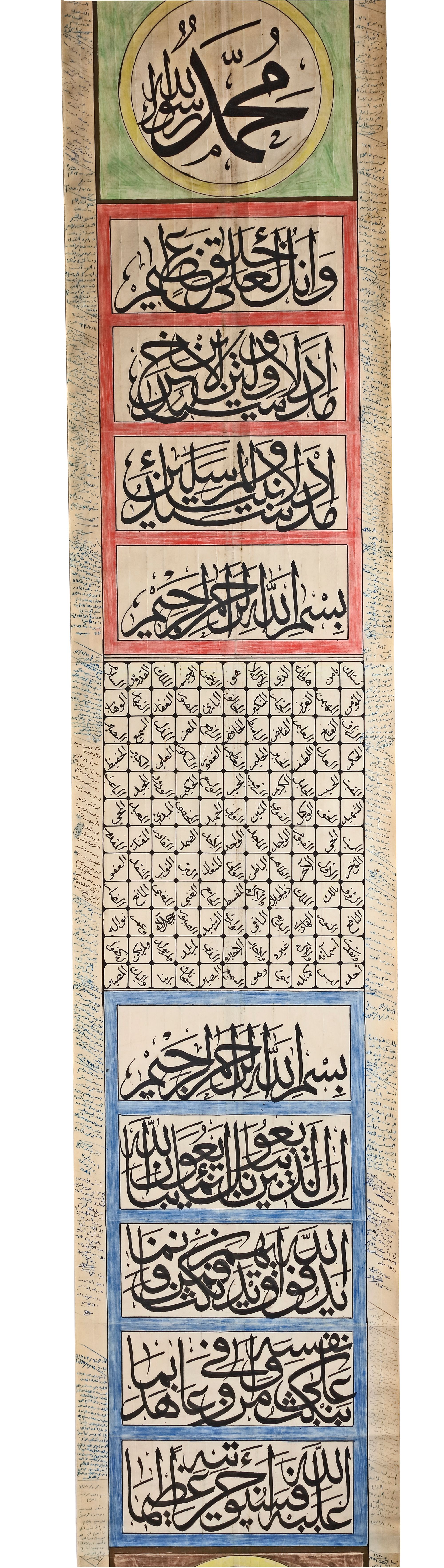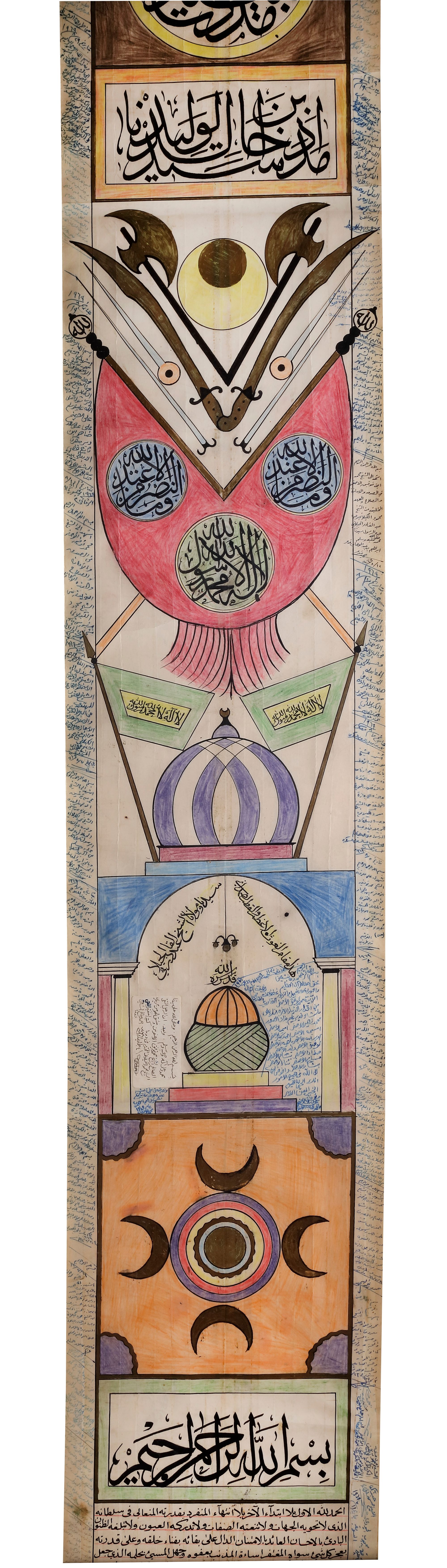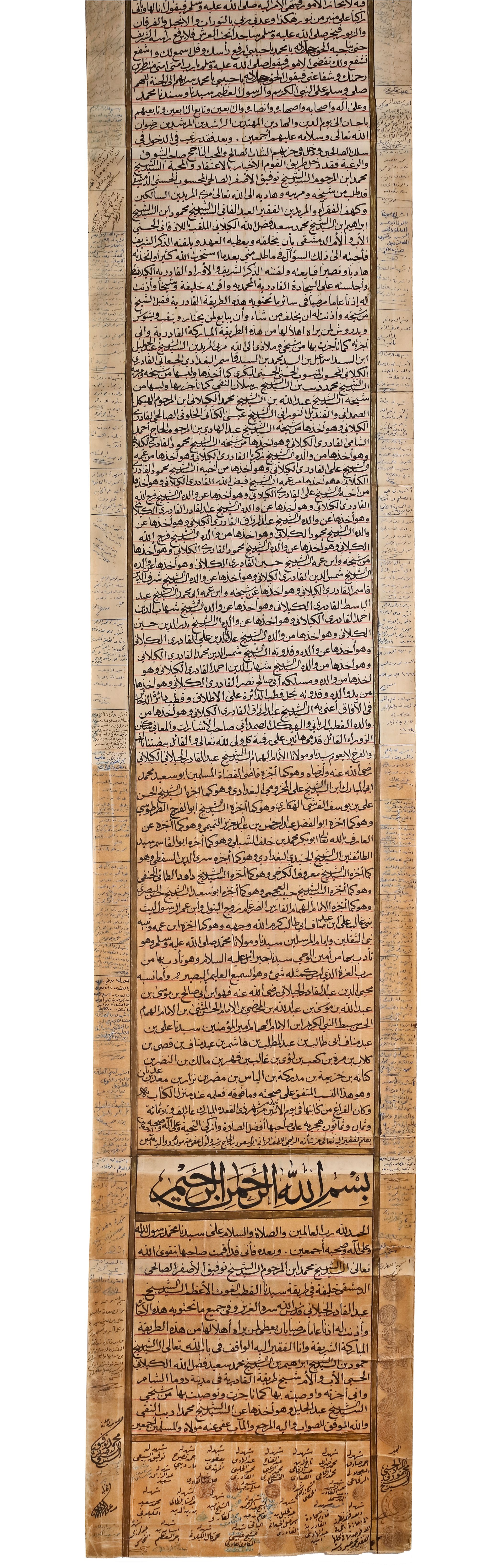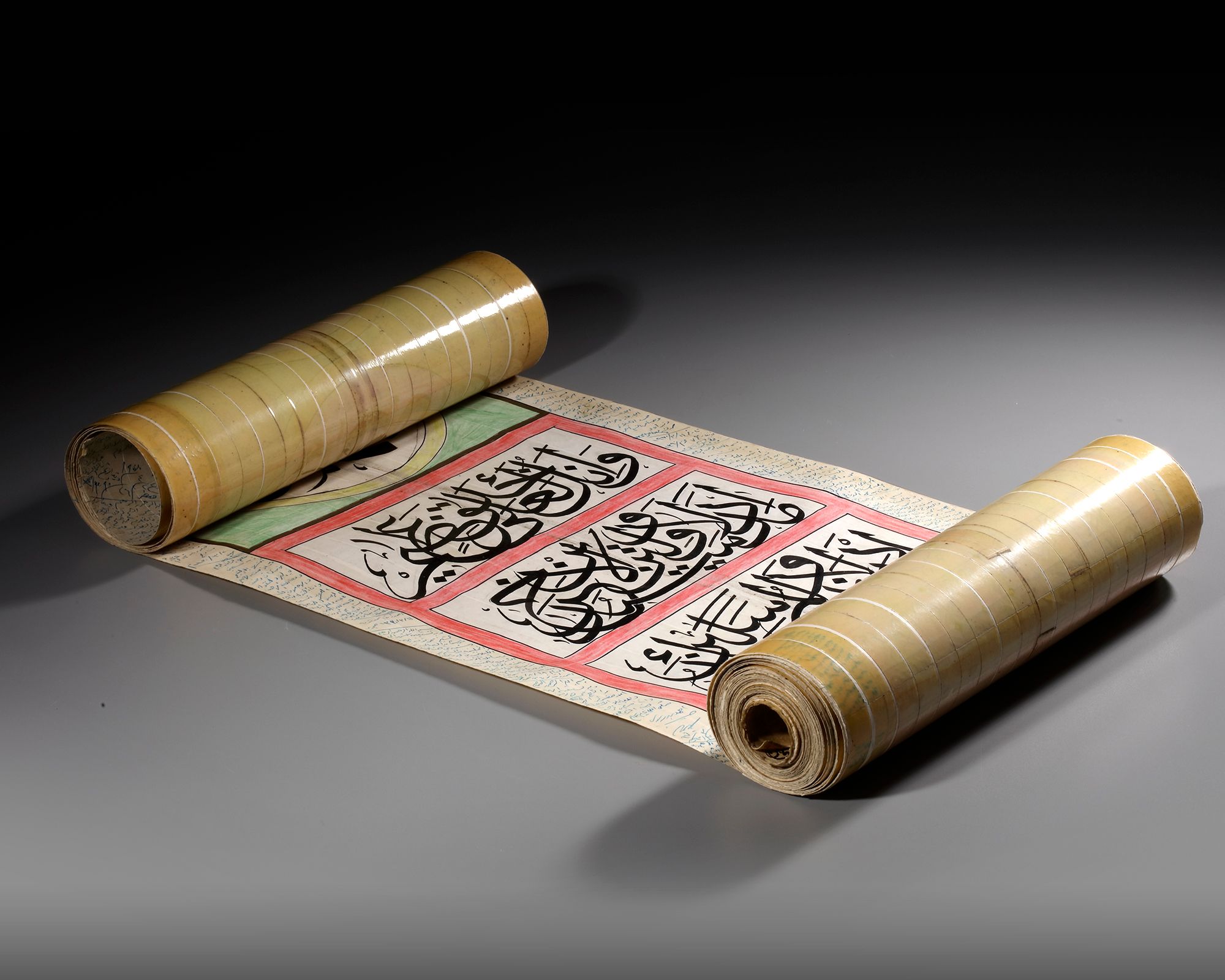 This certified Permission (Ijaza) beautifully decorarted and colored with an illustration of Alsheikh Abdul Qadir Alkylani's mausoleum, written in Thulth, with over 4 meters long supported (add later) by plastic sheet from the back.