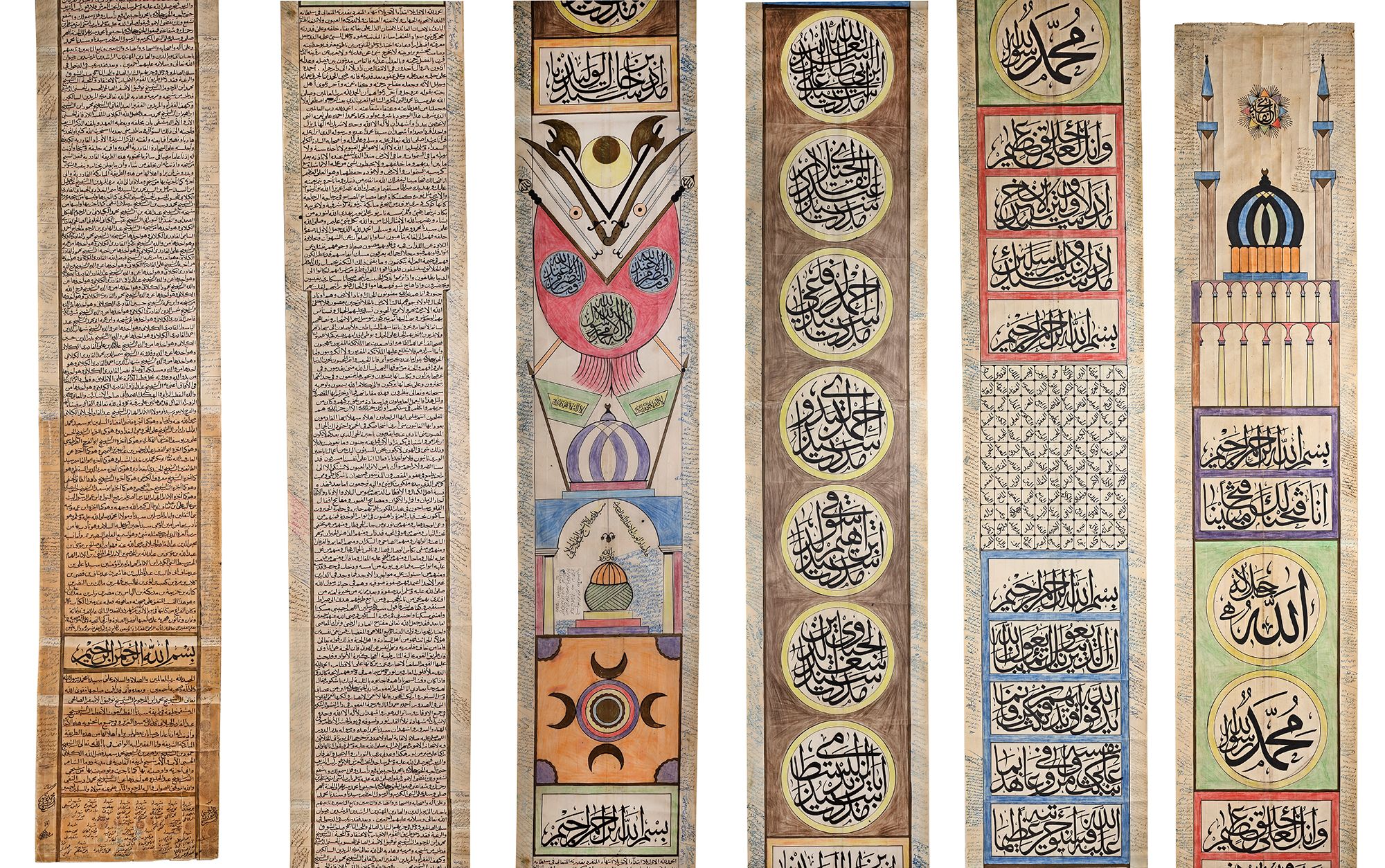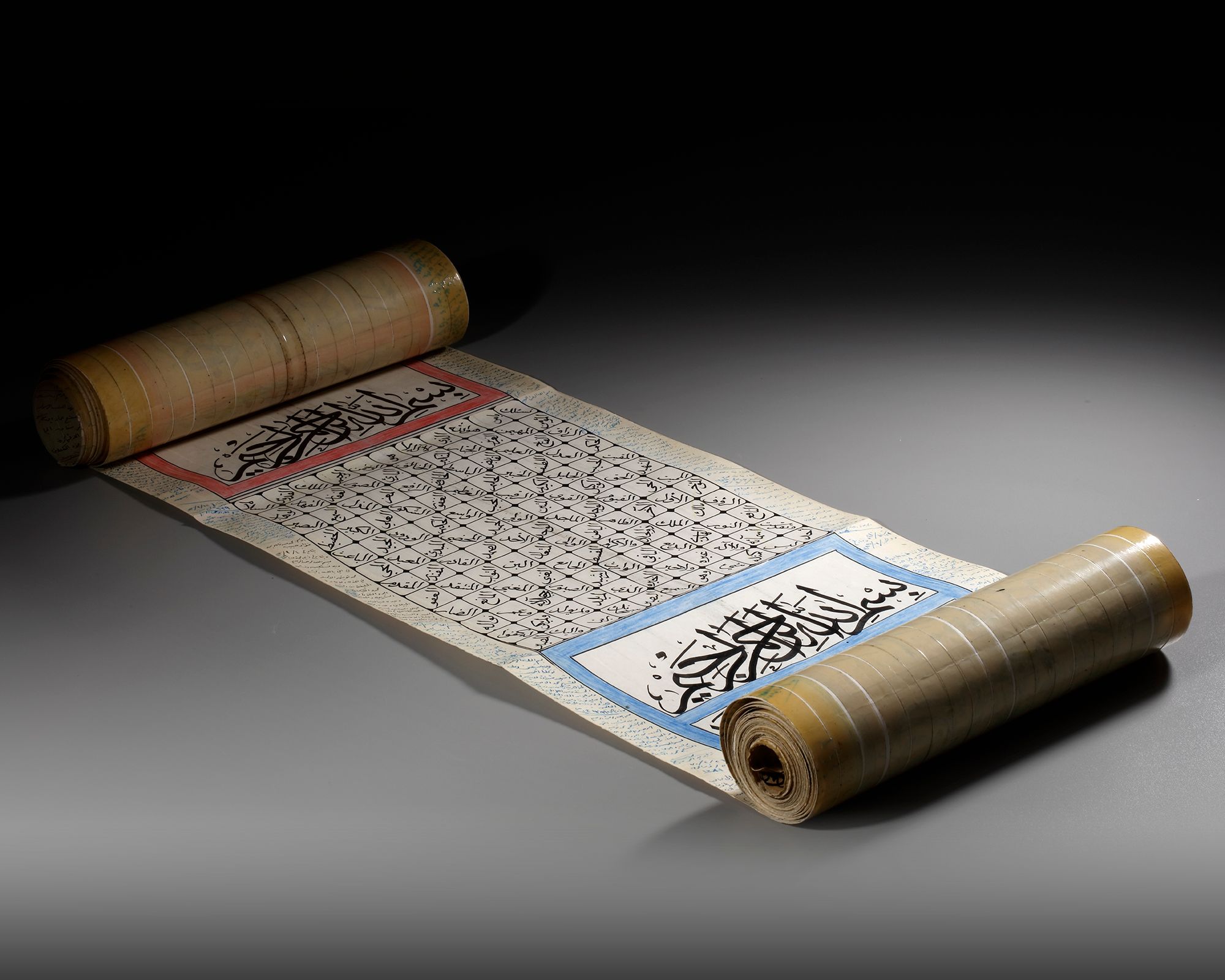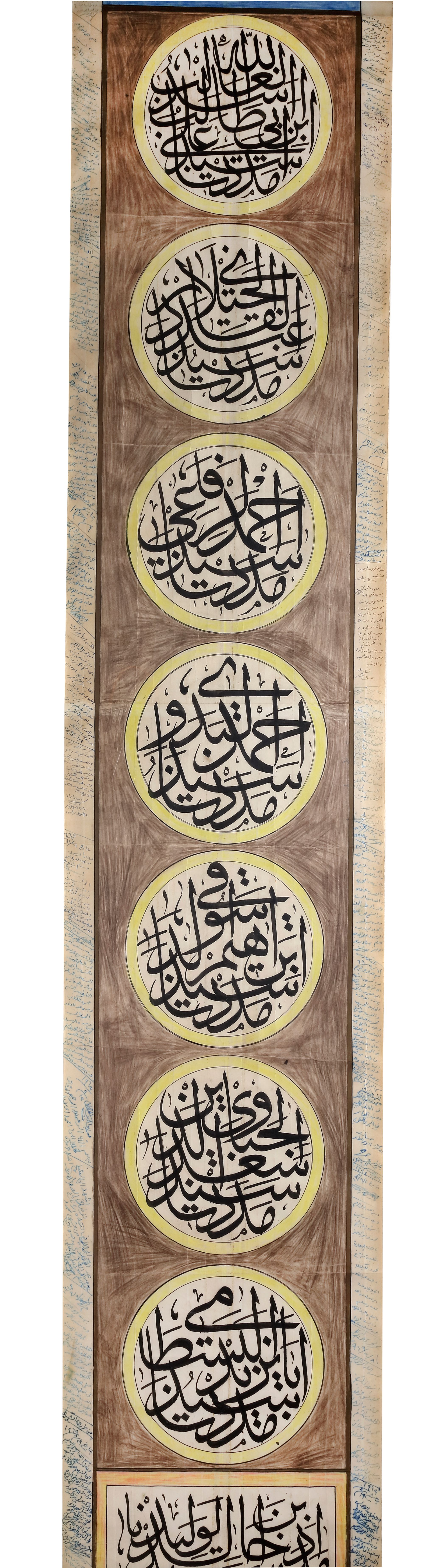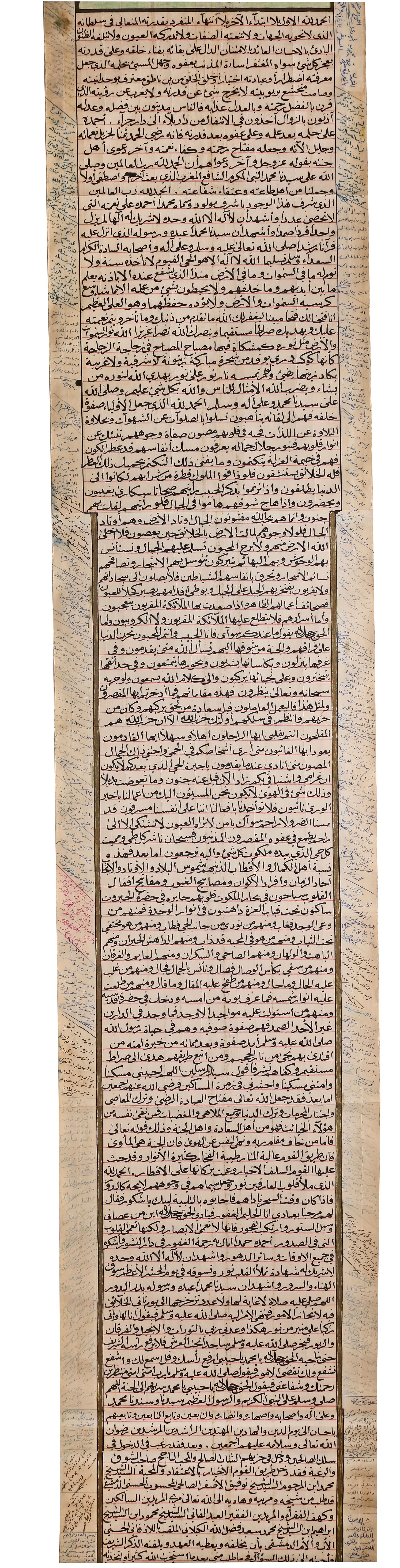 This certified Permission (Ijaza) beautifully decorarted and colored with an illustration of Alsheikh Abdul Qadir Alkylani's mausoleum, written in Thulth, with over 4 meters long supported (add later) by plastic sheet from the back.