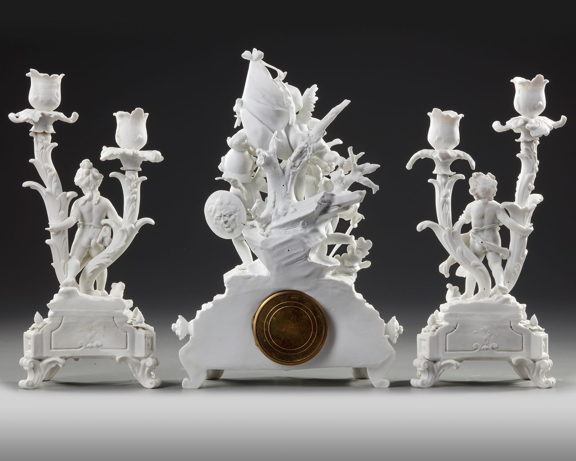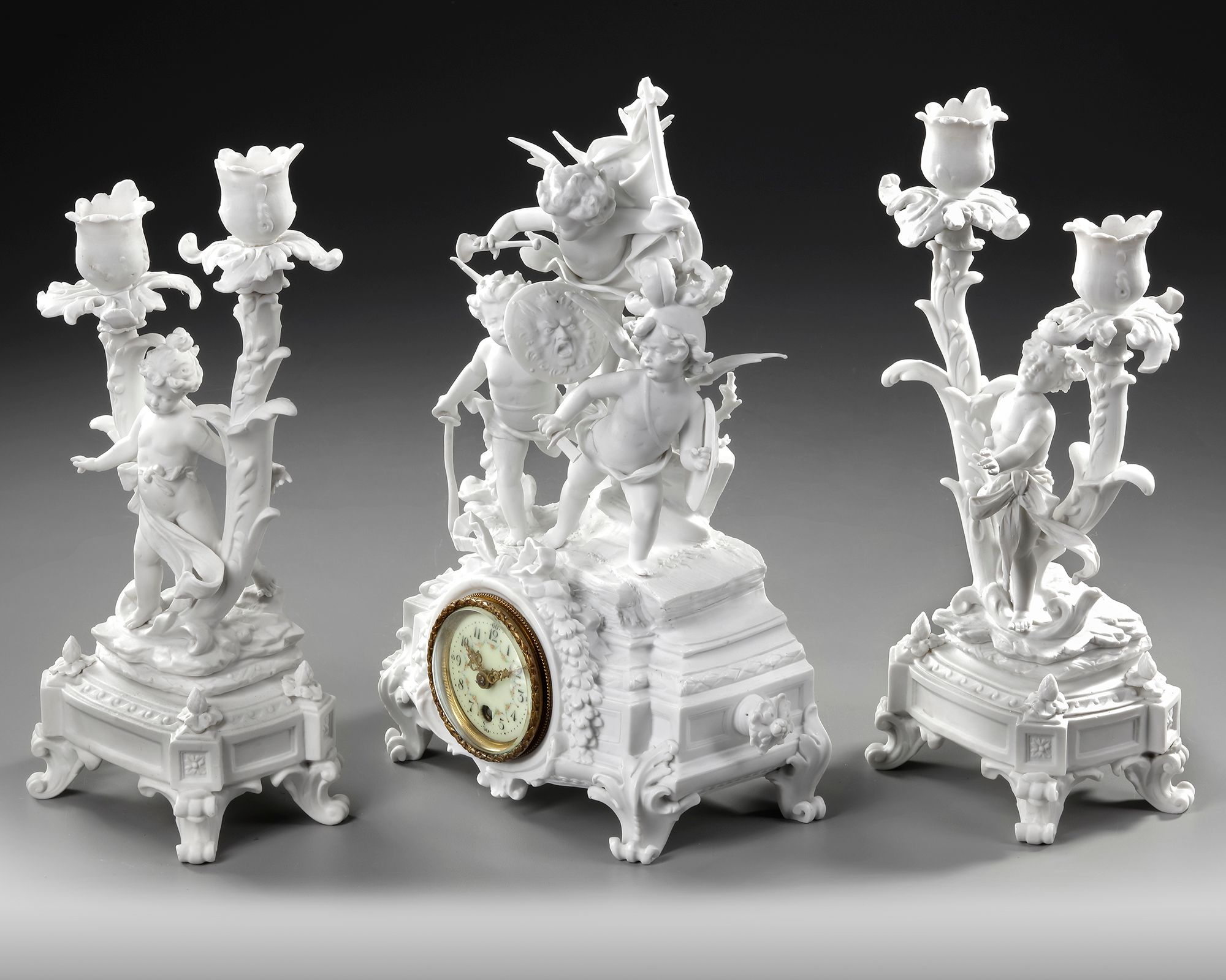 A Sèvres biscuit clock set, composed of a clock and two candelabras with decorations of babies and cherubs.