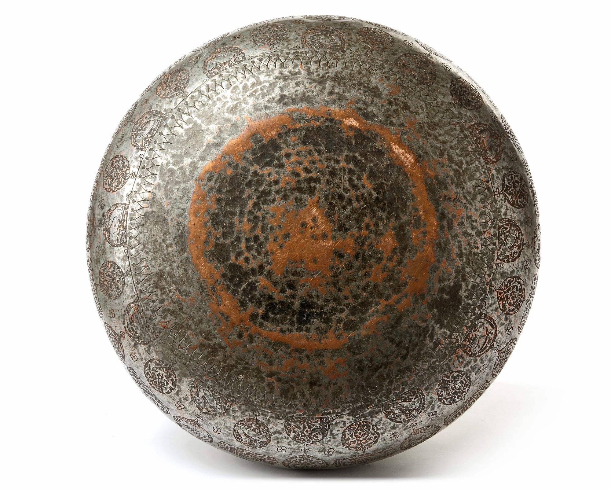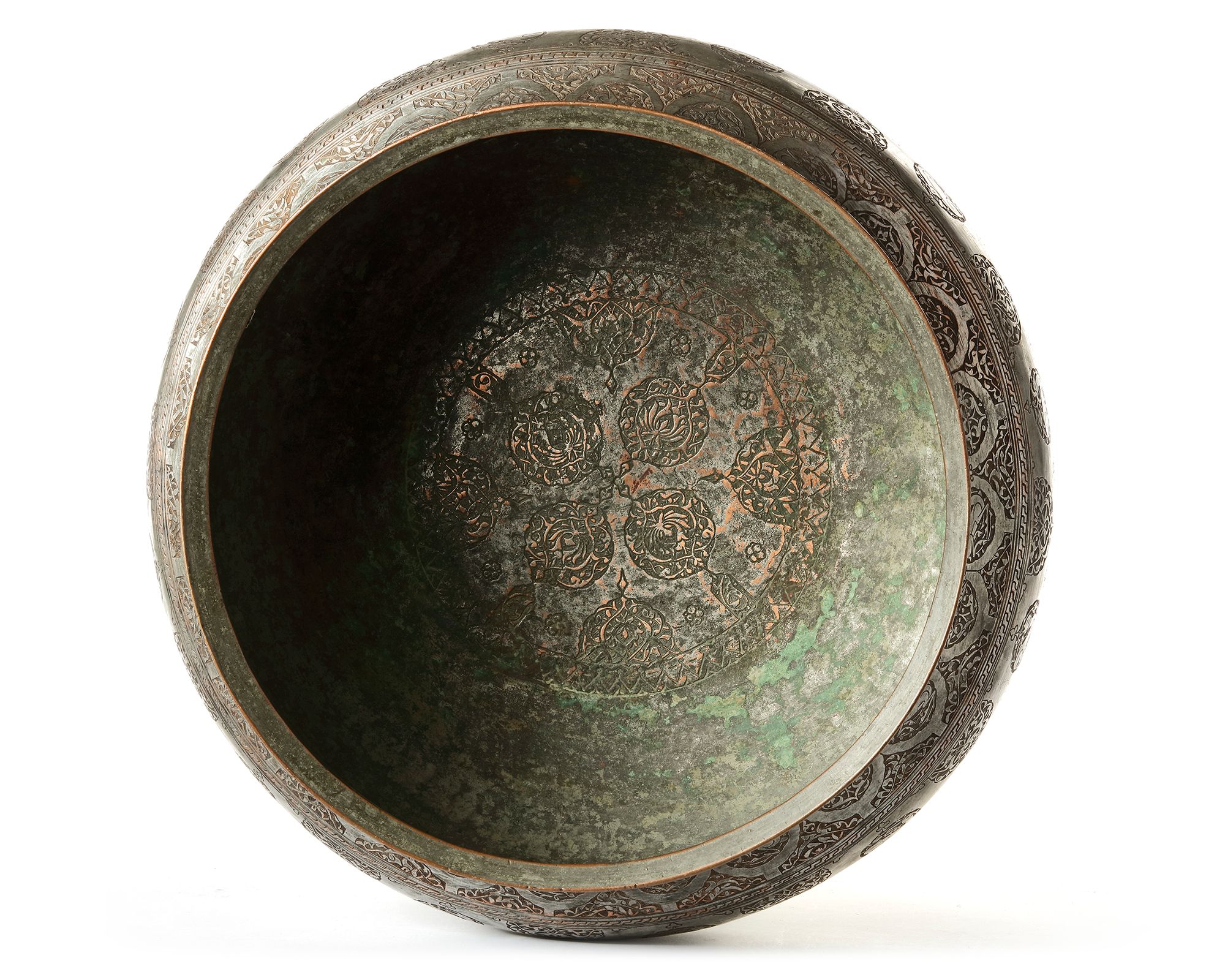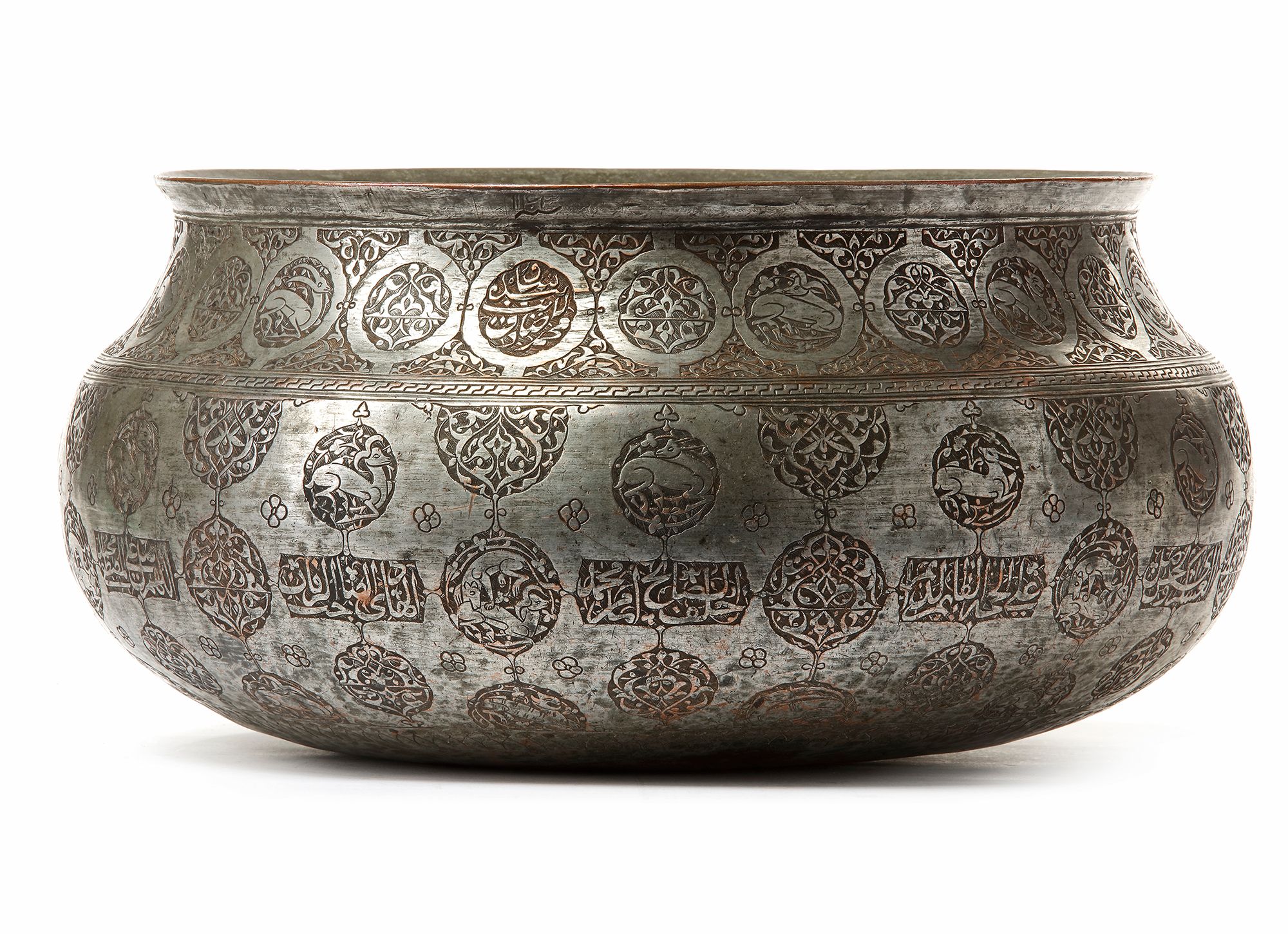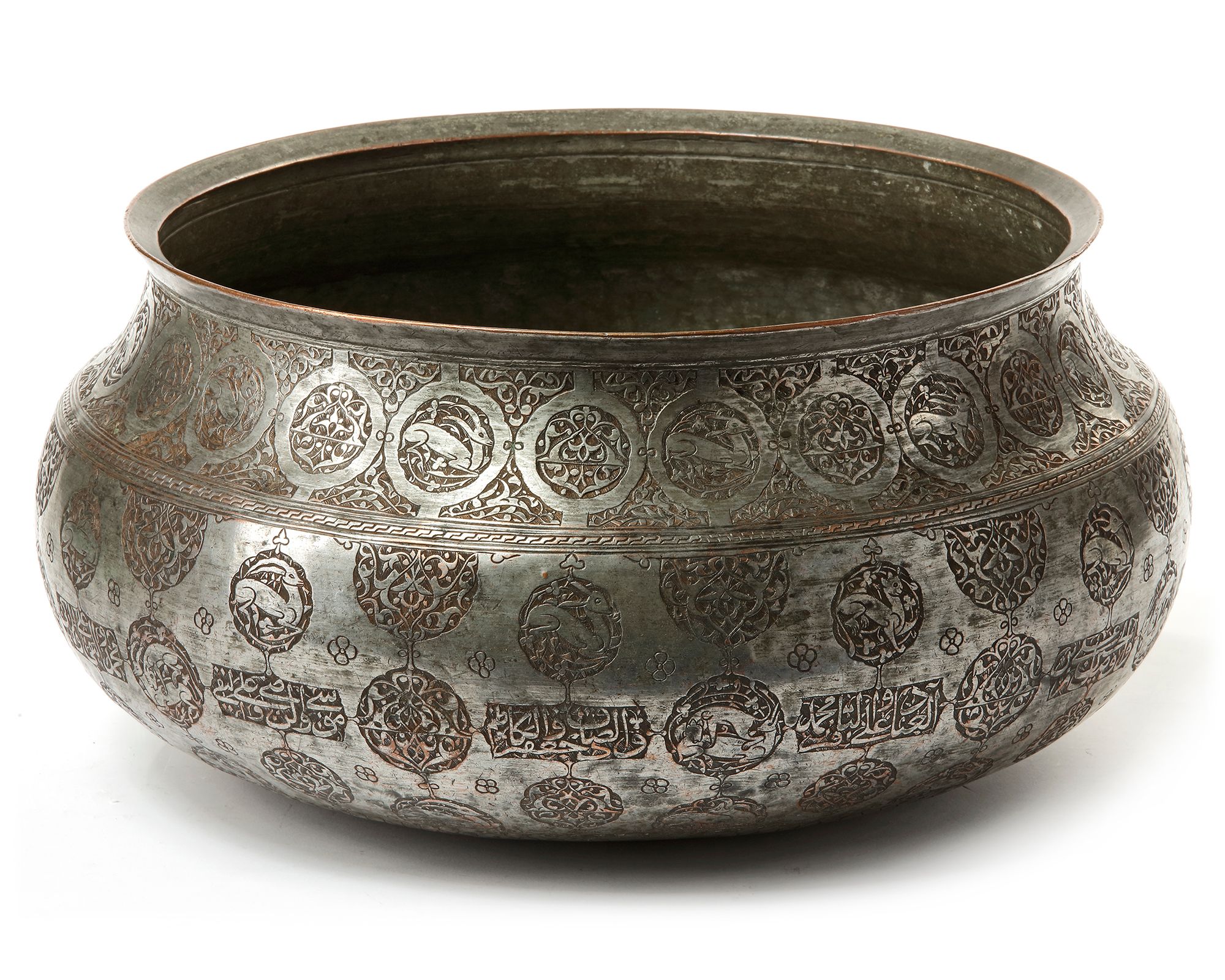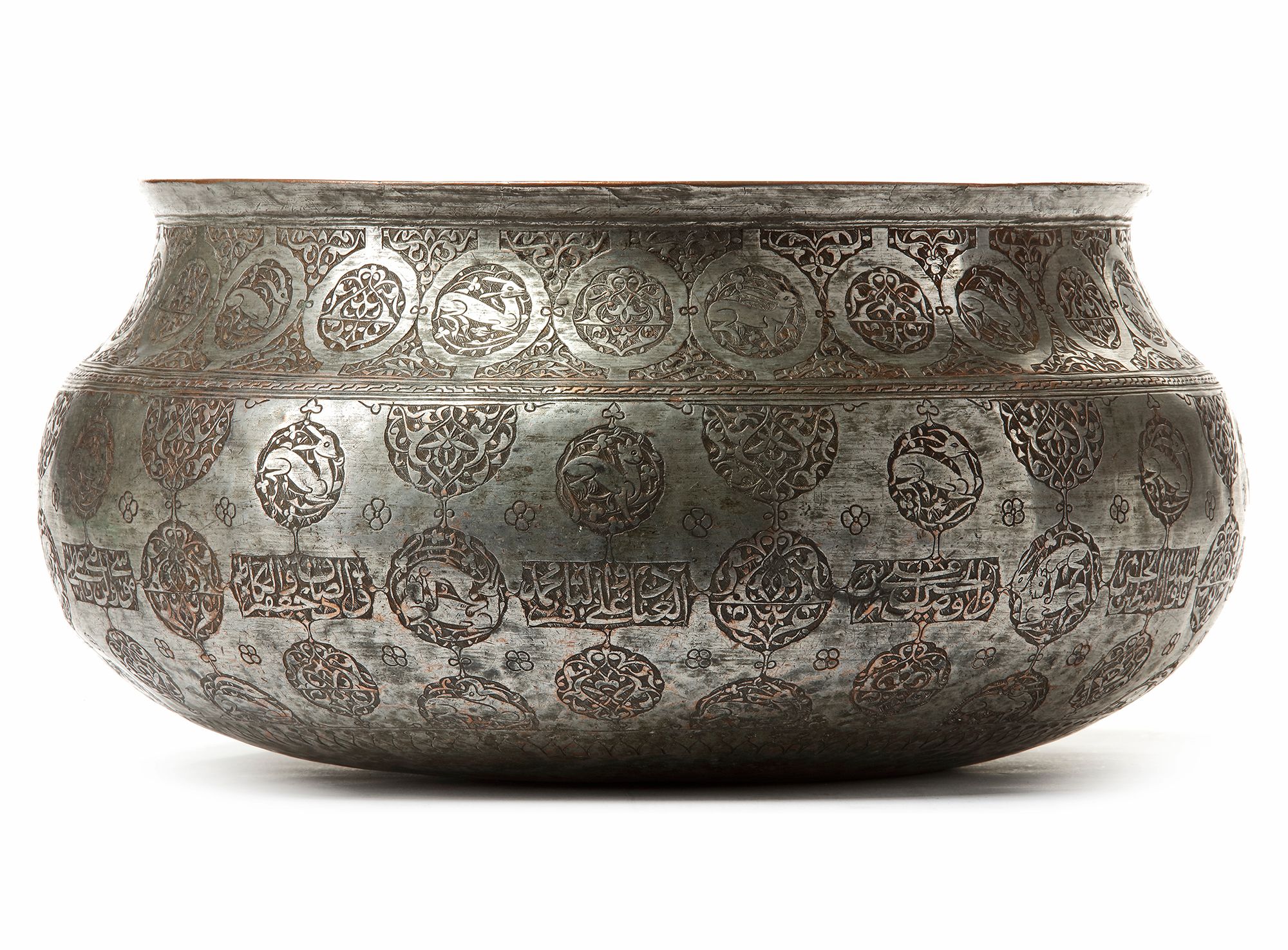 Of rounded form with everted rim, the body engraved with medallions comprising hunting scenes, seated animals and split palmettes alternating with inscription-filled cartouches, the neck decorated with a frieze of similarly seated animals and scrolling arabesques within smaller medallions, one with an an inscription, the interior engraved with a circular design of linked medallions with palmettes. 33.6 cm. diam.
