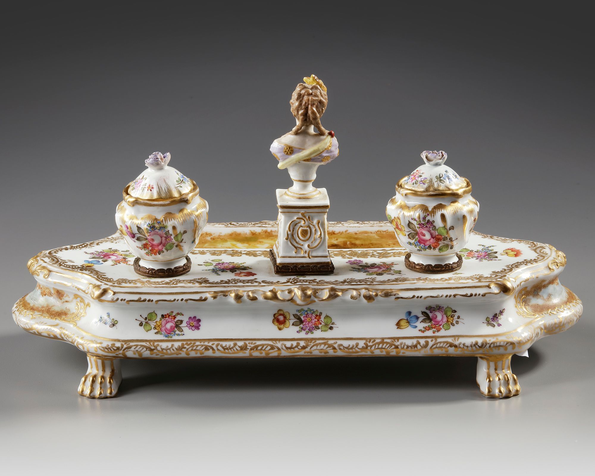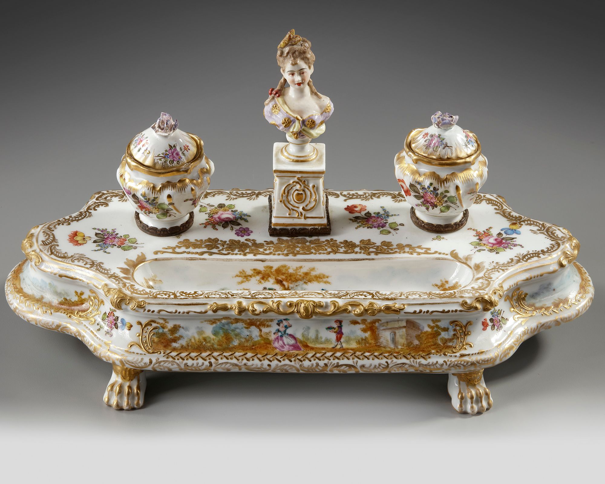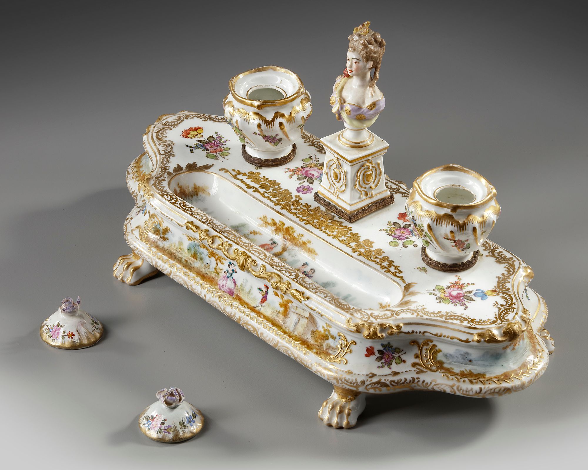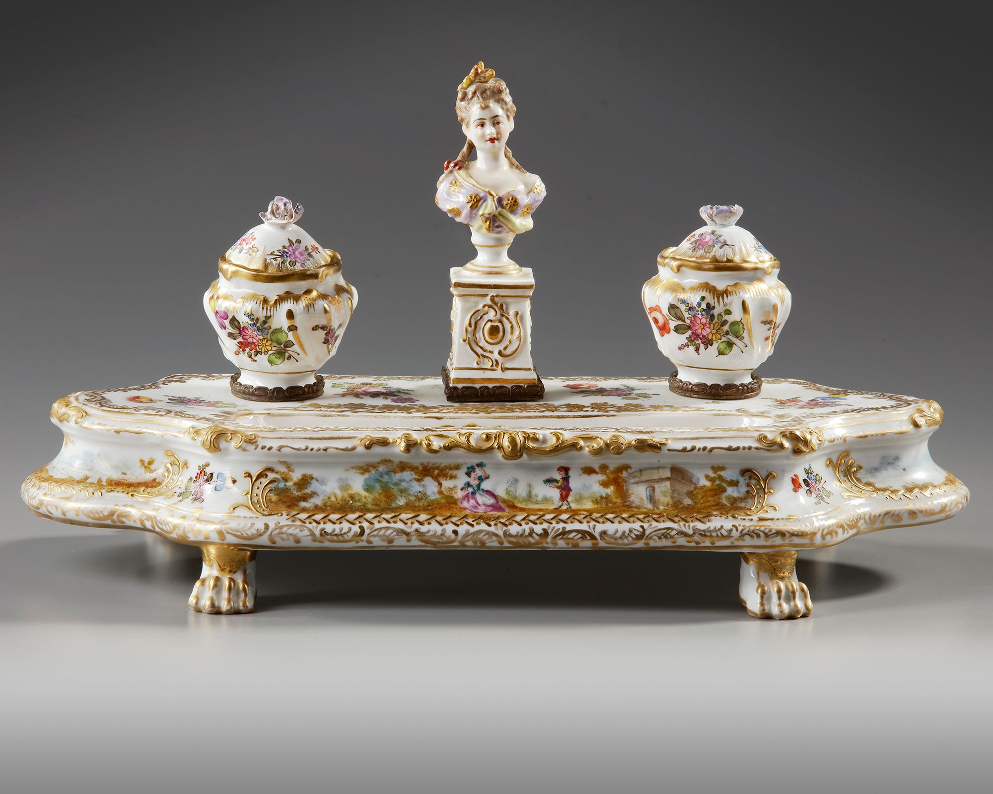 A white German porcelain inkwell set, floral and gold decorations with characters and landscapes,