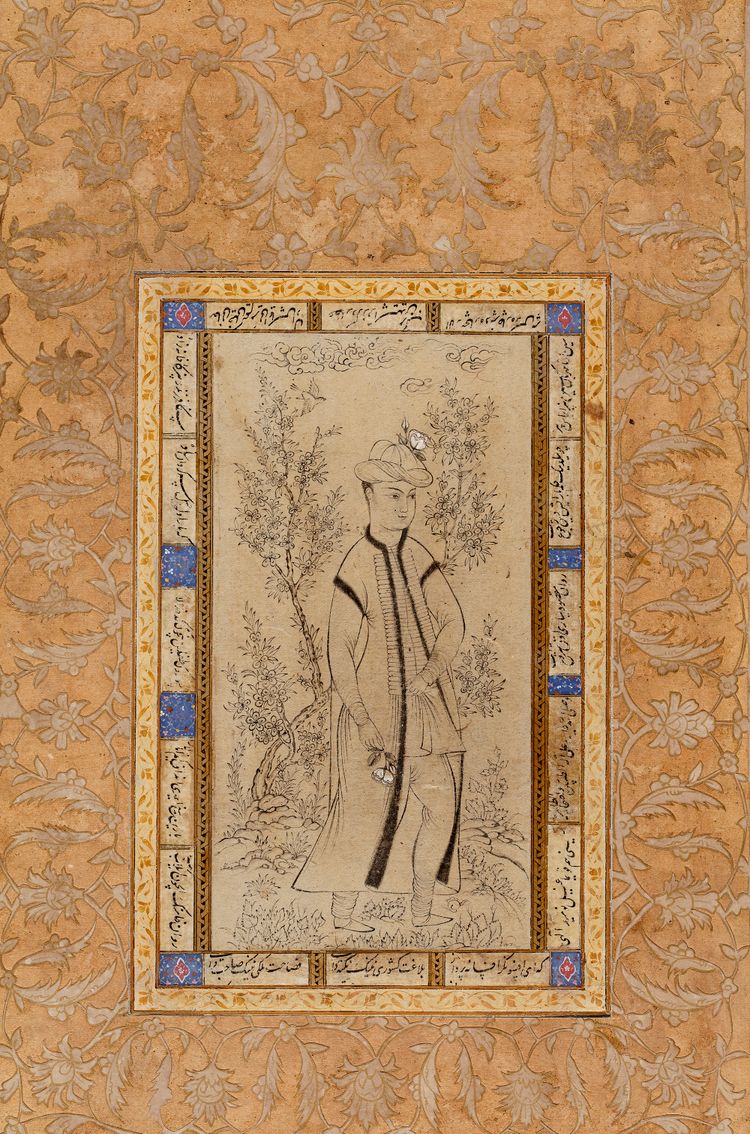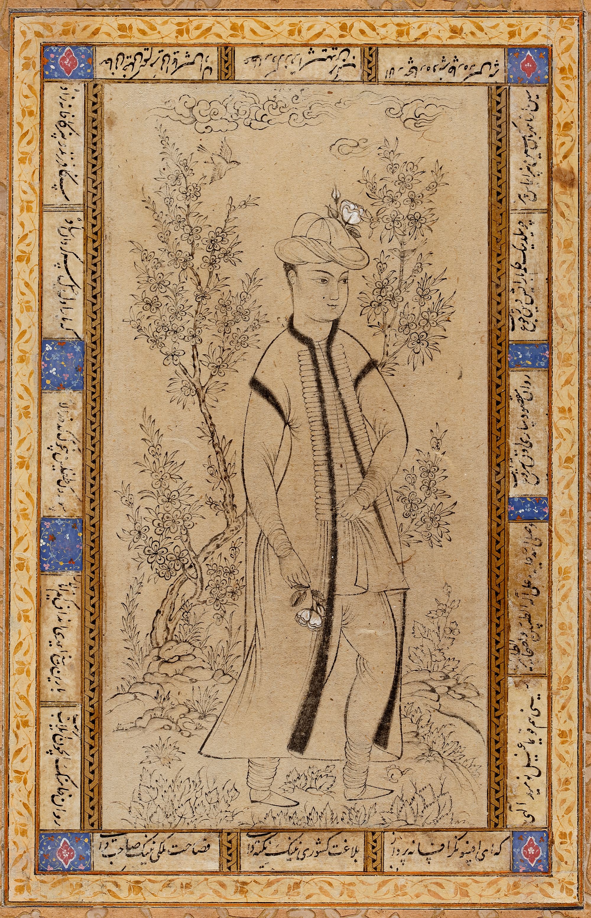 Pen and ink heightened with gold on paper, a youth stands wearing flowing fur-lined robes and hat holding a white rose in his right hand, around hem a leafy landscape with flowering trees, shrubs and birds, laid down between minor borders of black and gold strapwork and neat black nasta’liq cartouches on wide margins decorated with gold floral motifs with red and blue accents. 21.5 by 14 cm.