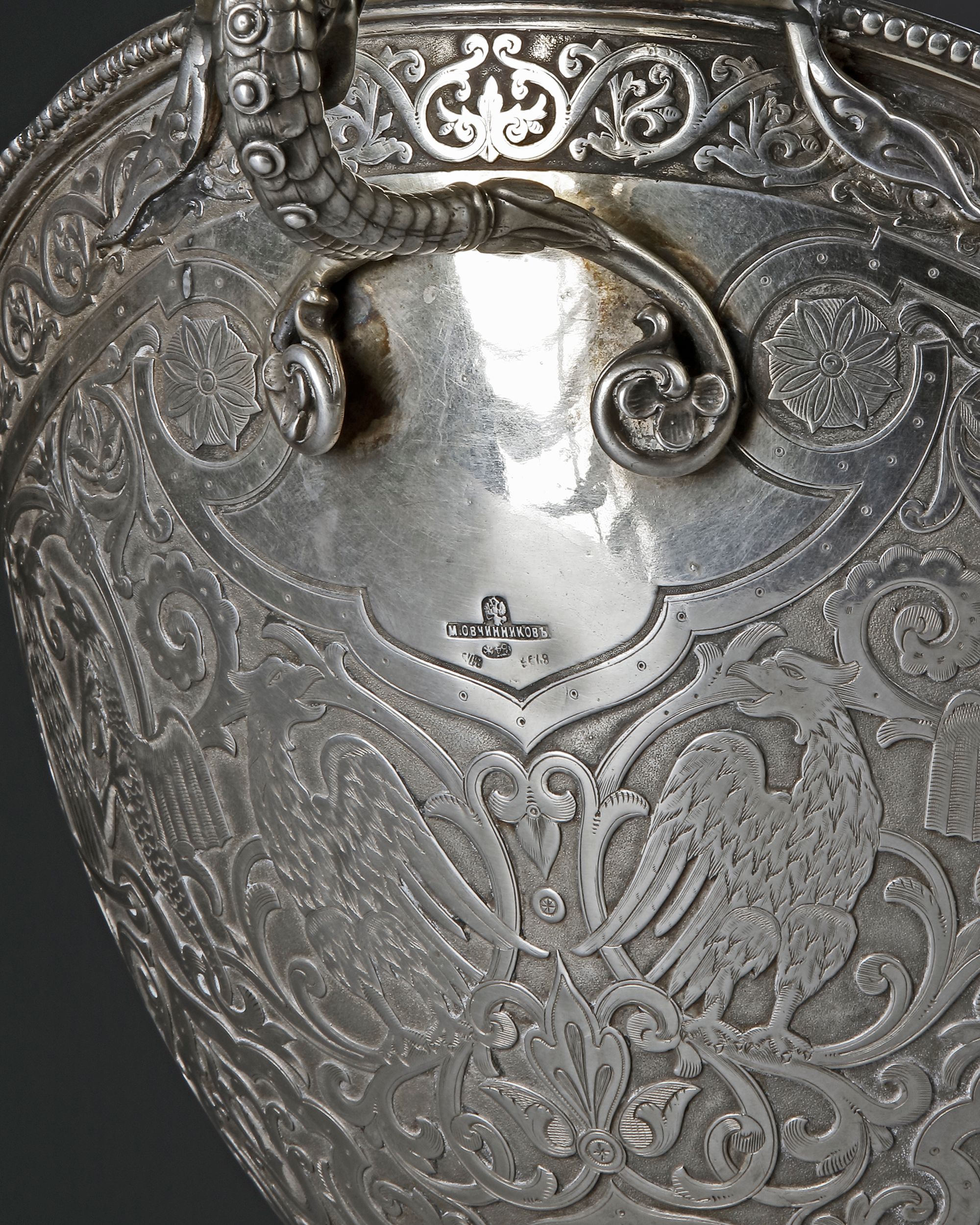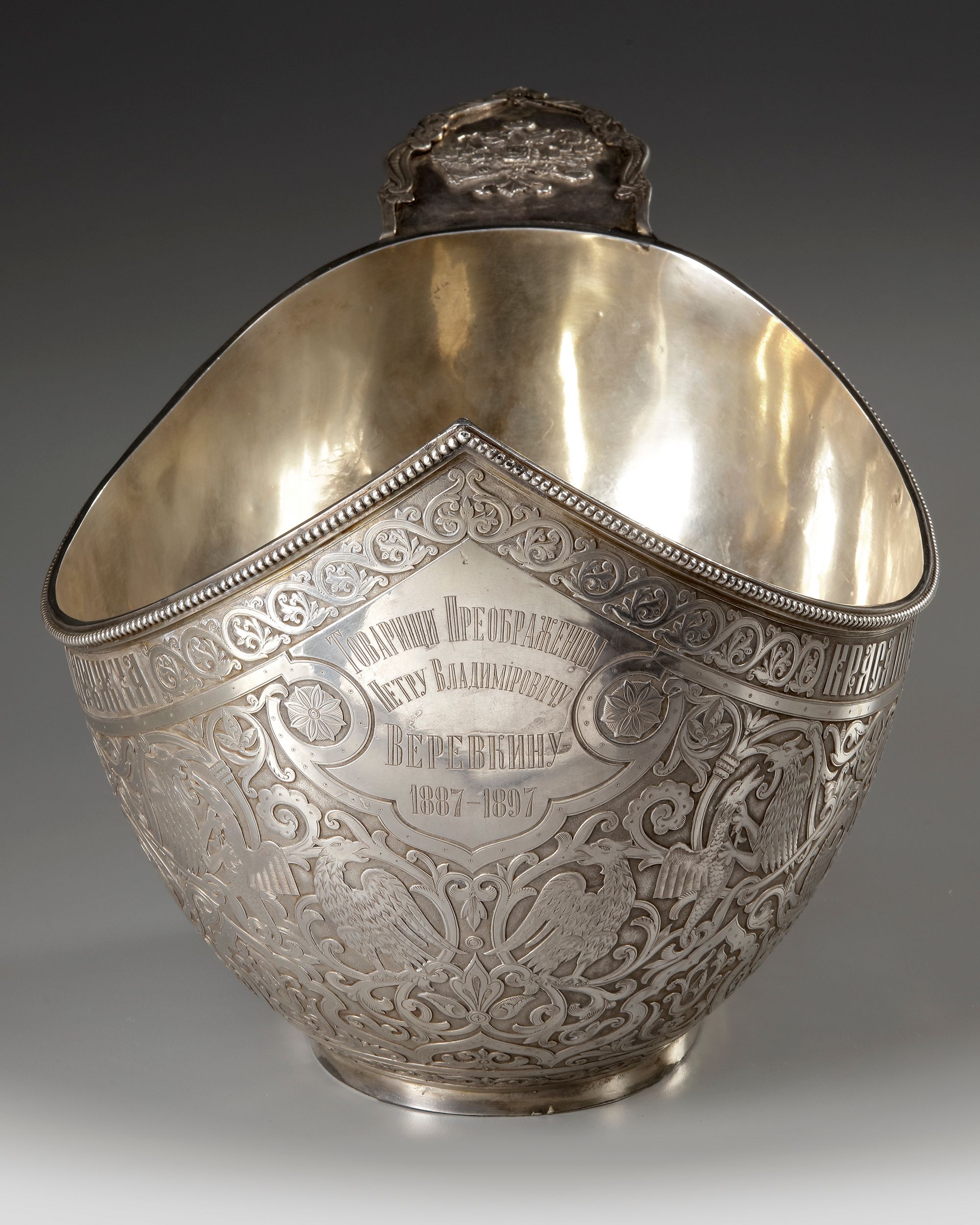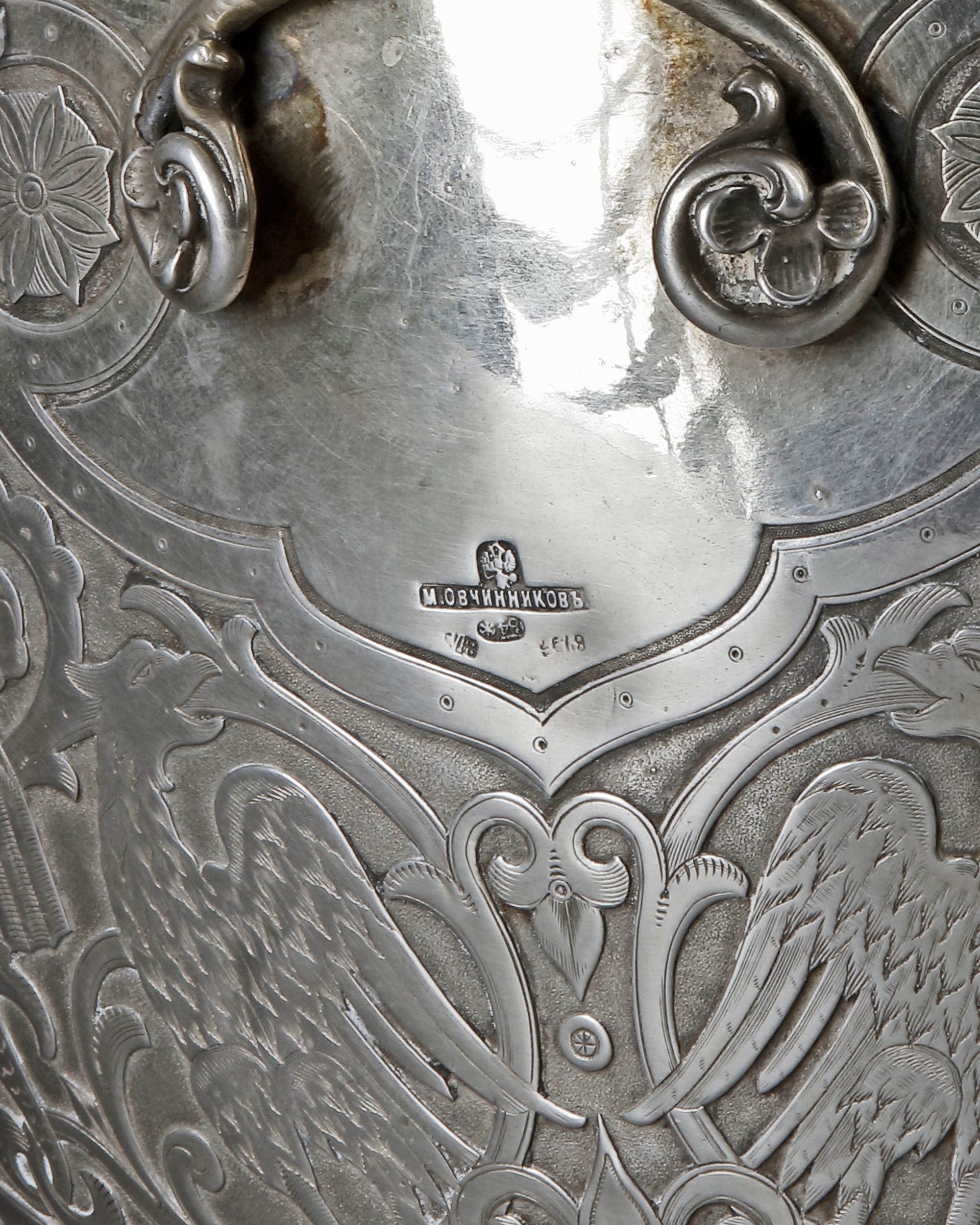 The bowl engraved with eagles. Cyrillic inscription and beaded rim signed ( OVICHINIKOV ) H 23 cm. D 40 cm.
