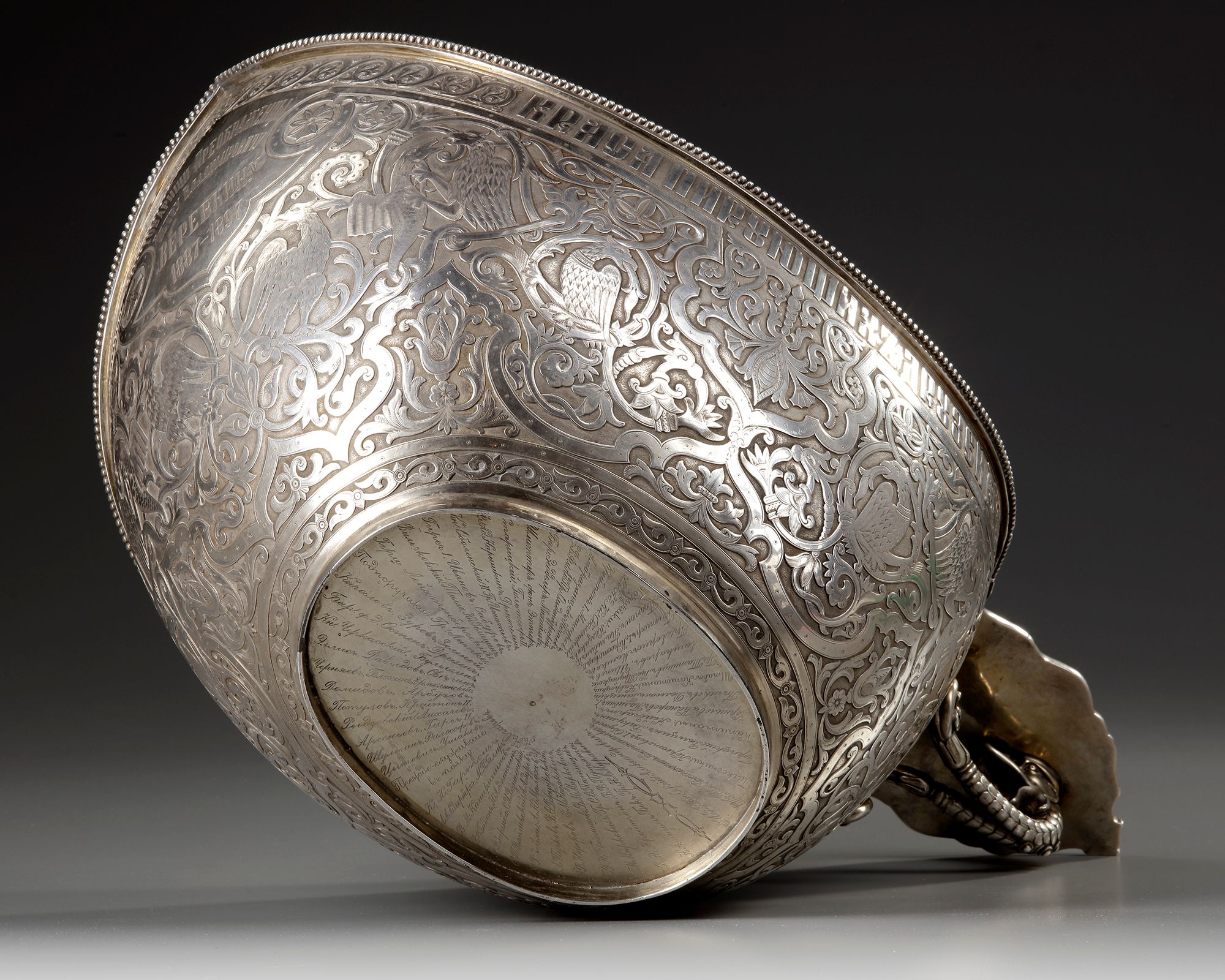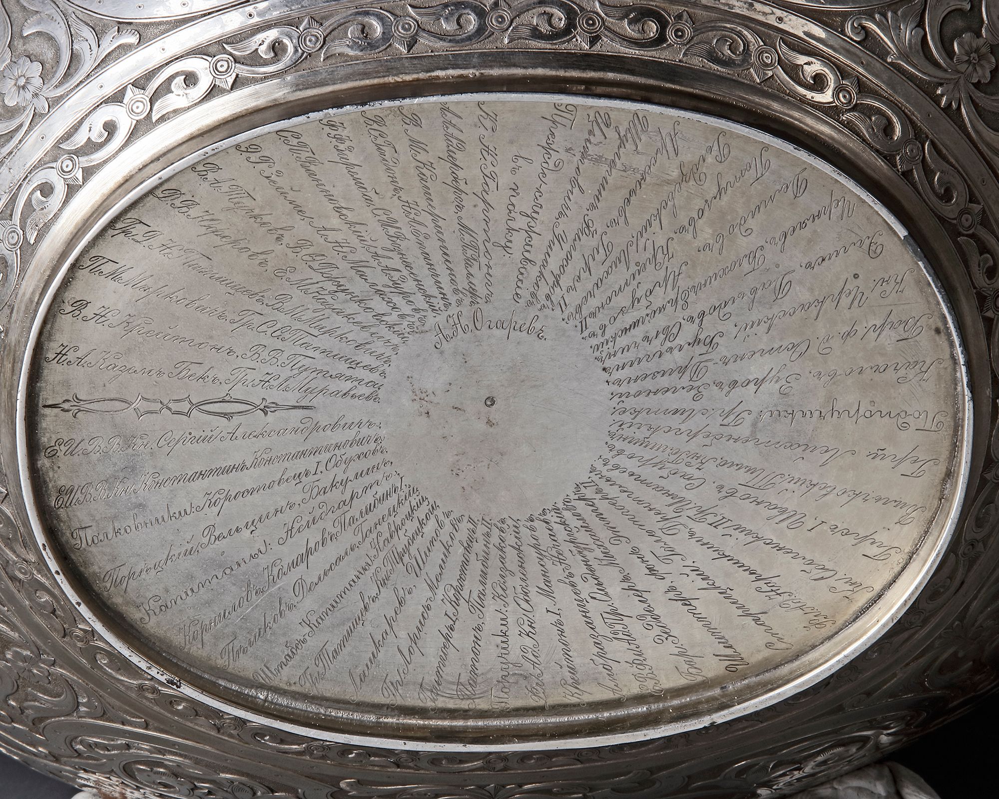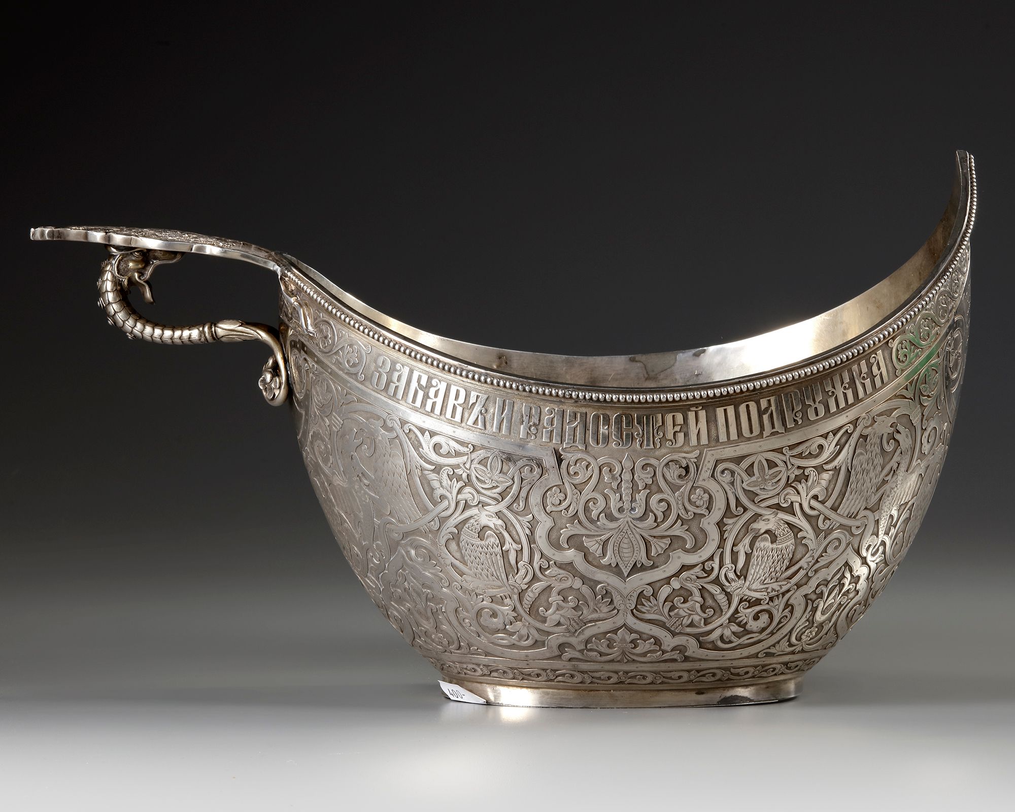 The bowl engraved with eagles. Cyrillic inscription and beaded rim signed ( OVICHINIKOV ) H 23 cm. D 40 cm.