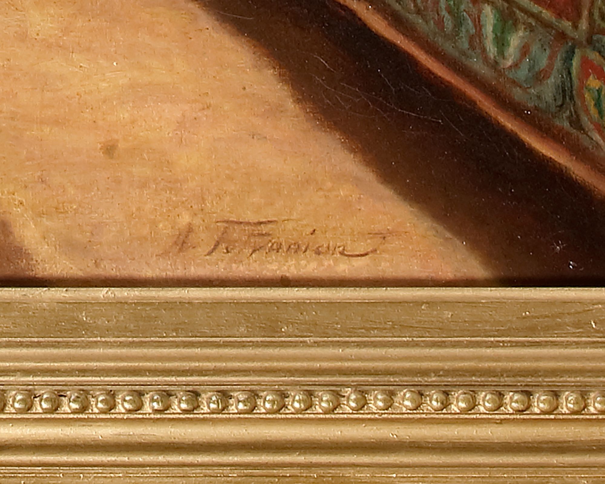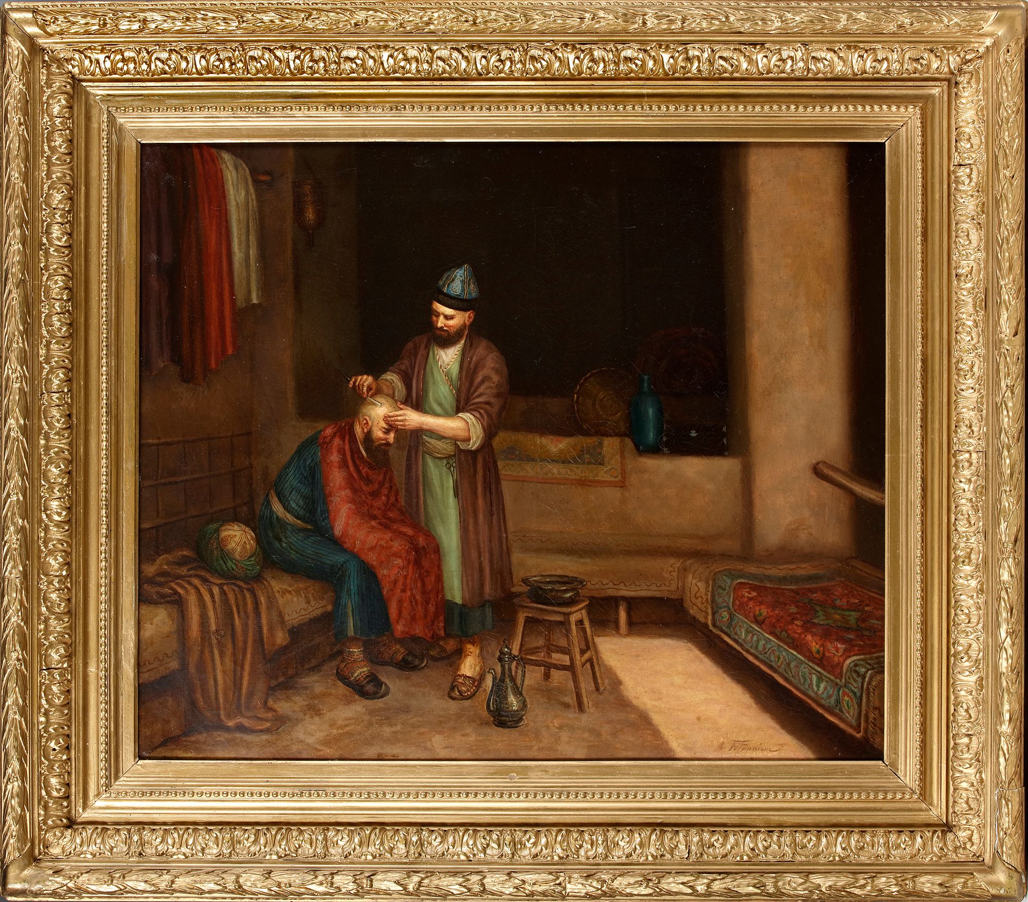 An orientalist oil on canvas painting representing an Ottoman oriental interior, depicting a barber shaving his client, wearing their traditional clothes. 'The Turkish barber"