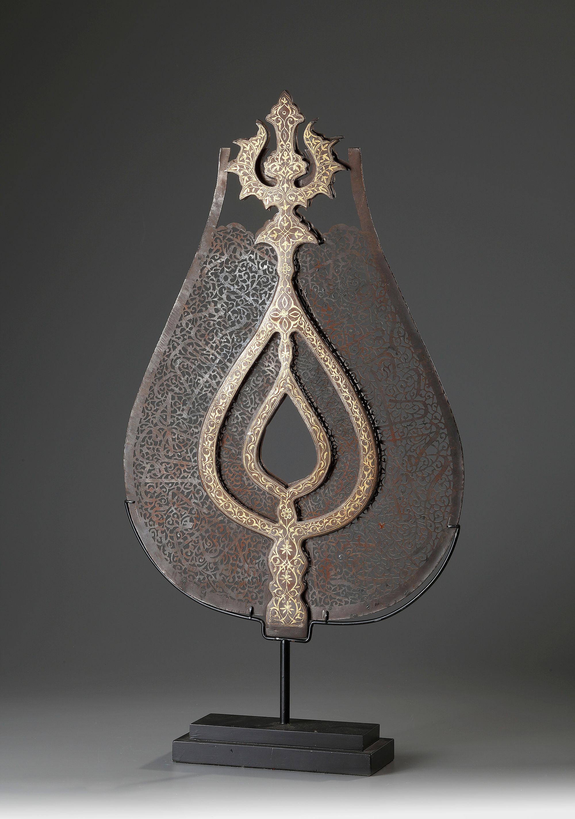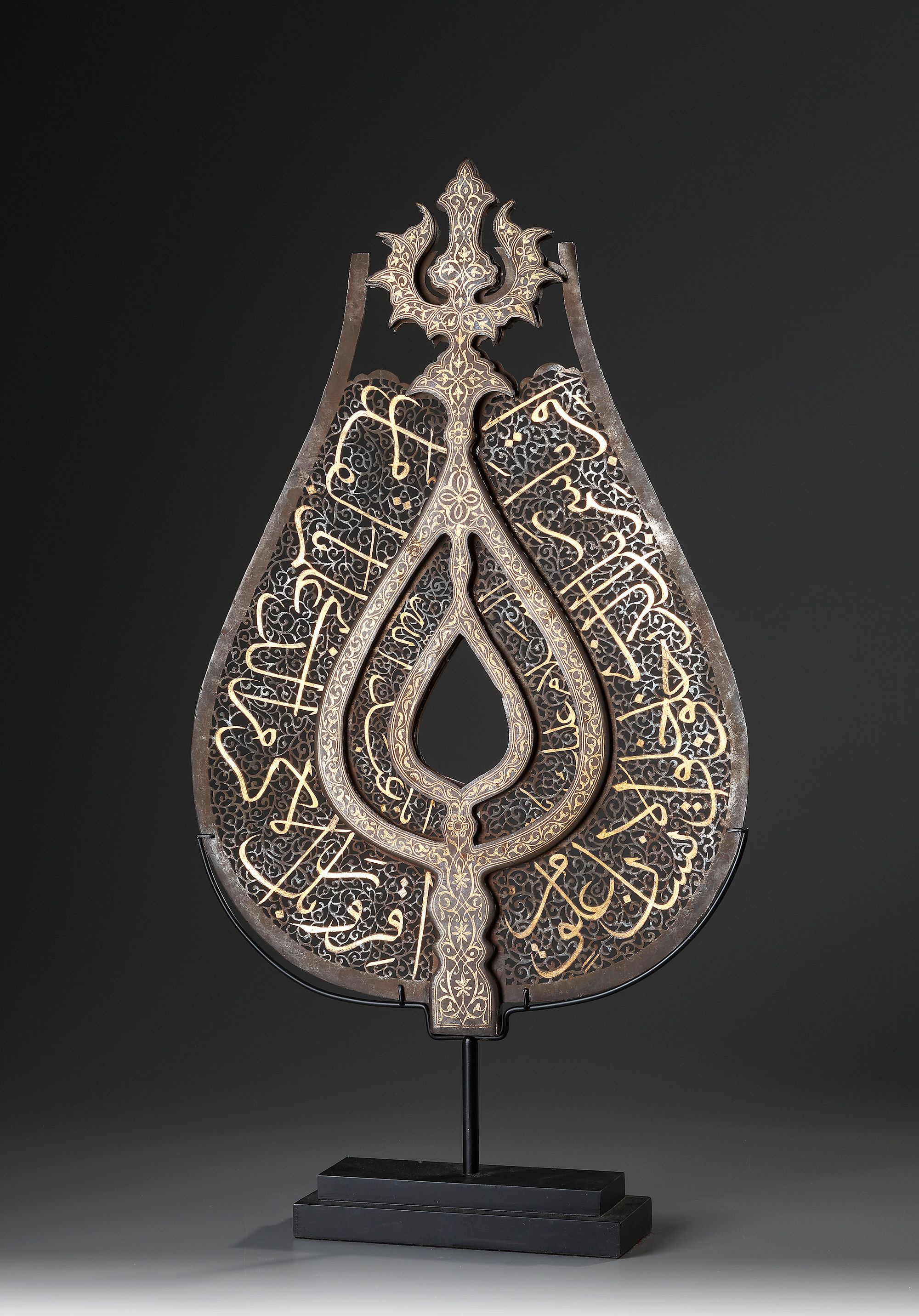 Pierced calligraphic steel of flat elongated leaf-shaped body, divided into an inner and outer calligraphic register Inscriptions: parts of the Quran XCVI Sura alalaq