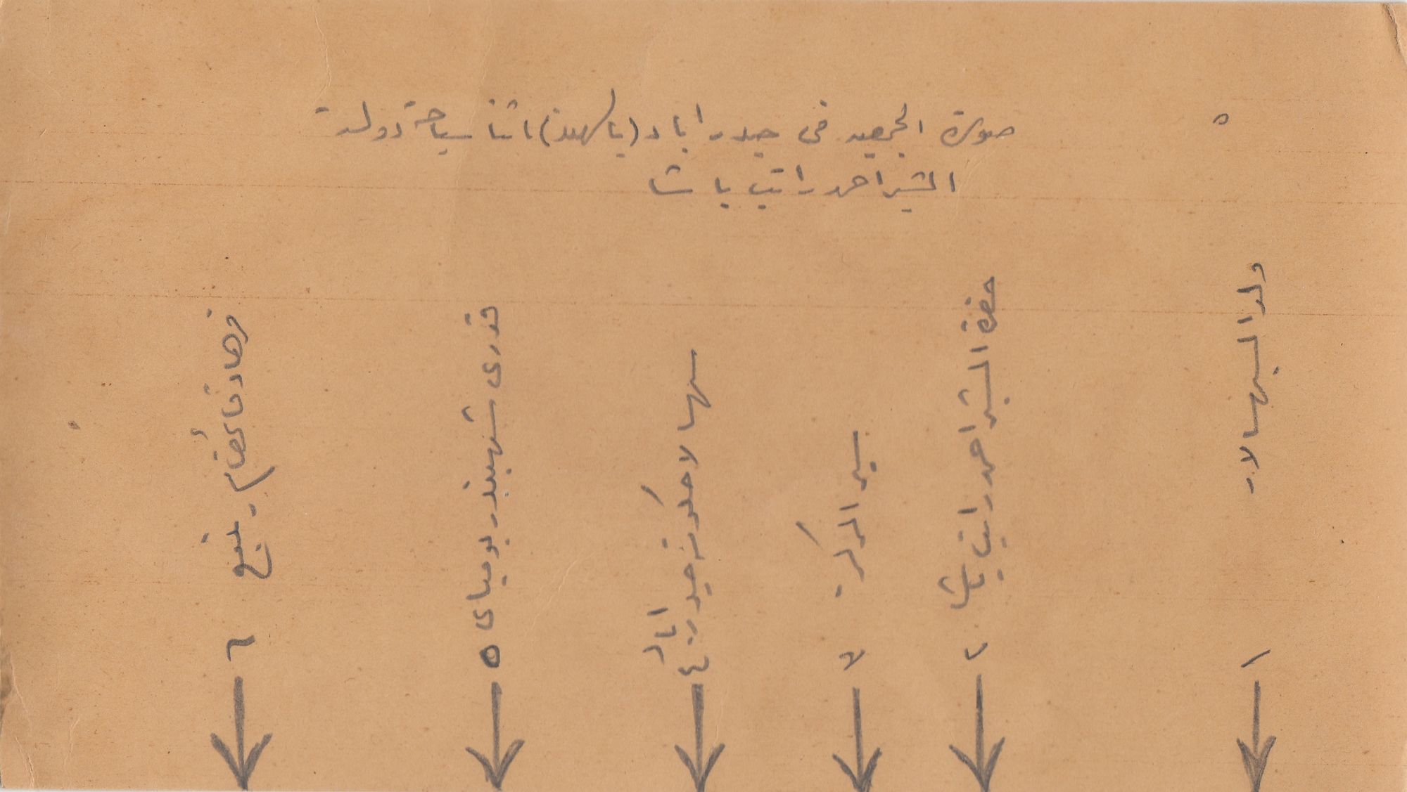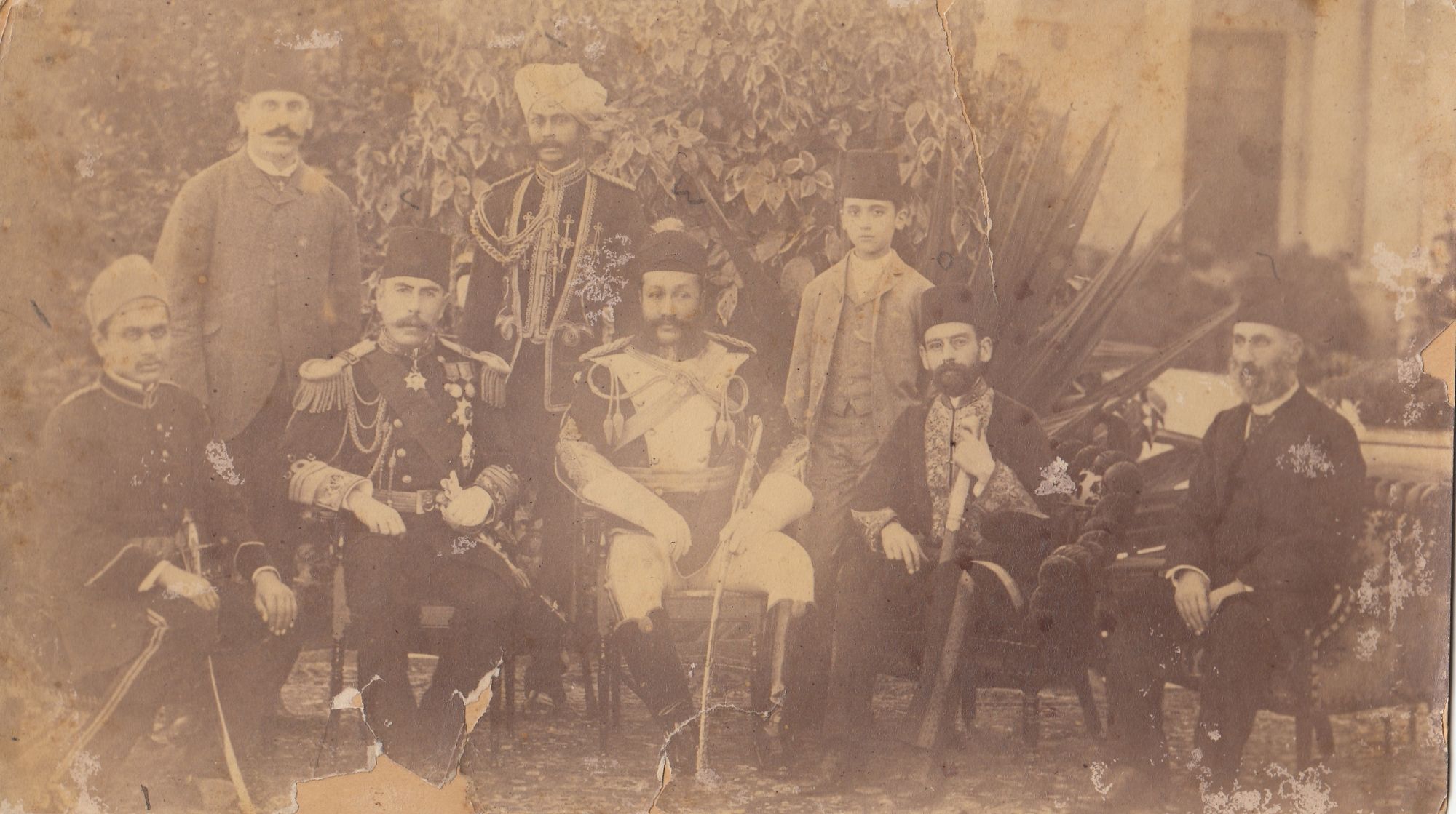 A photograph on thick paper. With members of the Committee of Union and Progress (CUP), Marshal Ahmed Ratib Pasha (Governor of Hijaz), and Mayer of Yanbu Farhad Pasha, as well as Qadri Pasha (a Turkish merchant in Mumbai), during their travel to India and meeting Sahala, the Governor of Hyderabad. 21 by 11.5 cm.