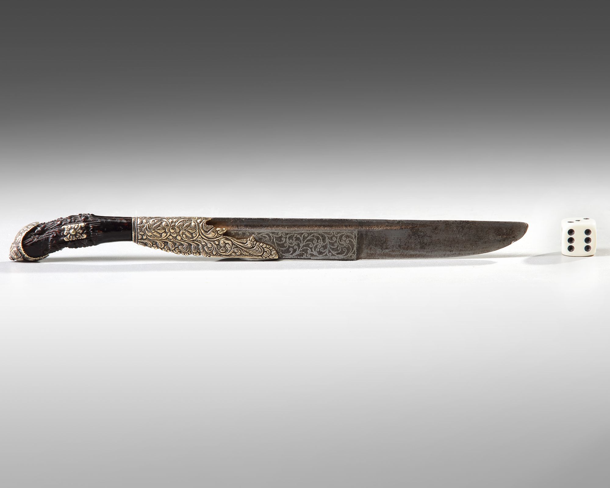 With single-edged steel blade with fuller along the back edge, the forte covered with cast and engraved brass panels decorated with dense floral spray, the blade below the forte inlaid with silver vegetal scrolls, the carved wood hilt with brass mounts and pommel-cap, the scabbard mounted on wood and covered with a thin metal sheet now oxidised, with an extra compartment possibly once filled with another knife,