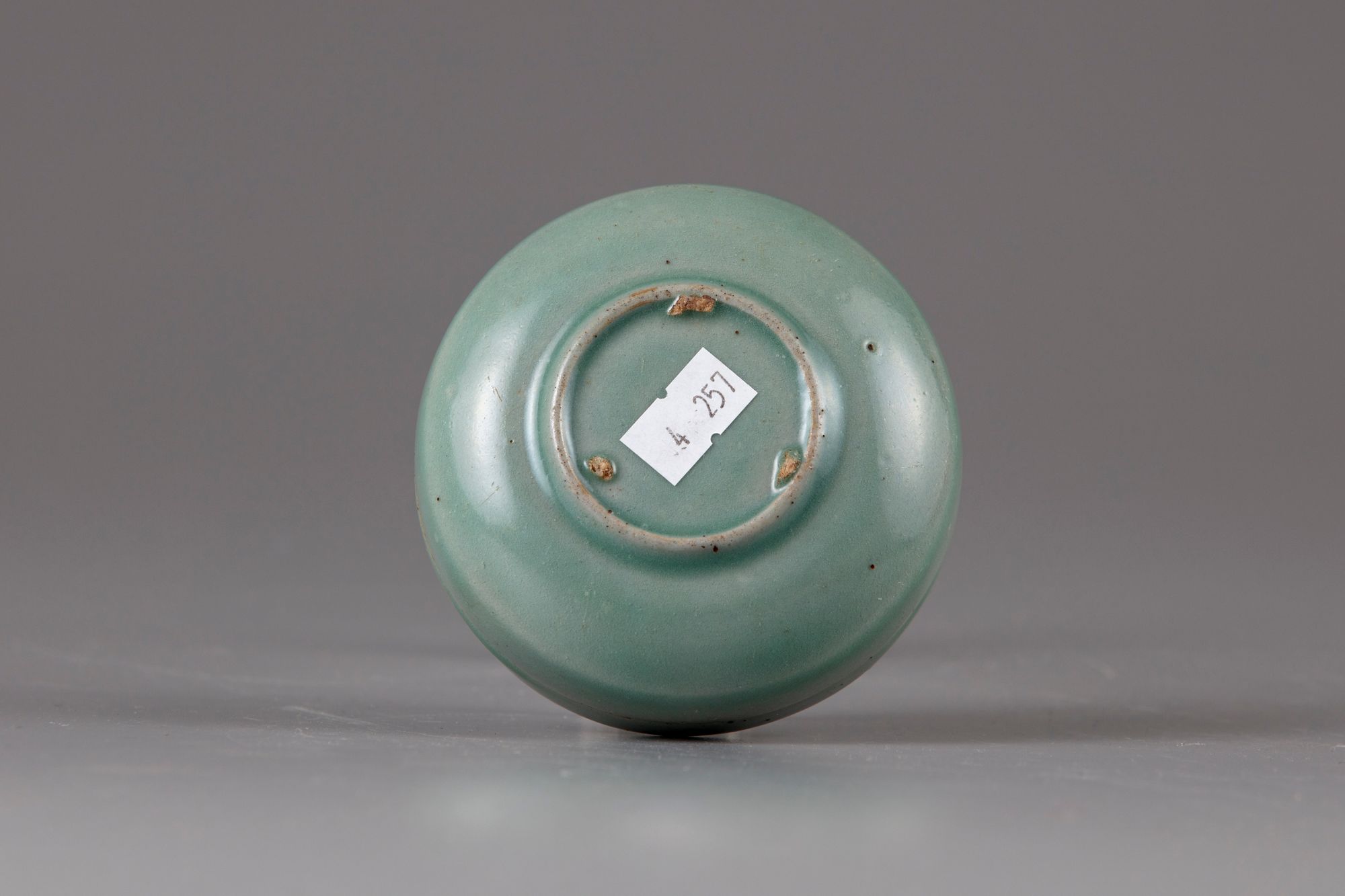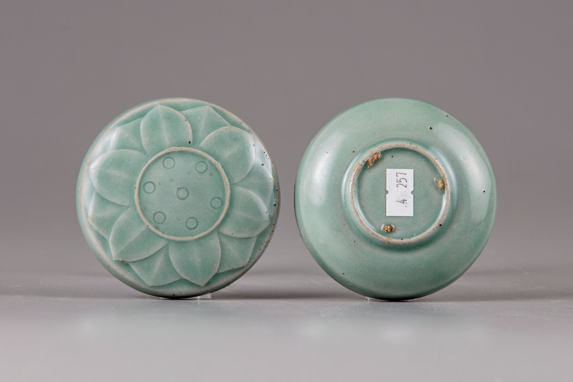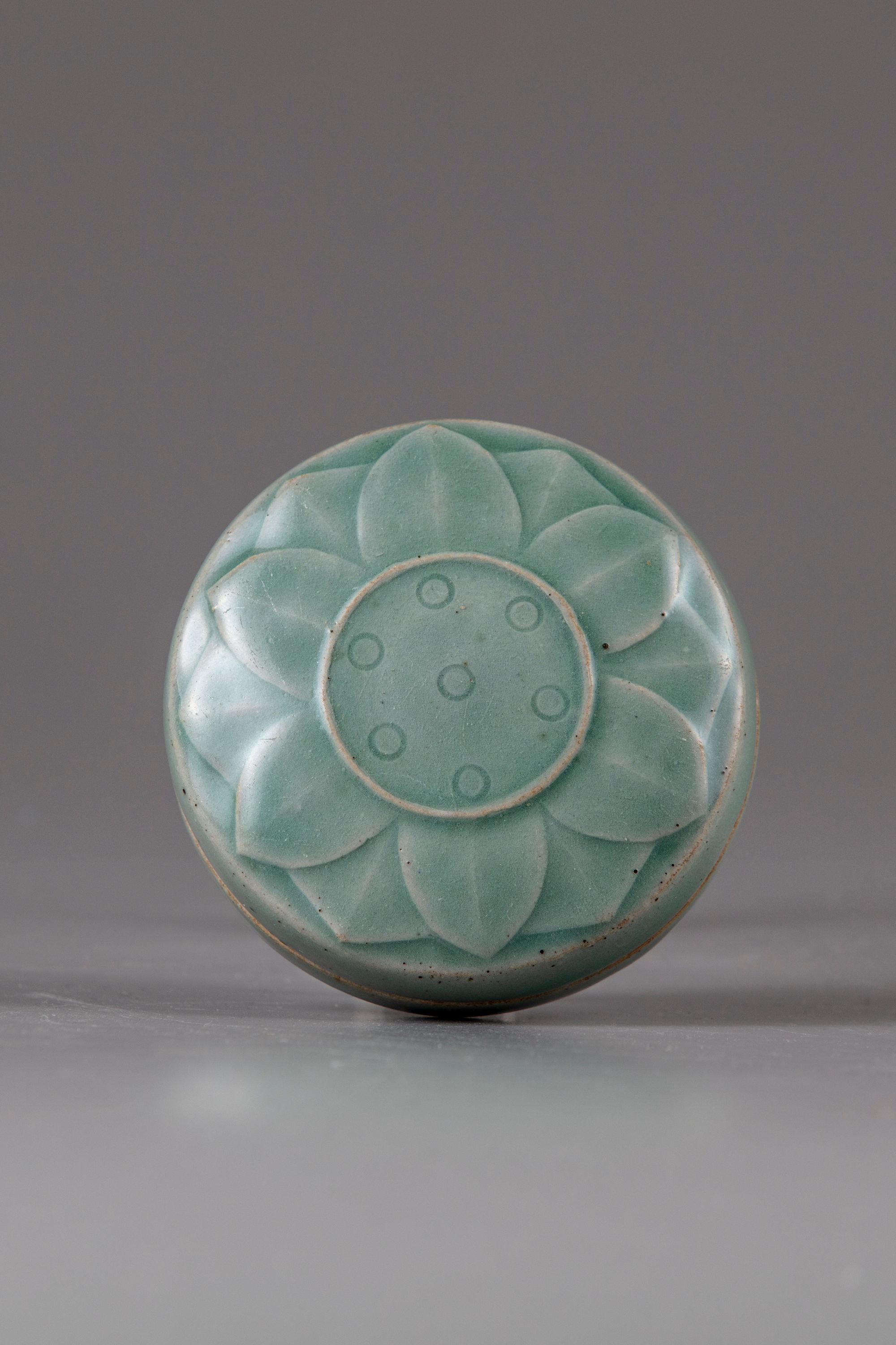 The circular cover is decorated with a flower head in low relief surrounded by leaves, the box standing on a small foot ring