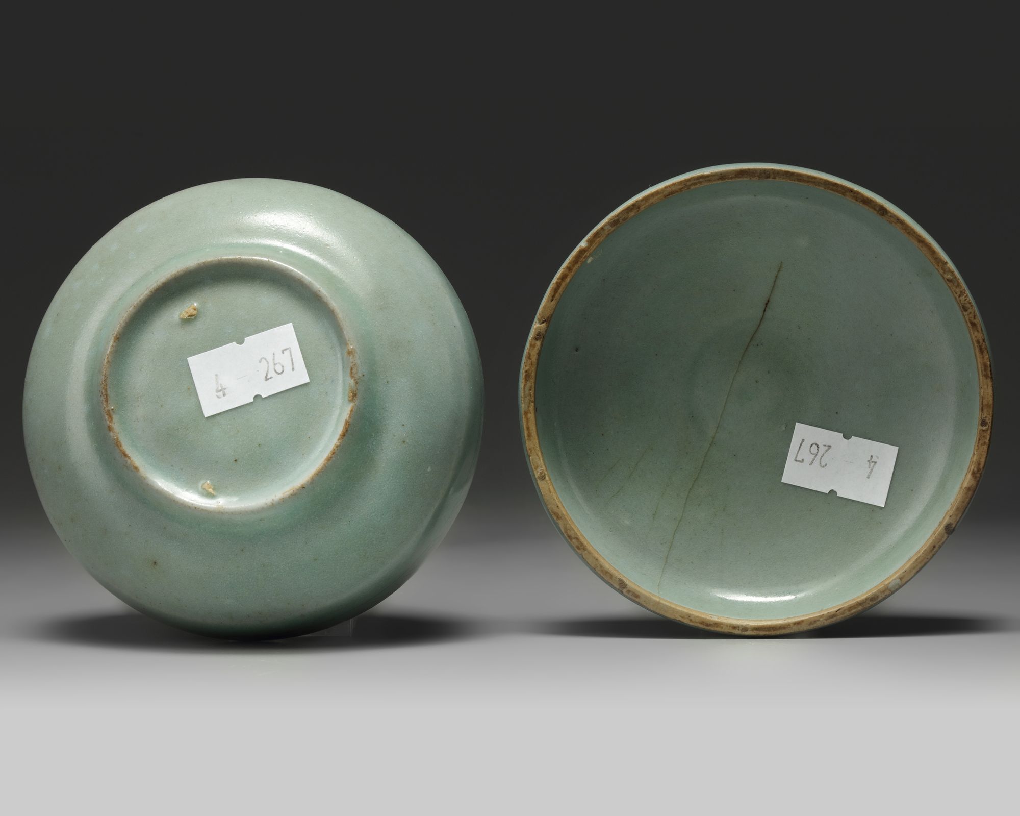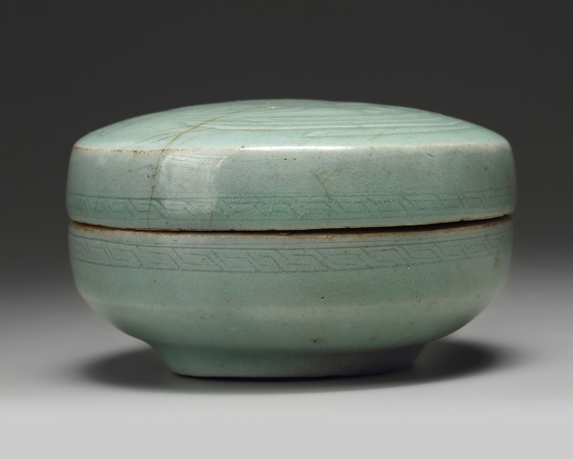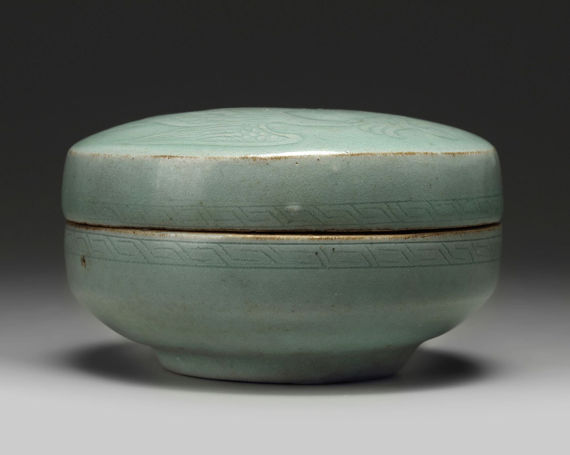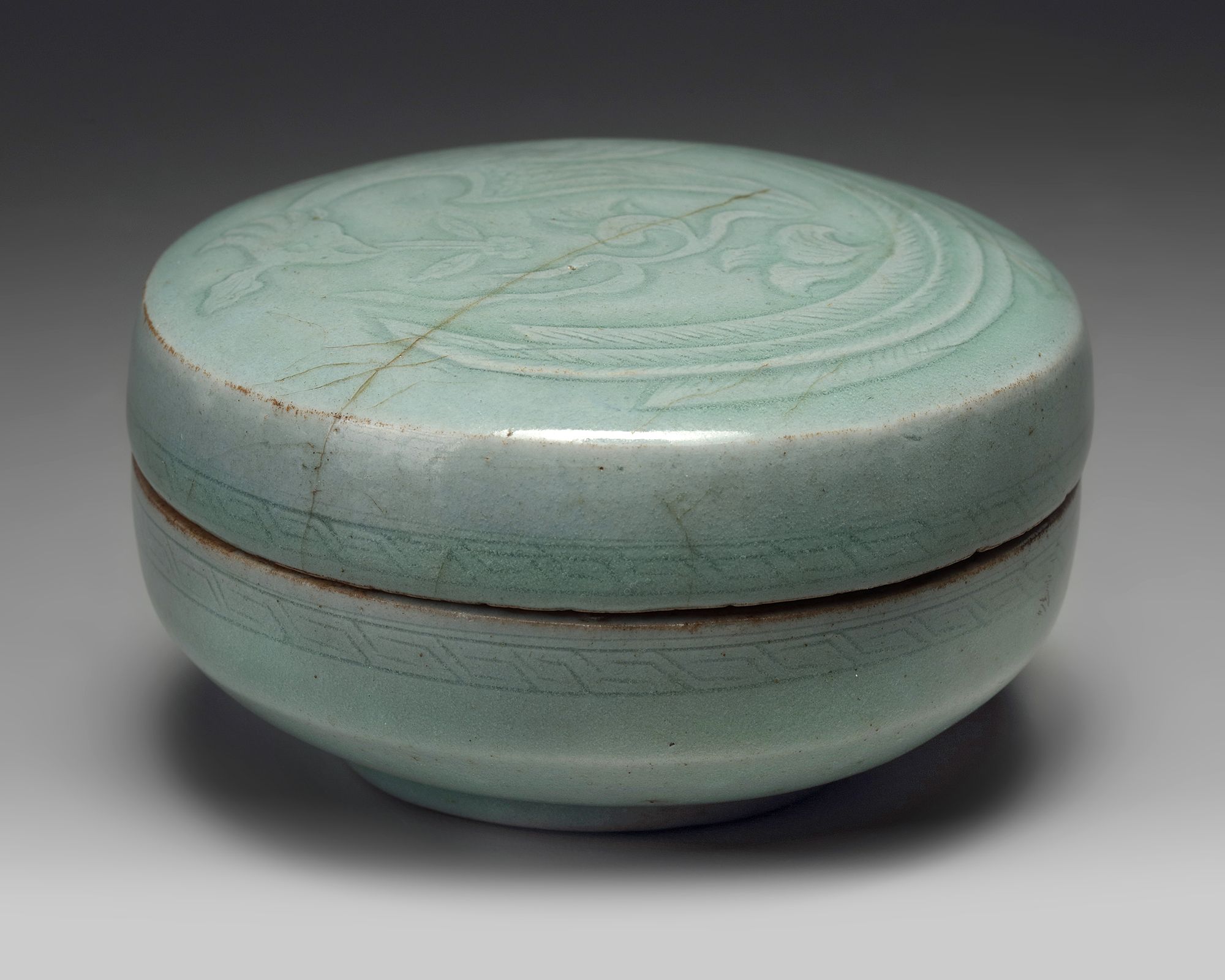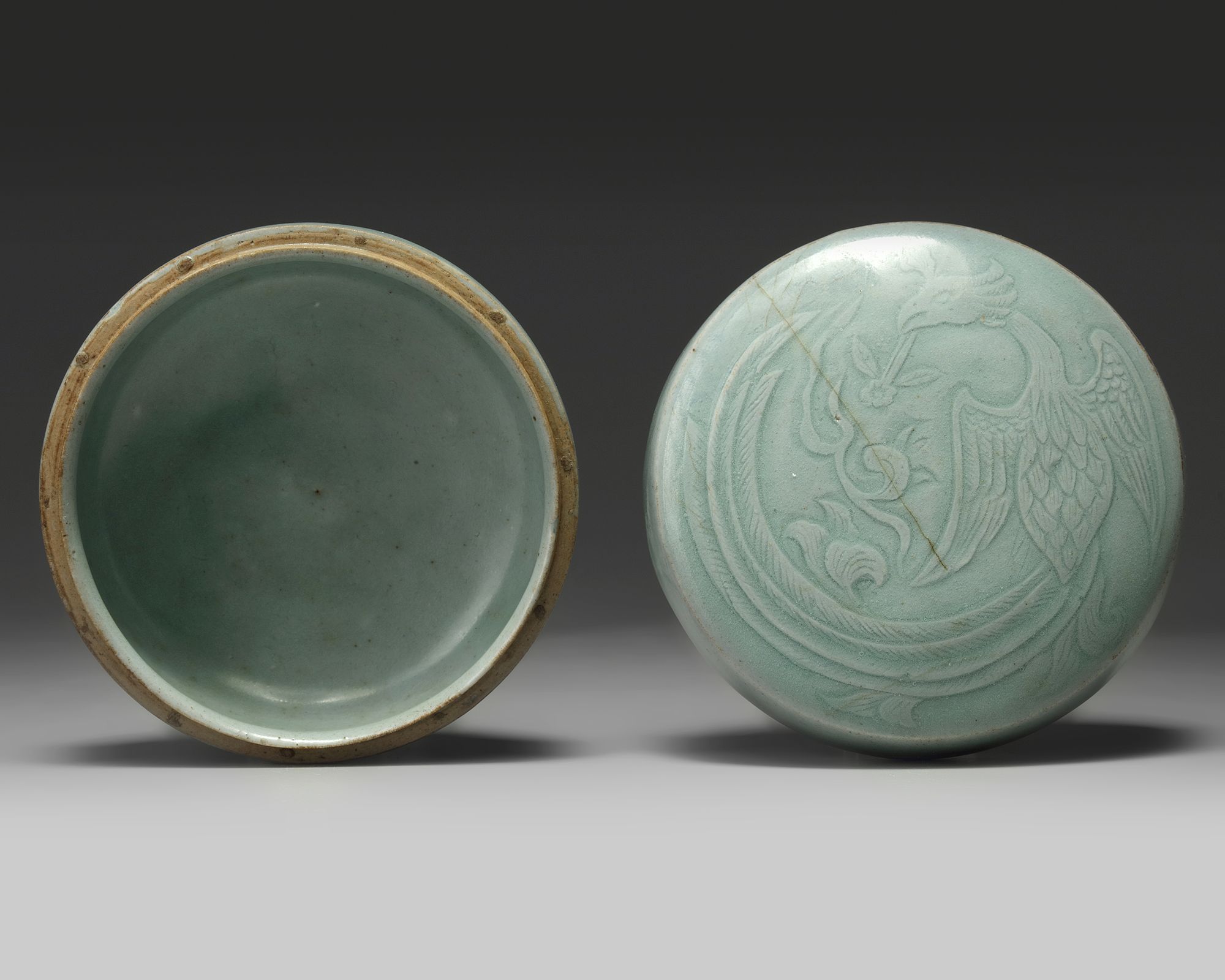 The upper surface of the cover is well-carved with a roundel of a phoenix holding a flower spray. The box is covered overall with a translucent bluish-celadon glaze suffused with fine crackles.