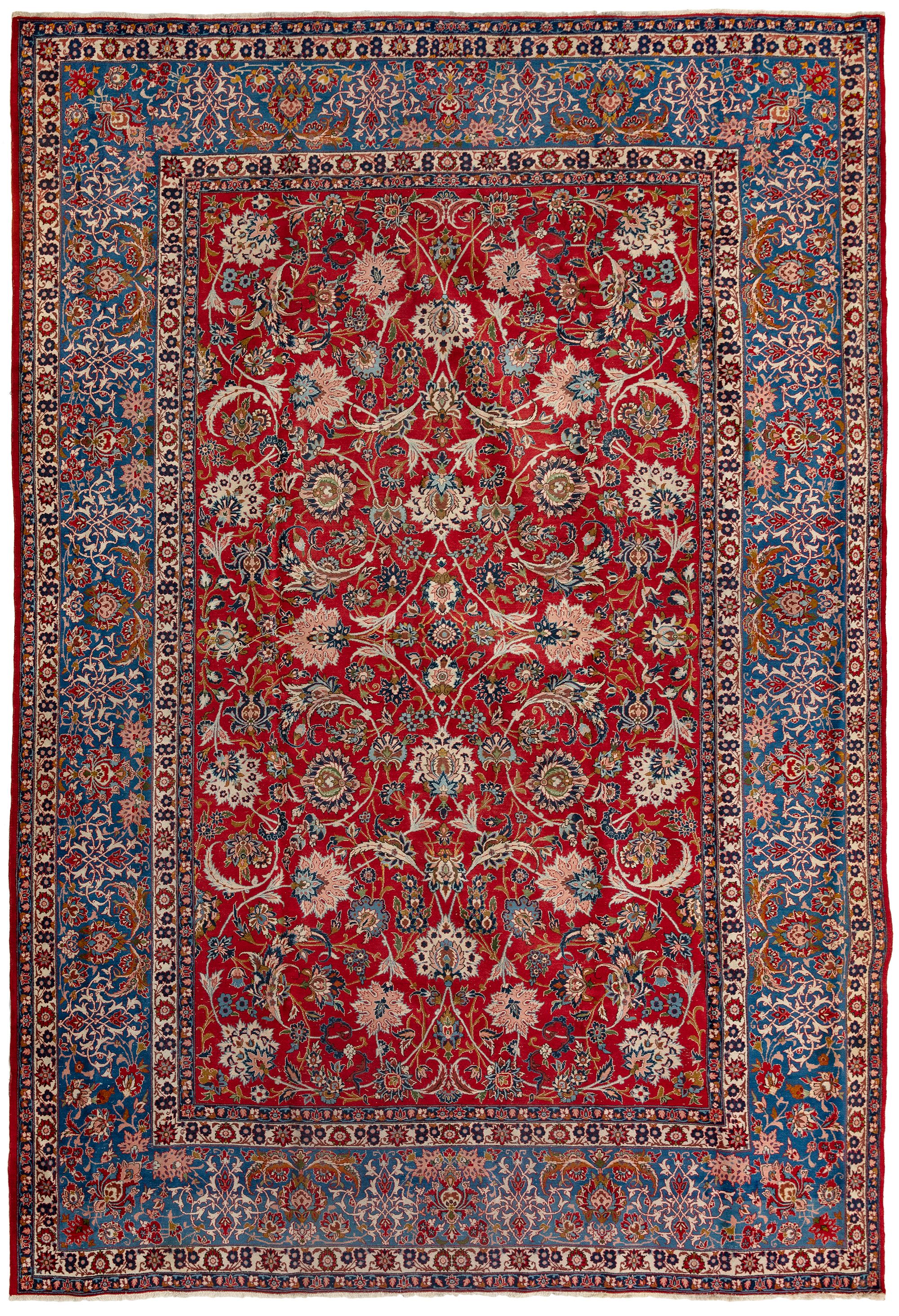 A large Persian carpet filled with flowers and colorful tree leaves on a beautiful red floor. 440 by 310 cm.