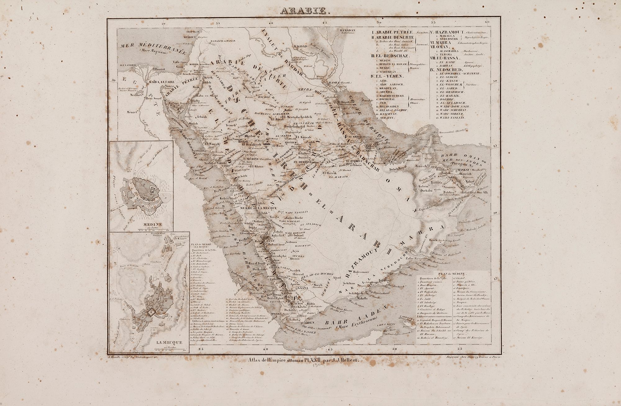 A RARE NON COLORED PRINTED FRENCH MAP OF THE ARABIC WORLD DURING THE OTTOMAN EMPIRE (ARABIA PENINSULA) BY J.J. HELLERT, DATED 1850