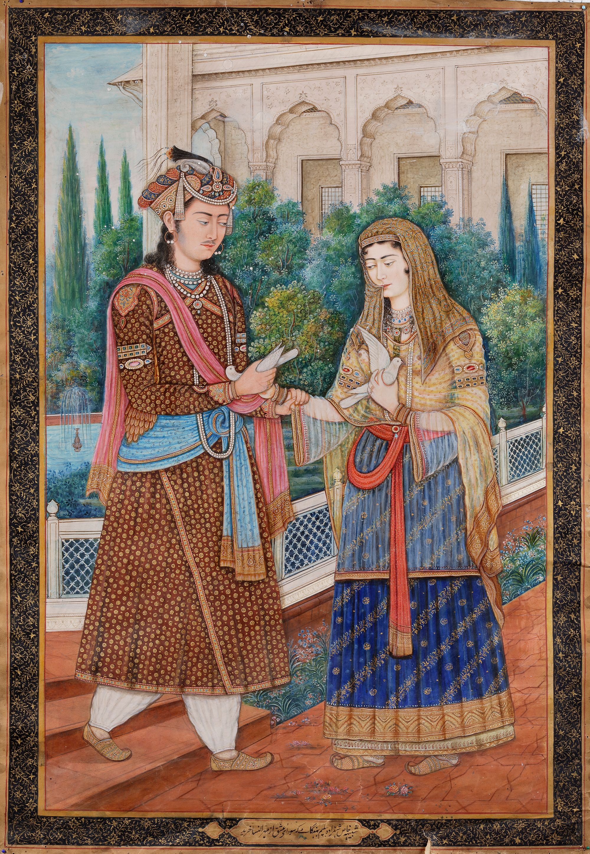 An Indian watercolor of a royal couple, each holding a dove within a garden and architectural setting.