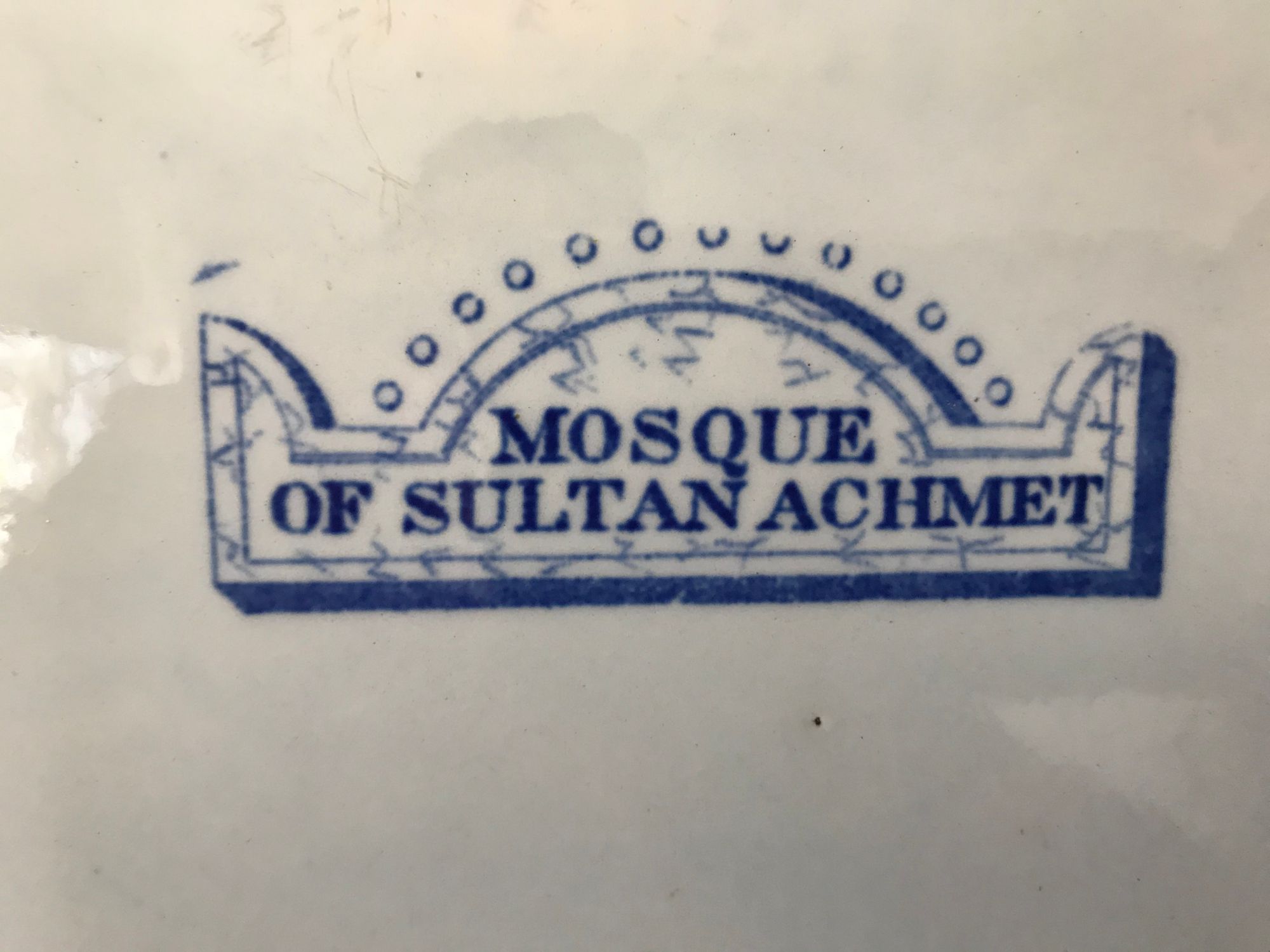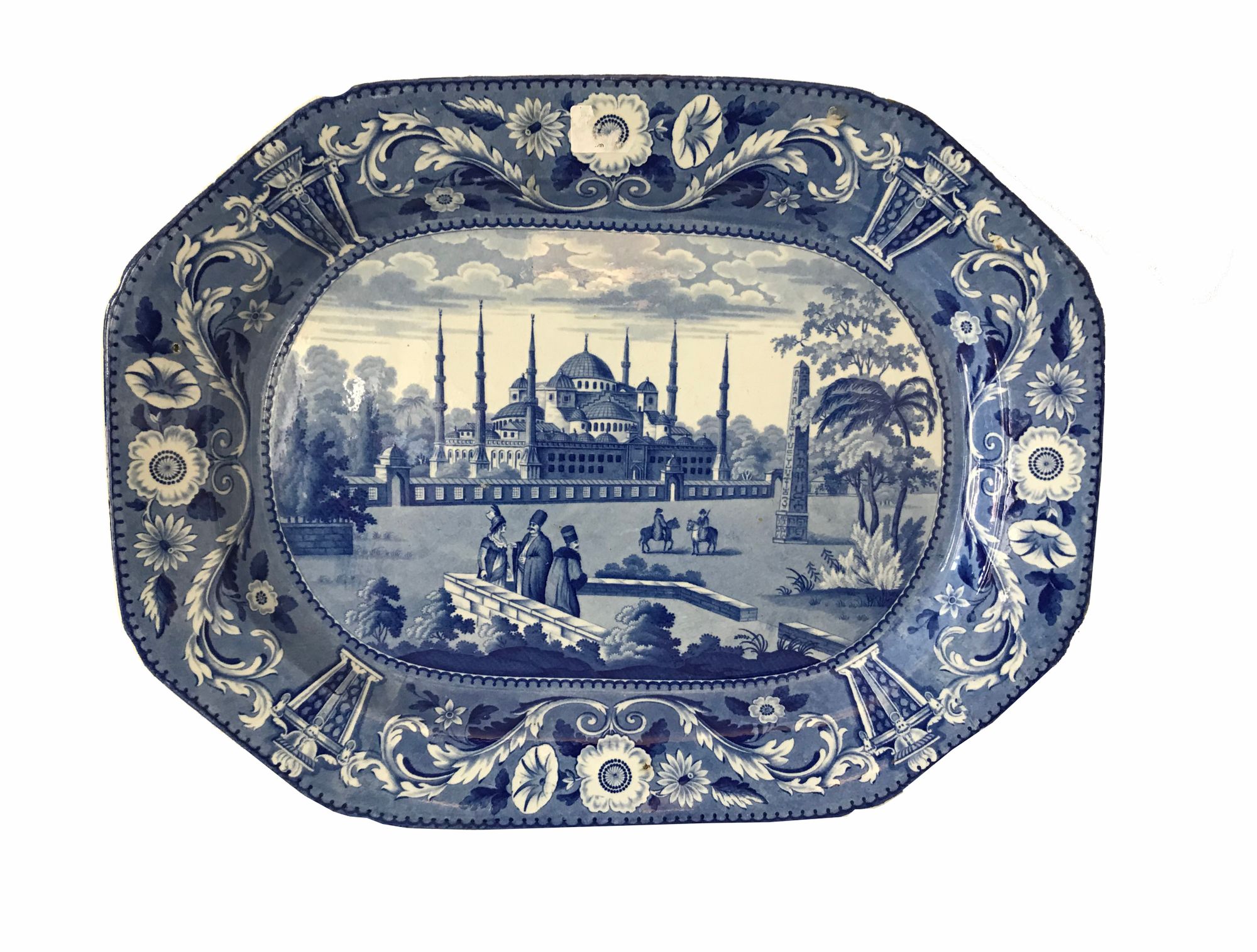A Don Pottery blue and white transfer ware charger 1st half 19th century, from the Ottoman Empire series, printed with figures standing on a balcony overlooking a palace with parkland between, with figures on horseback before an obelisk, within a formal border, titled 'Mosque of Sultan Achmet', 47.6 cm.