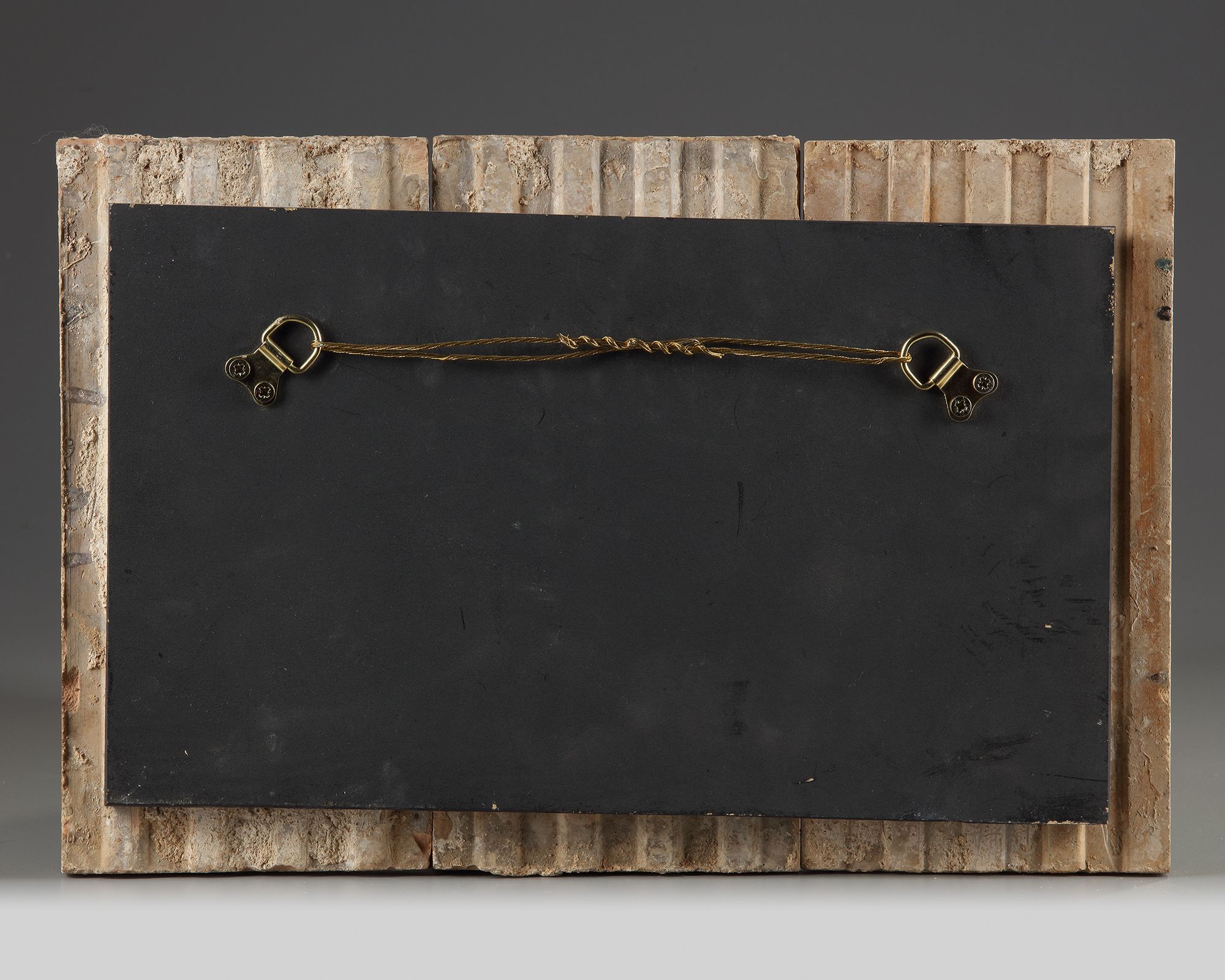 The tiles are decorated with a mustard yellow, green, blue and brown motifs. Each tile with a height of 28 cm and a width of 14 cm.
