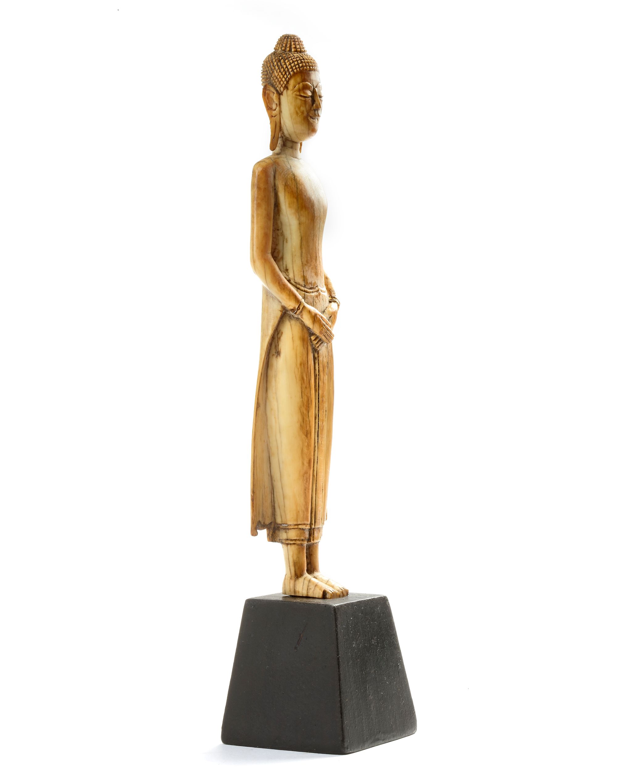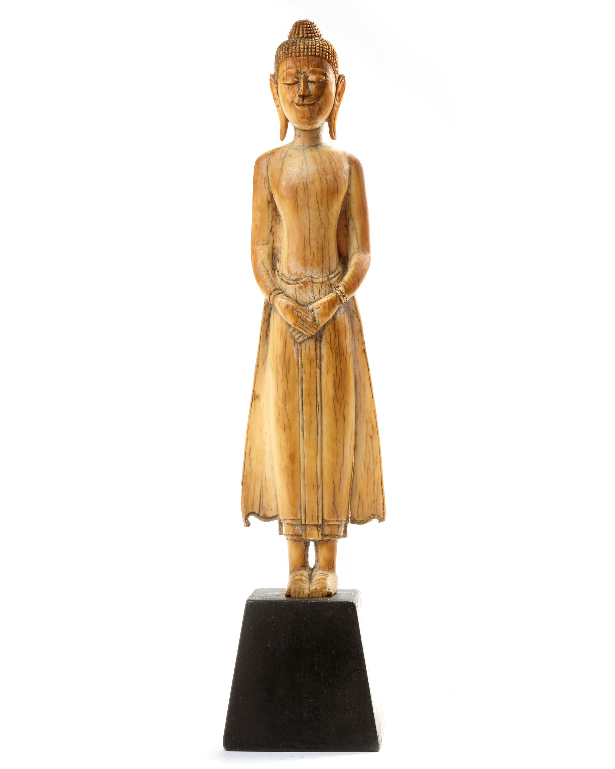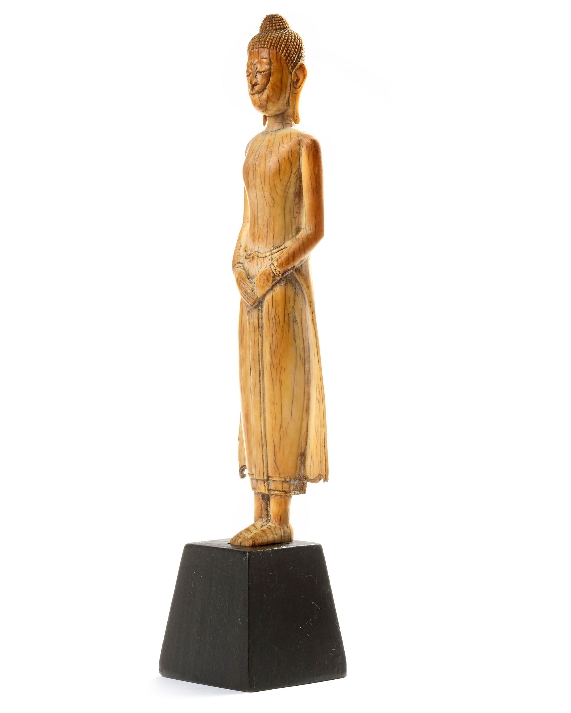 A Thai figure, of ivory an carved standing, wearing long robes wwith elongated ears, the serene face with downcast eyes and meditative expression. 19 cm.