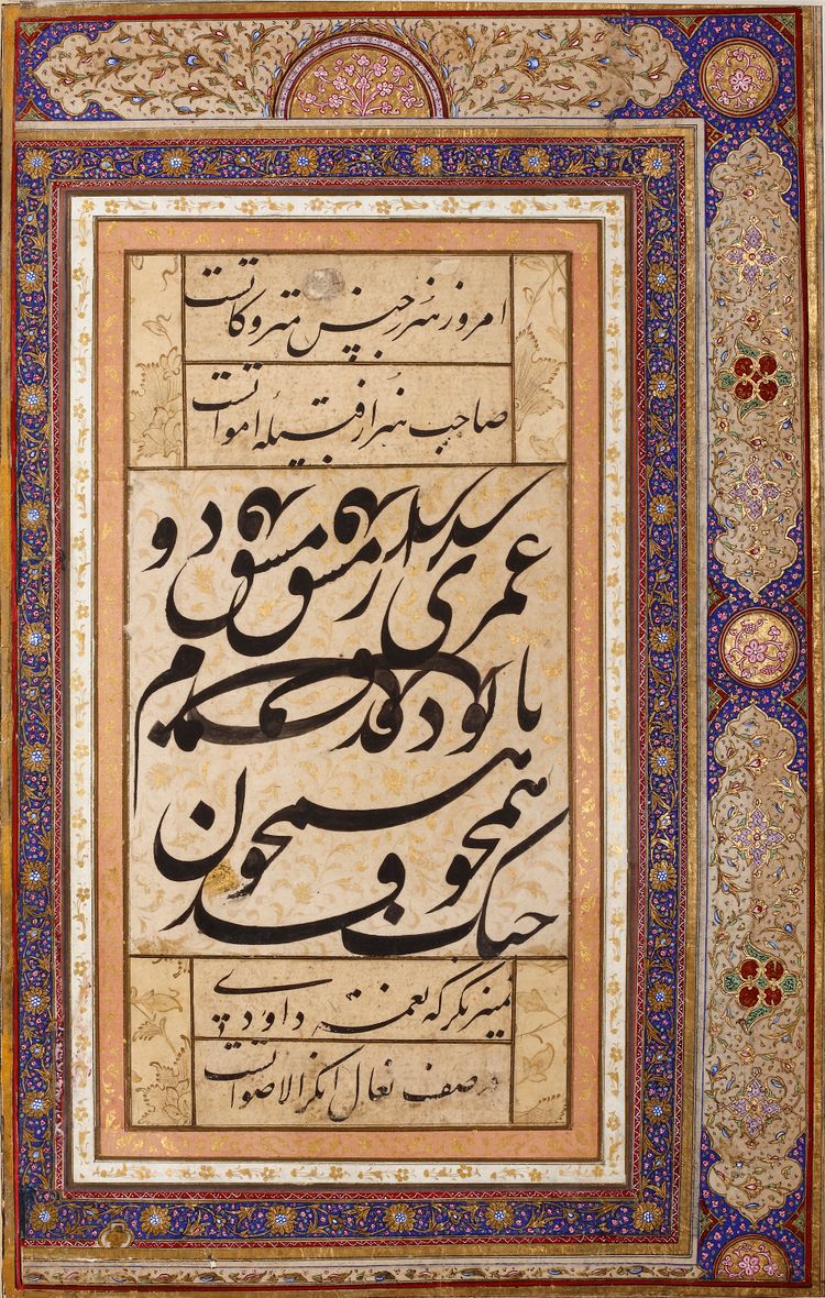 The central panel, in the form of practice writing (siyah mashq), is a famous poem by the celebrated 16th Century nasta'liq calligrapher Mir 'Ali Haravi. The couplets above and below (poet unidentified) are most probably excised from a 16th-17th Century manuscript.