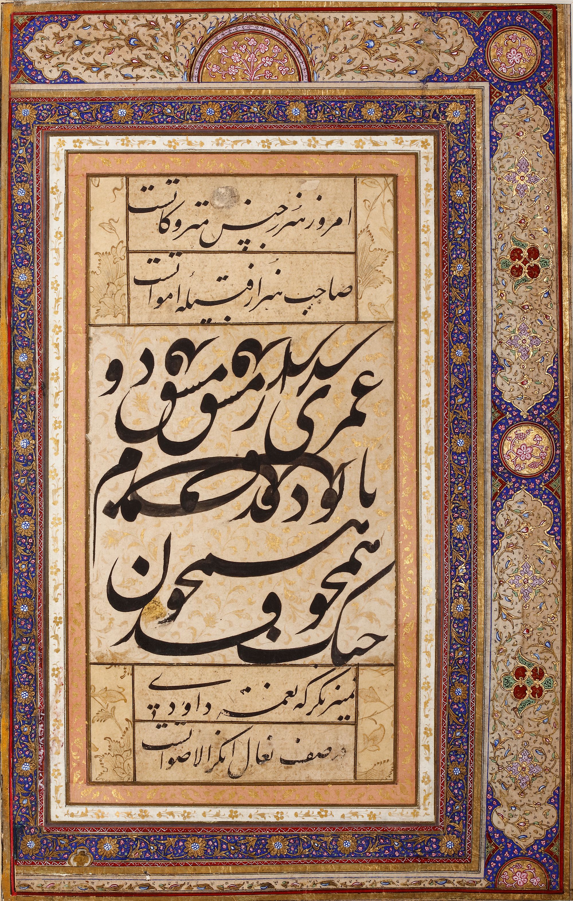 Persian manuscript on paper, the central panel consisting of siyah mashq in large nastaliq script in black ink on a gold-decorated ground, separate panels containing couplets in nastaLiq script above and below this, laid down on an album page with profusely and finely decorated borders in colors and gold.