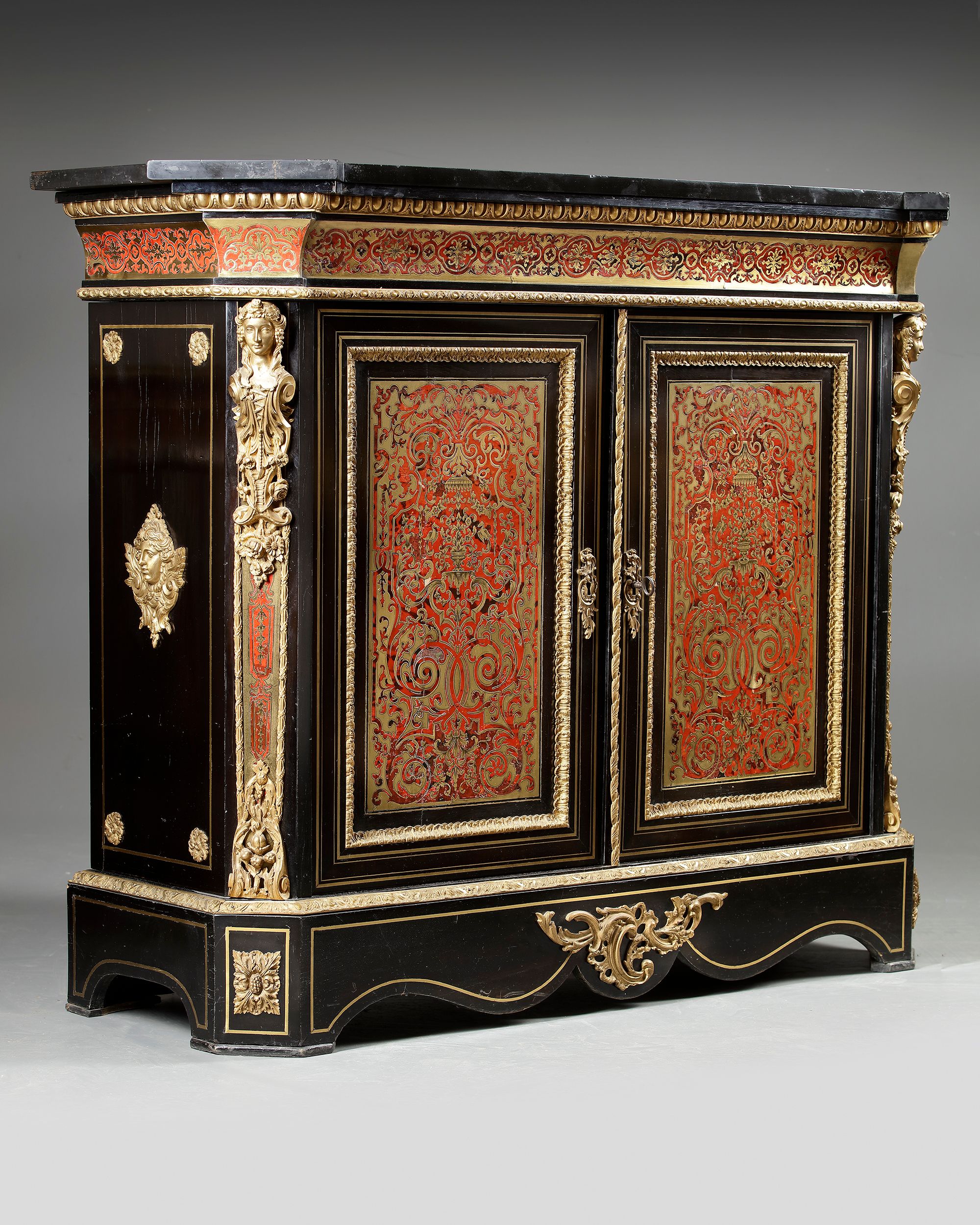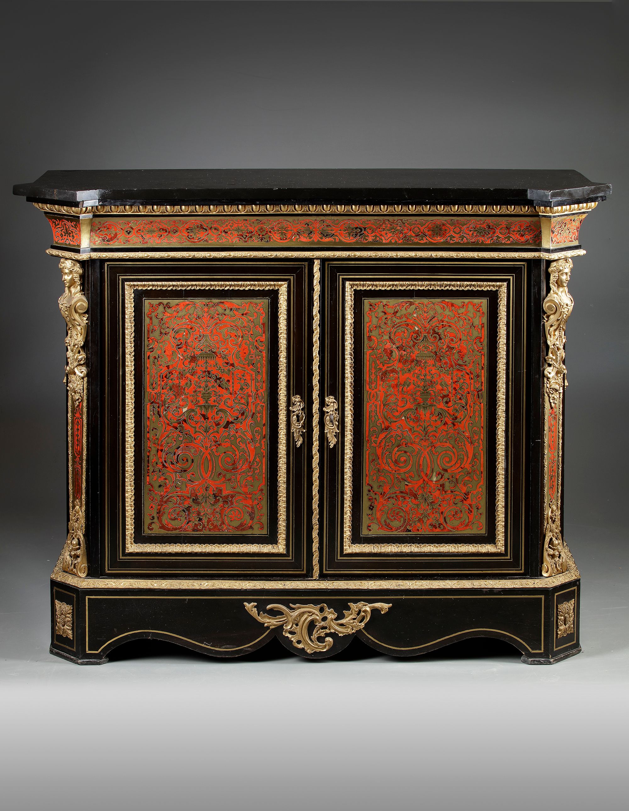 Cabinet in Boulle marqueterie with two doors in red tortoiseshell and brass on blackened natural wood. The rounded uprights are embellished with two busts of a woman as well as various bronze ornamentation, black marble top, Napoleon III period.