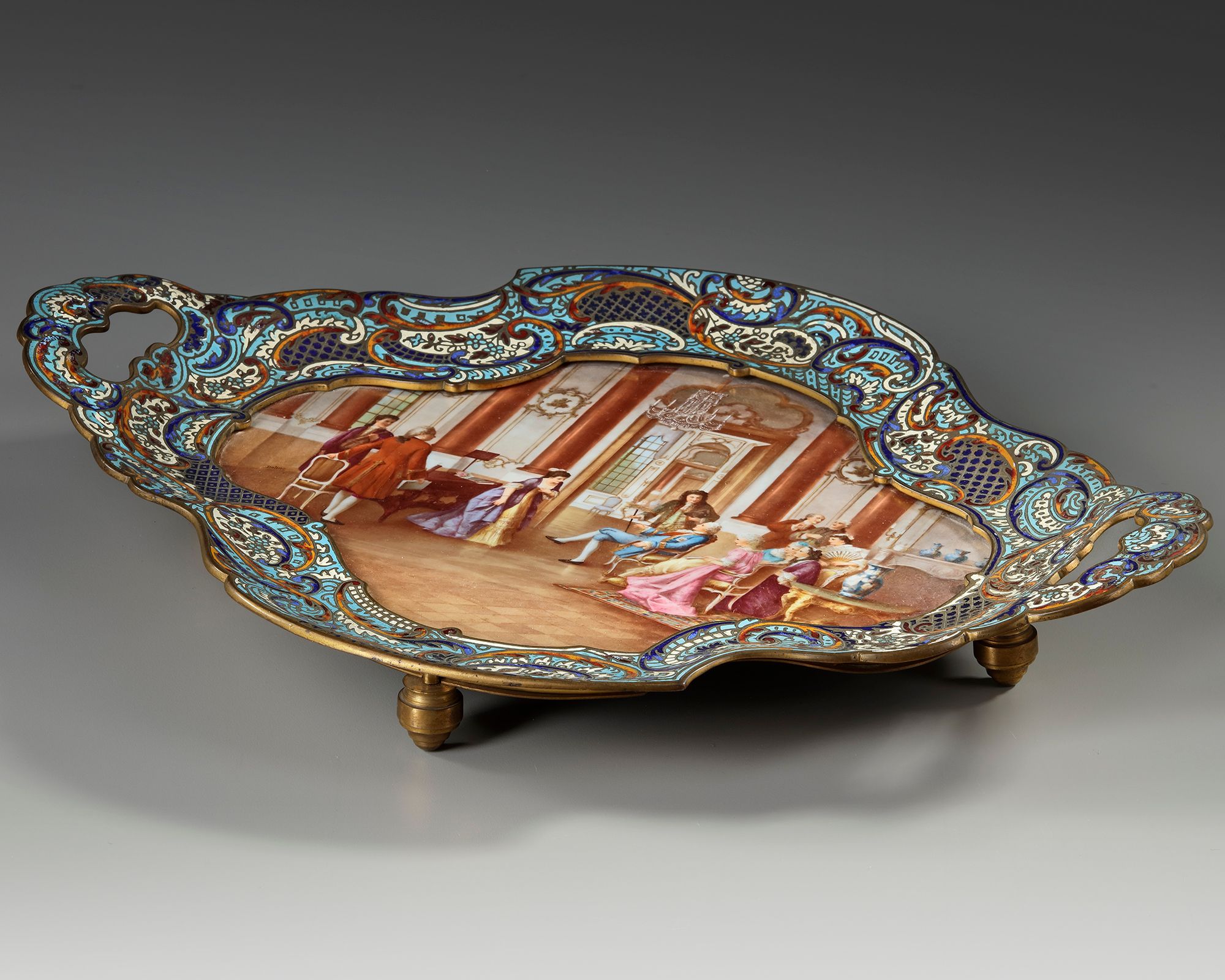 Beautiful 19th century French champlevé enamel, gilt bronze, porcelain plaque, dresser stand with a hand painted romantic scene, on four feet.