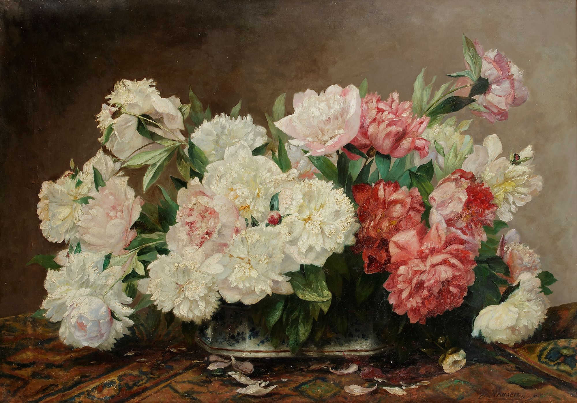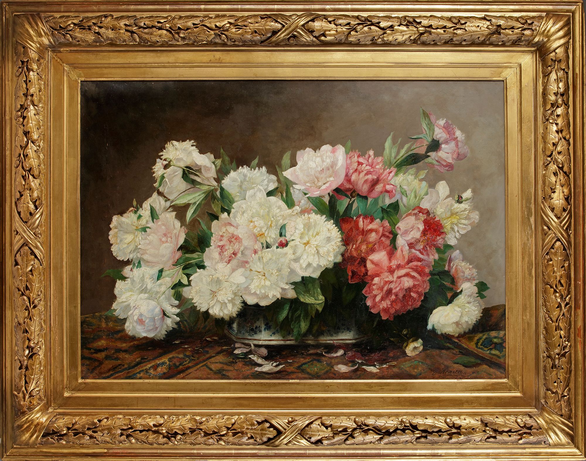A large painting, oil on canvas, representing a bouquet of peonies flowers in a large jardiniere in white and blue porcelain .