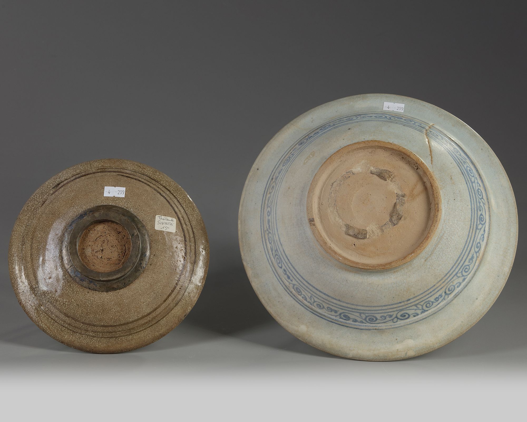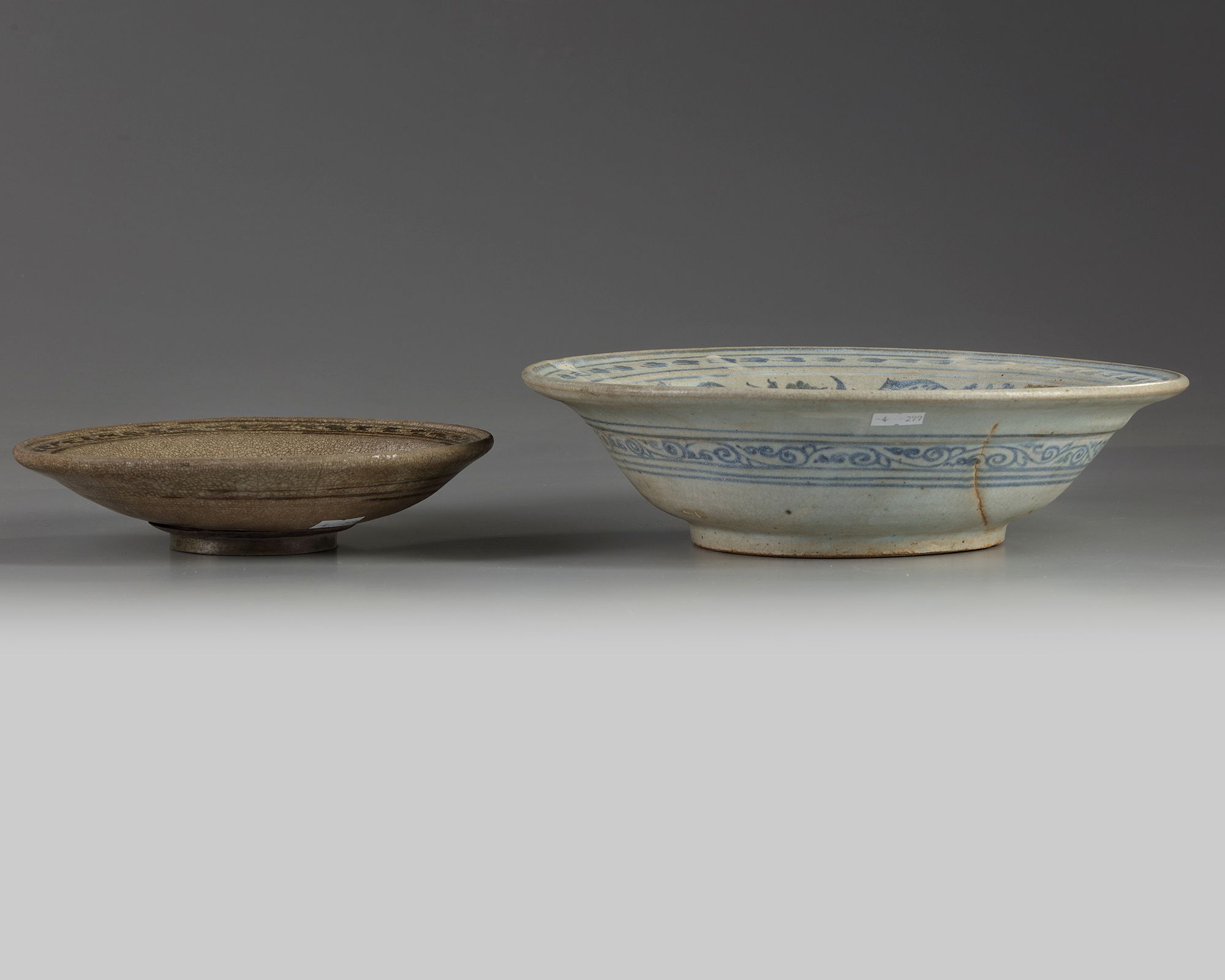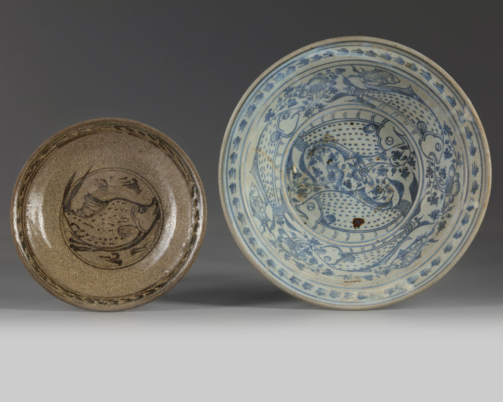 The larger deep bowl is decorated with two fish in a roundel amongst flower scrolls, the rim is decorated with three further pairs of larger and smaller fish amongst flower scrolls, the exterior is decorated with a classic scroll band. The smaller bowl is decorated with a single fish to the centre, the rim is decorated with a further design, the foot is bound with metal.