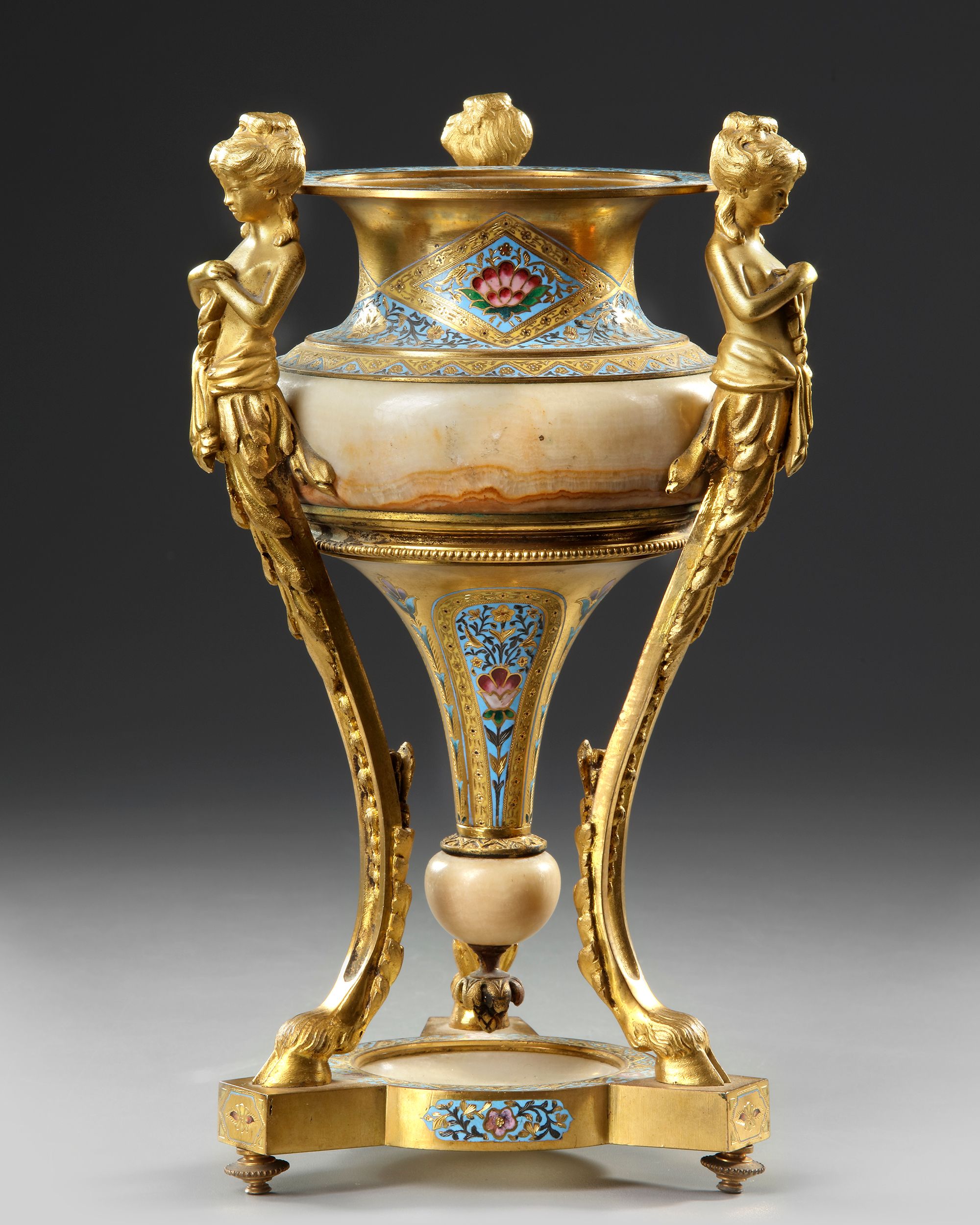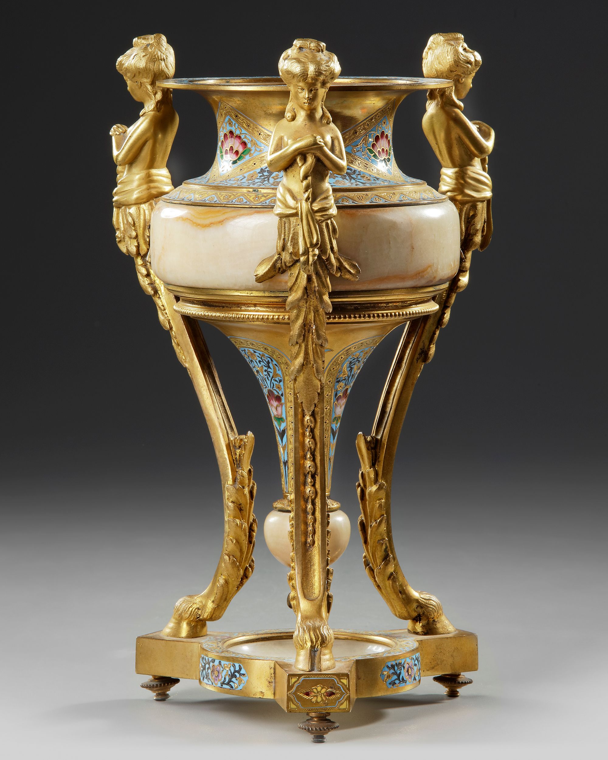 A bronze and enameled cup decorated with three caryatids, and white marble. Late 19th century, Epoque Napoleon III. In a good condition. H 28 cm.