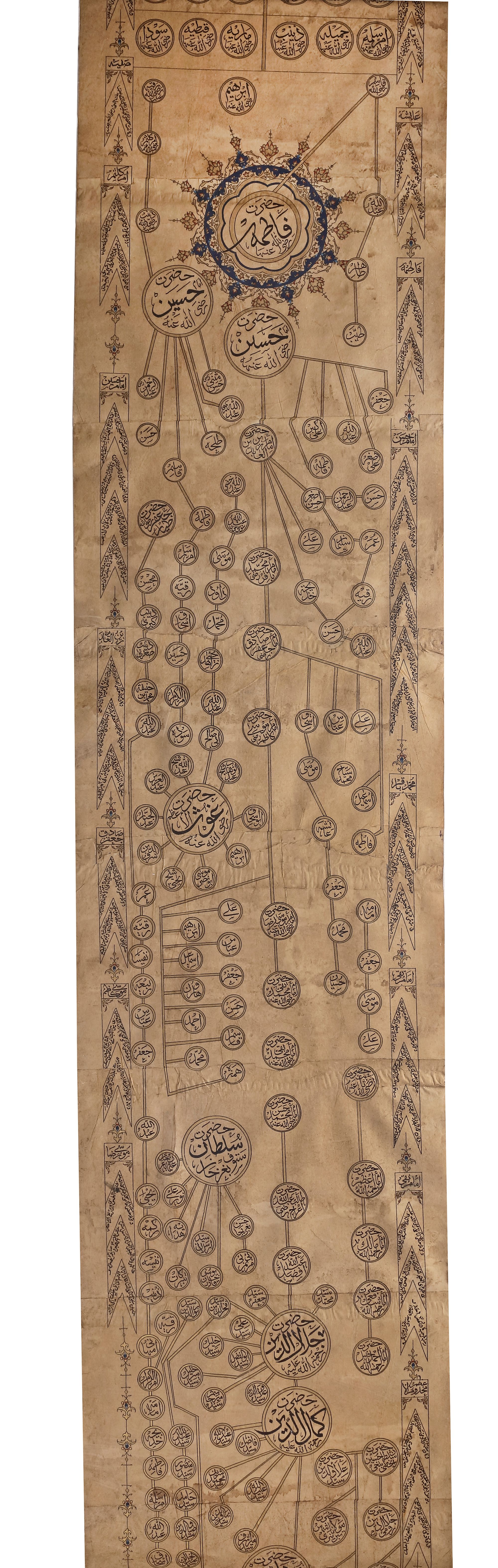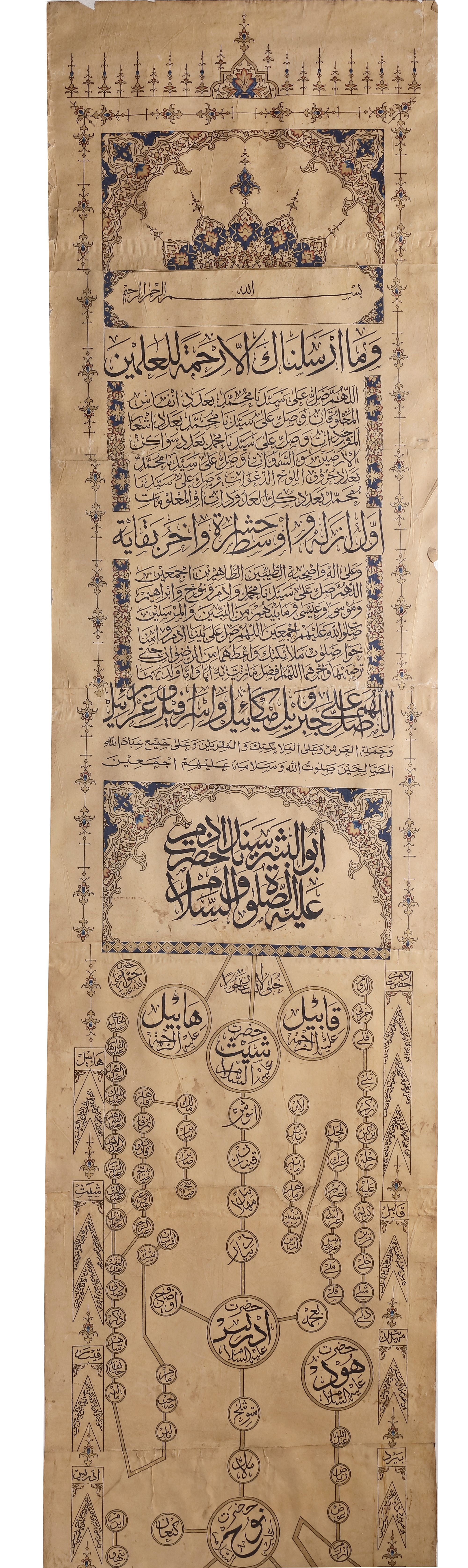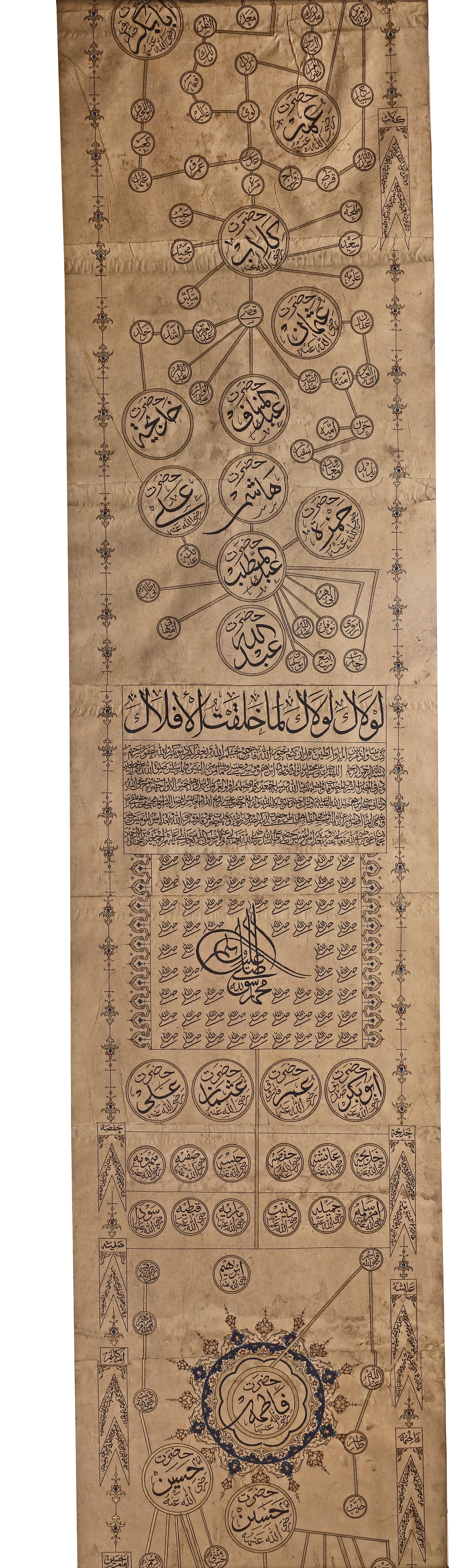 Arabic manuscript on paper, the text in black naskh and thuluth, the scroll with gold and polychrome illumination, the name of Adam in a large cartouche, the name the Prophet in the shape of a tughra, the name of Fatima in an illuminated shamsa, with illuminated headpiece, signed along the bottom
