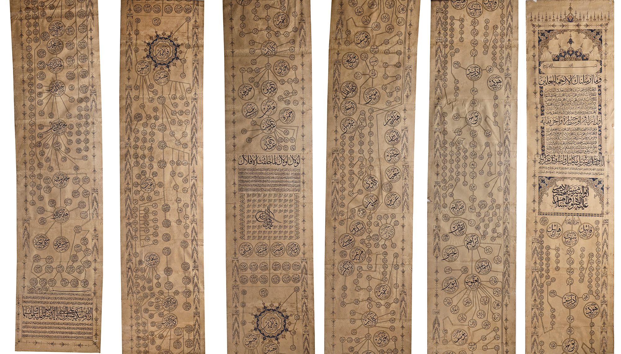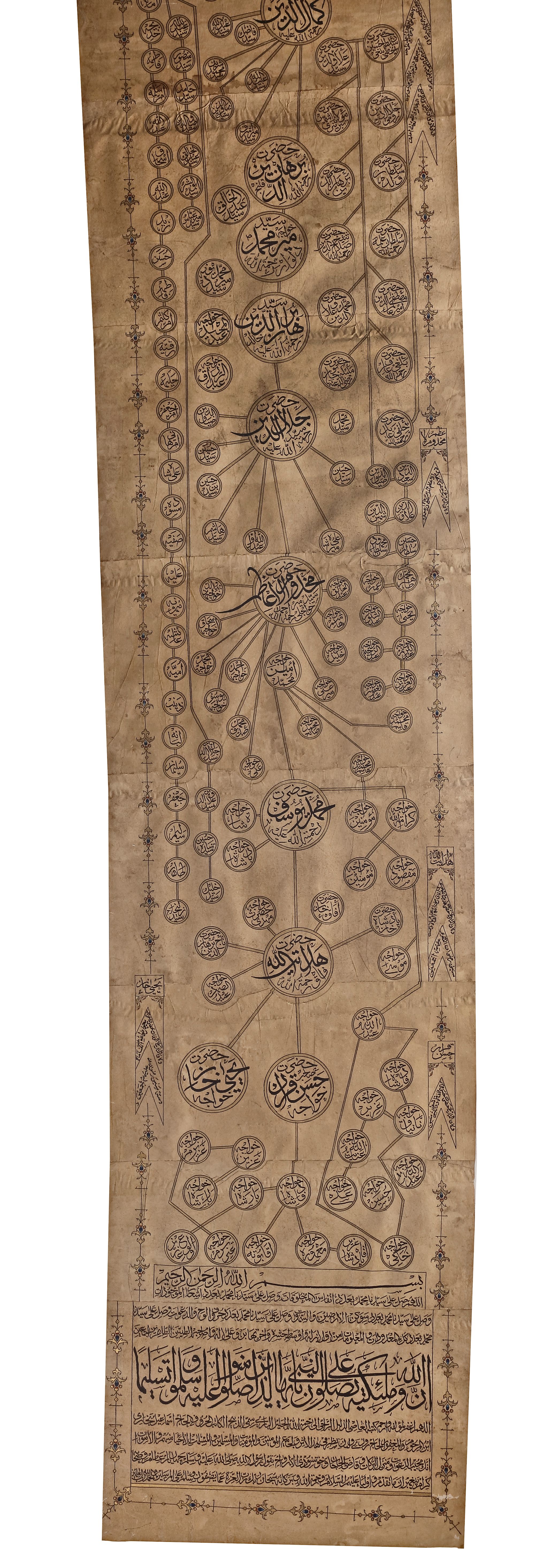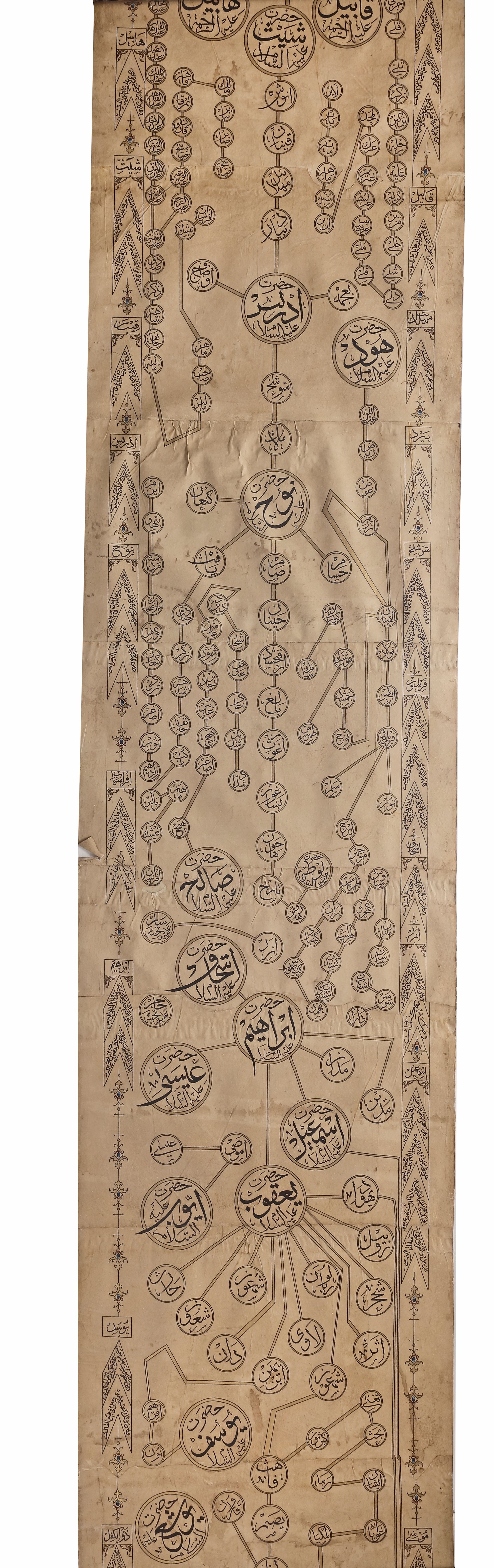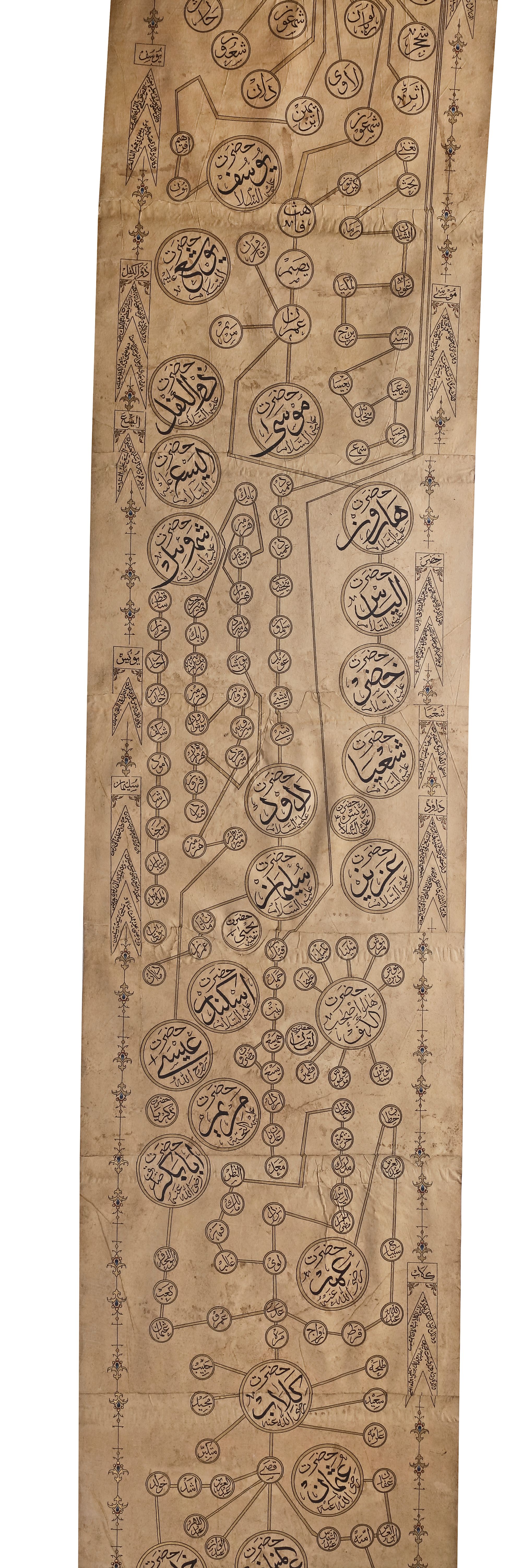 Arabic manuscript on paper, the text in black naskh and thuluth, the scroll with gold and polychrome illumination, the name of Adam in a large cartouche, the name the Prophet in the shape of a tughra, the name of Fatima in an illuminated shamsa, with illuminated headpiece, signed along the bottom