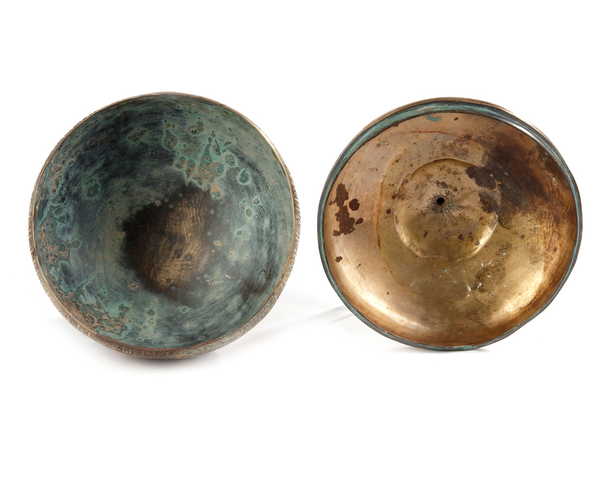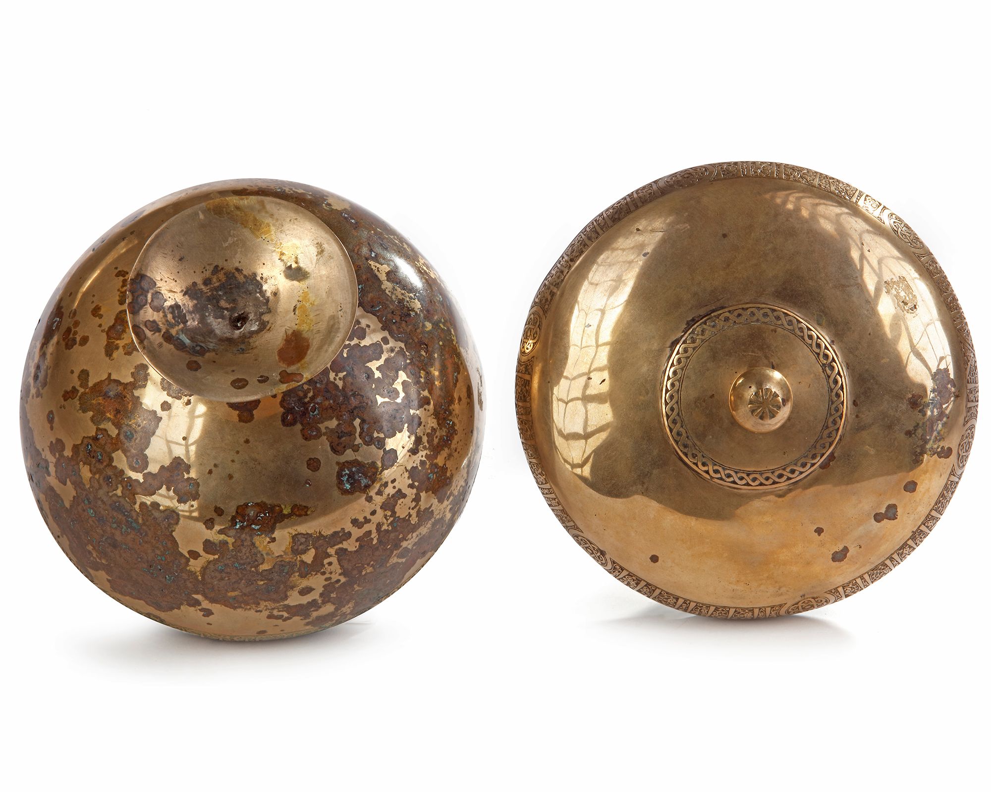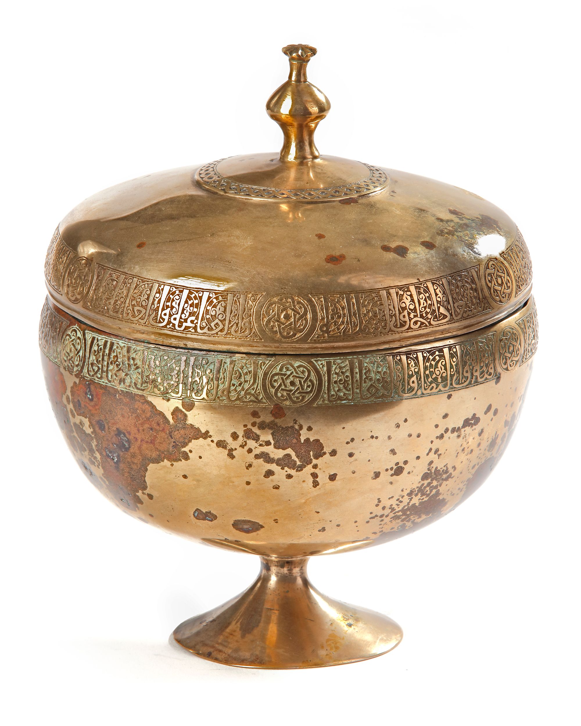 Of hemispherical form on spreading trumpet foot, the shallow domed cover, the bowl plain save for a band of elegant Naskh benedictory inscription around the rim on an engraved scrolling foliate ground,