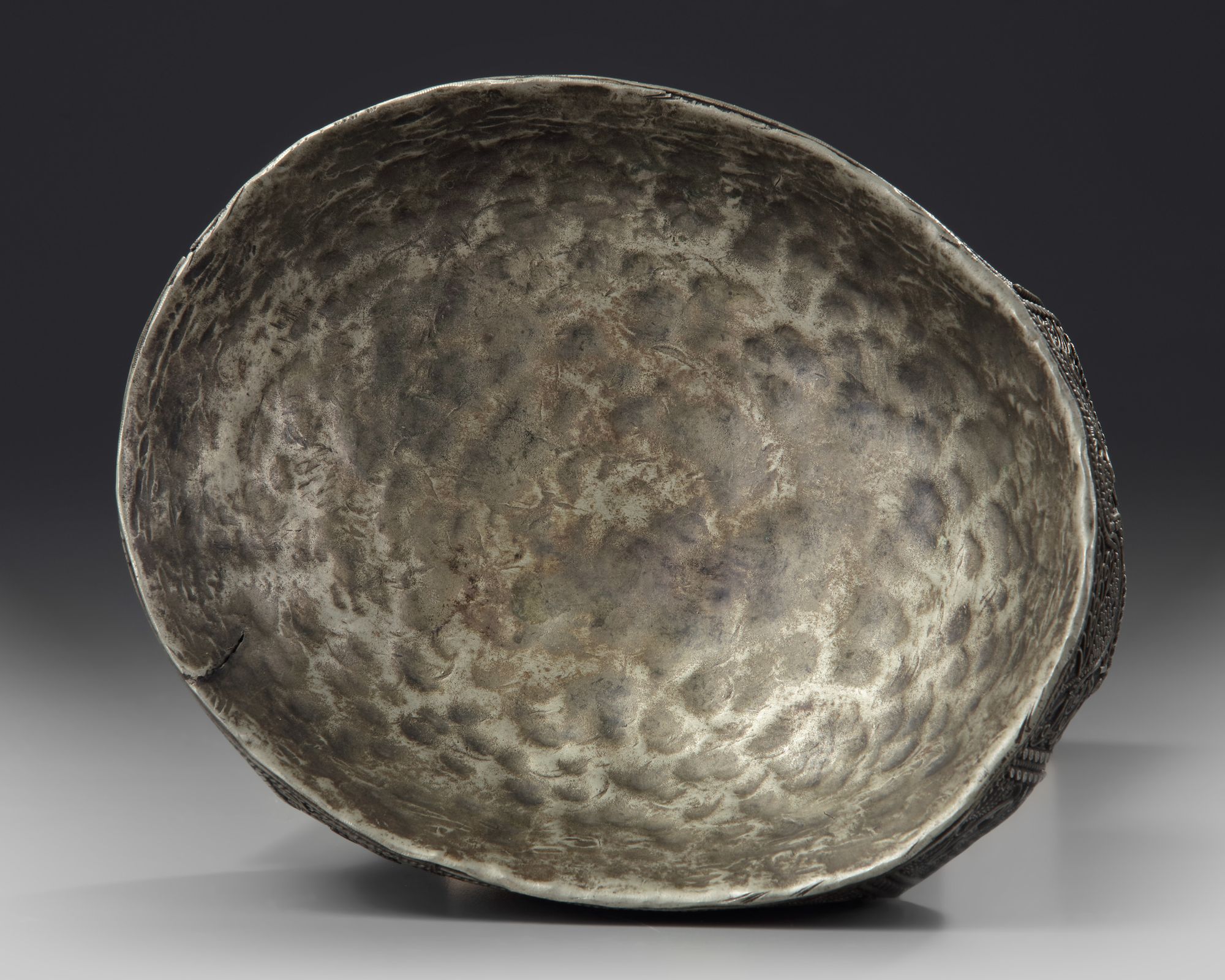 A Tibetan kapala skull shaped as a bowl and mounted with silver band to the sides.