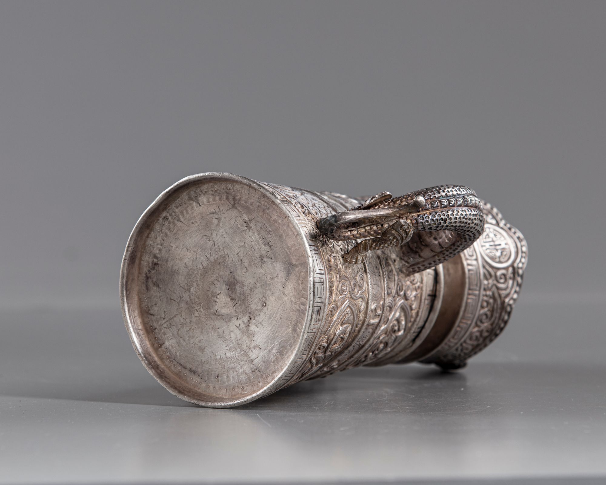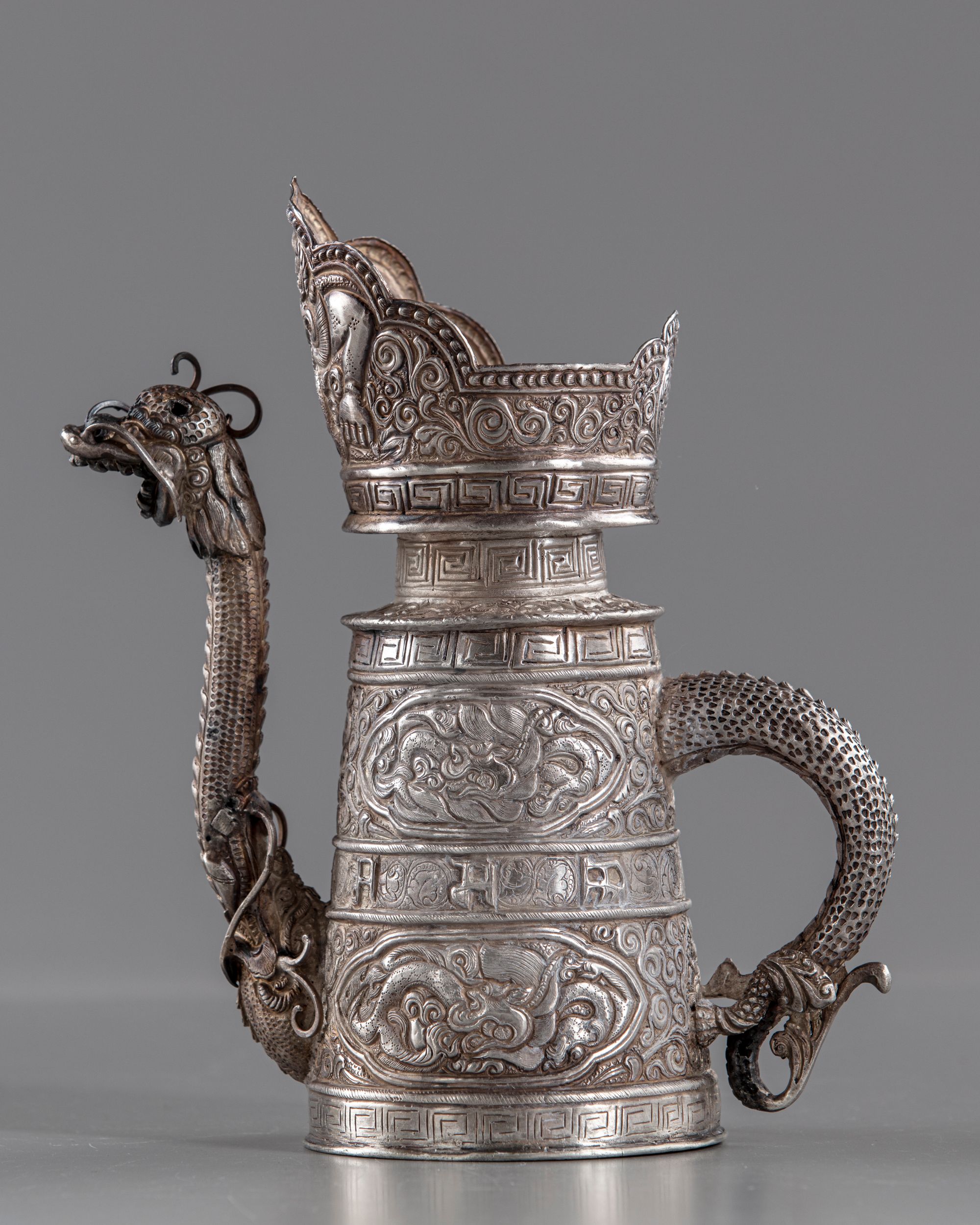 A Tibetan ritual silver ewer, with a dragon shaped spout, the handle of a dragon tail.