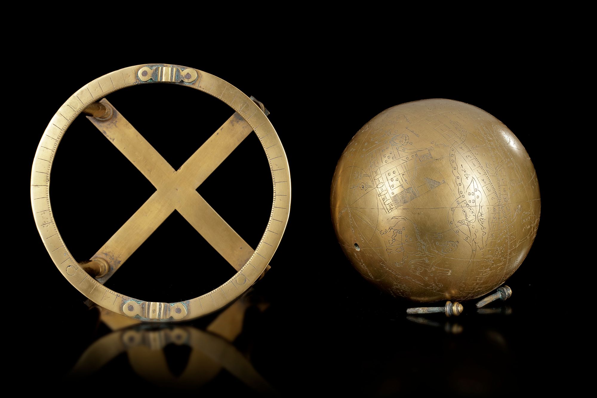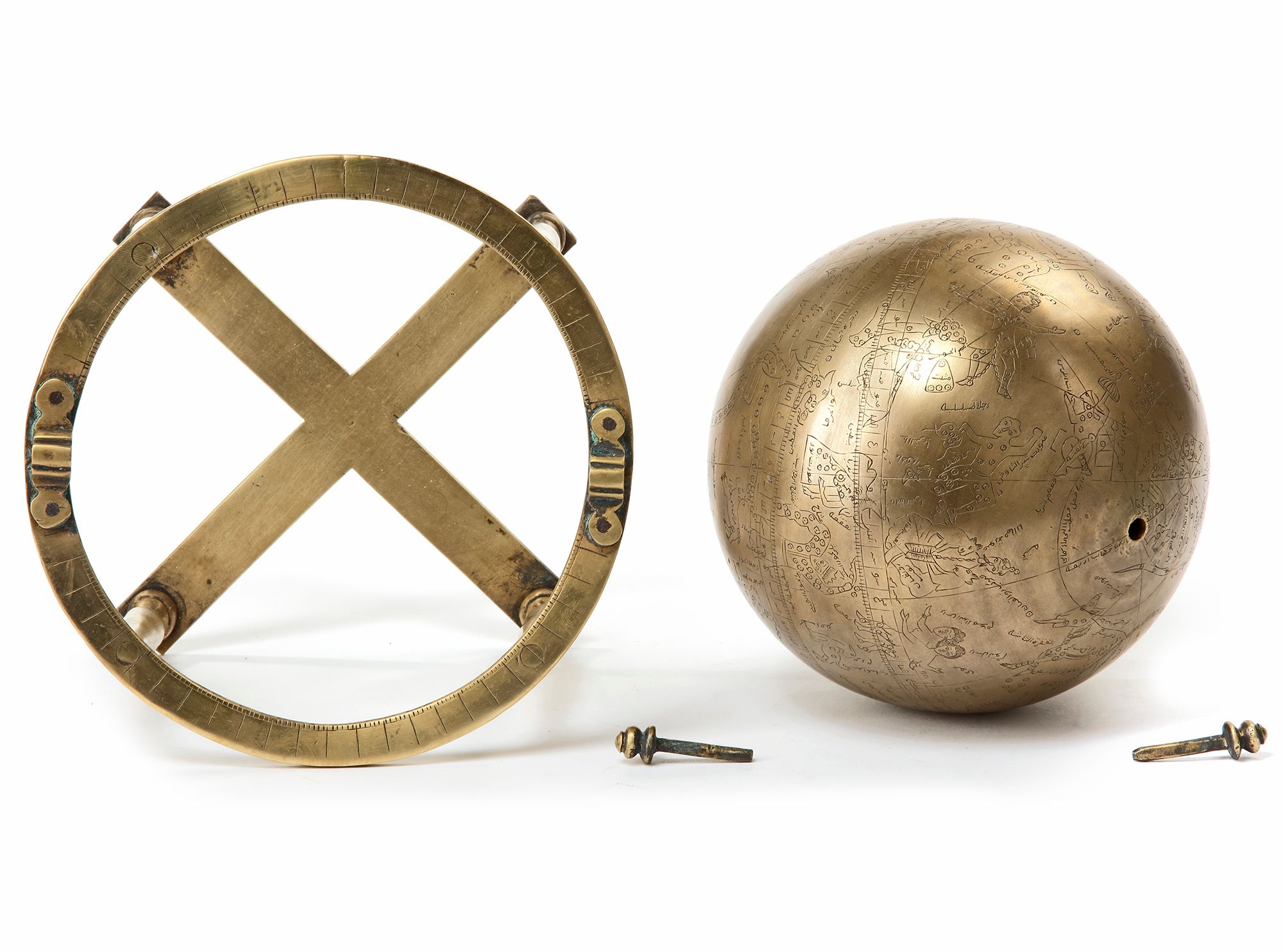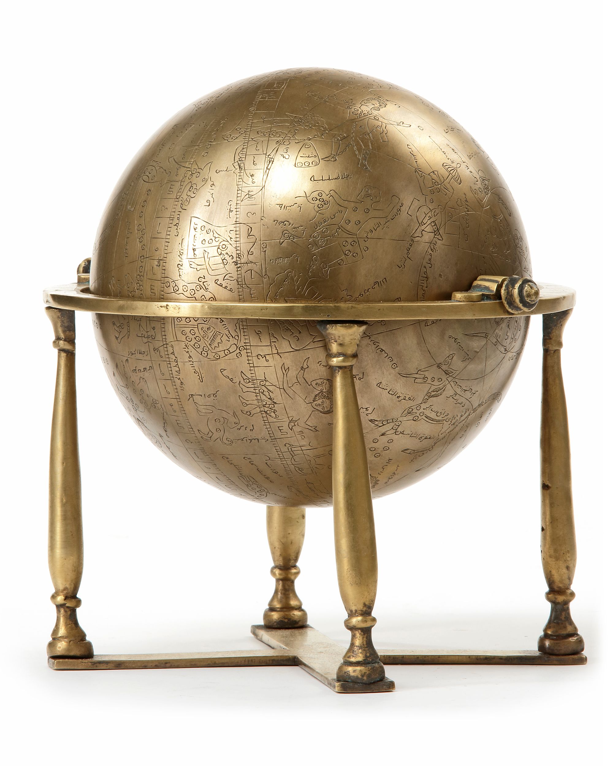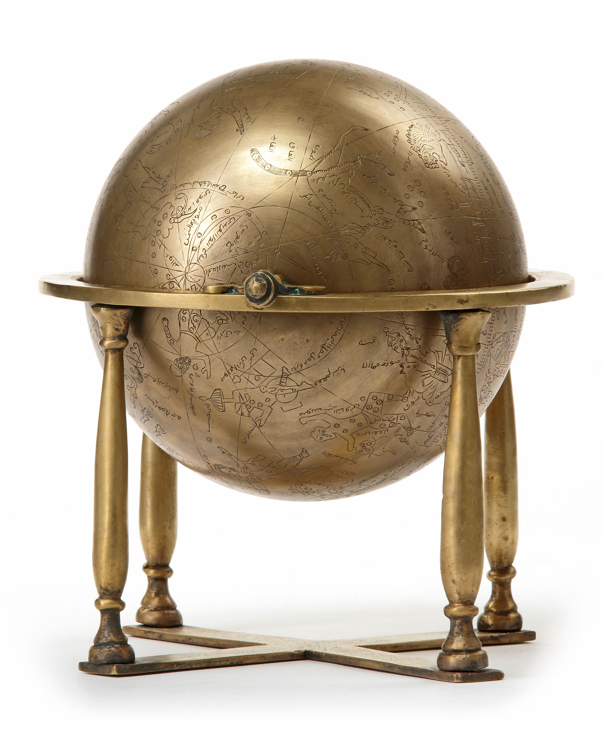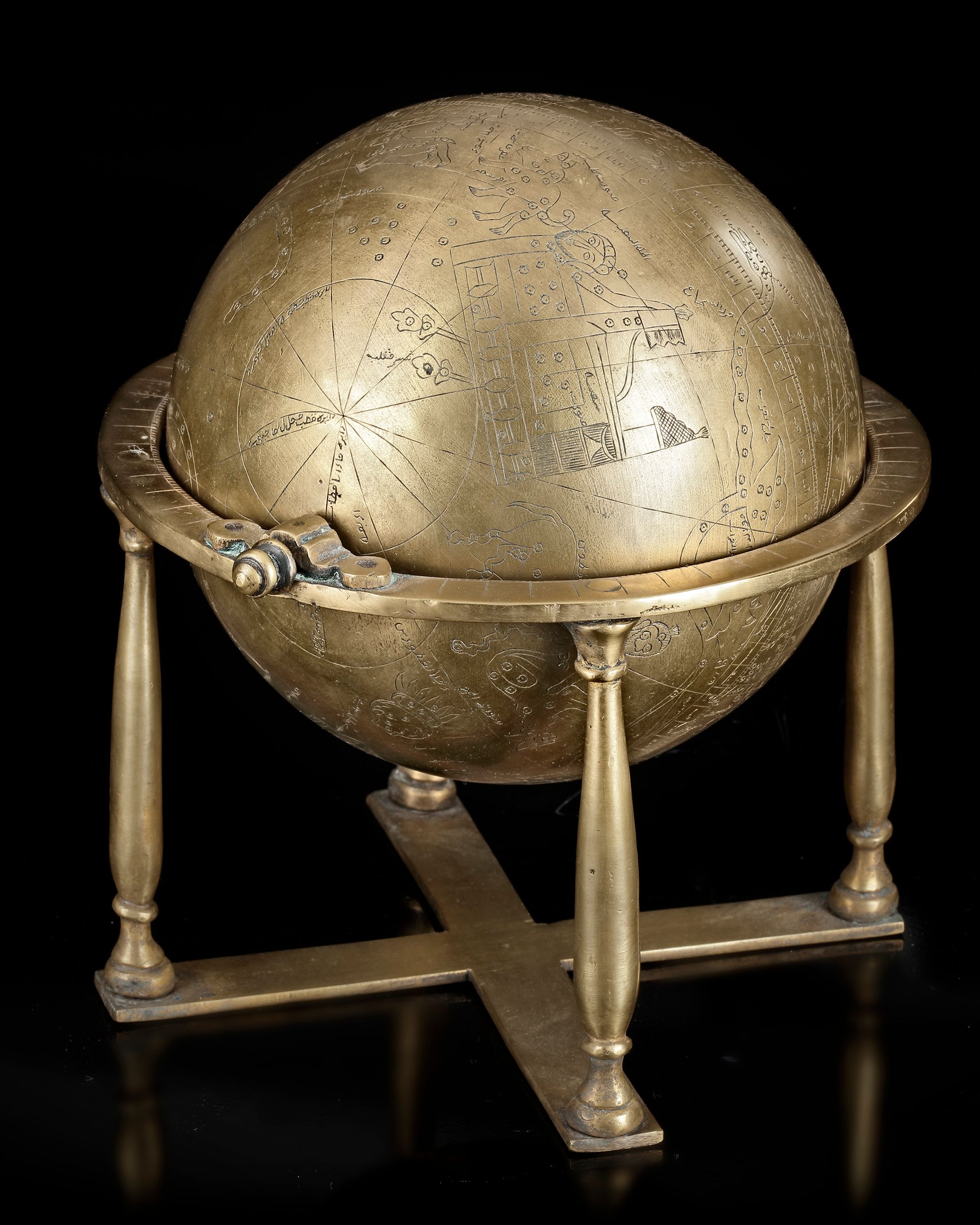 Brass celestial globe made by the prominent Mughal astrolabist Tatawi in 1073 AH/ 1662-1663 AD. This celestial globe is one of the four known celestial globes of the maker.