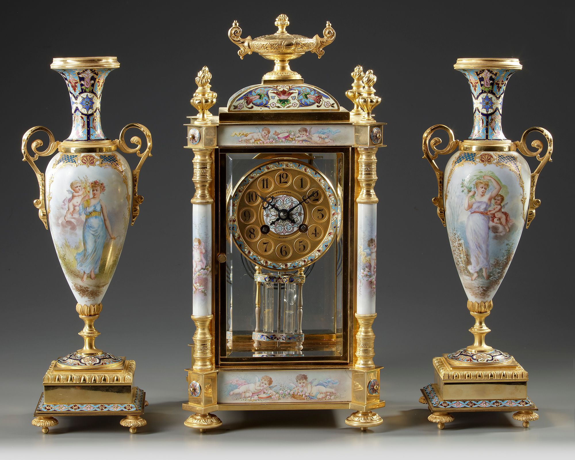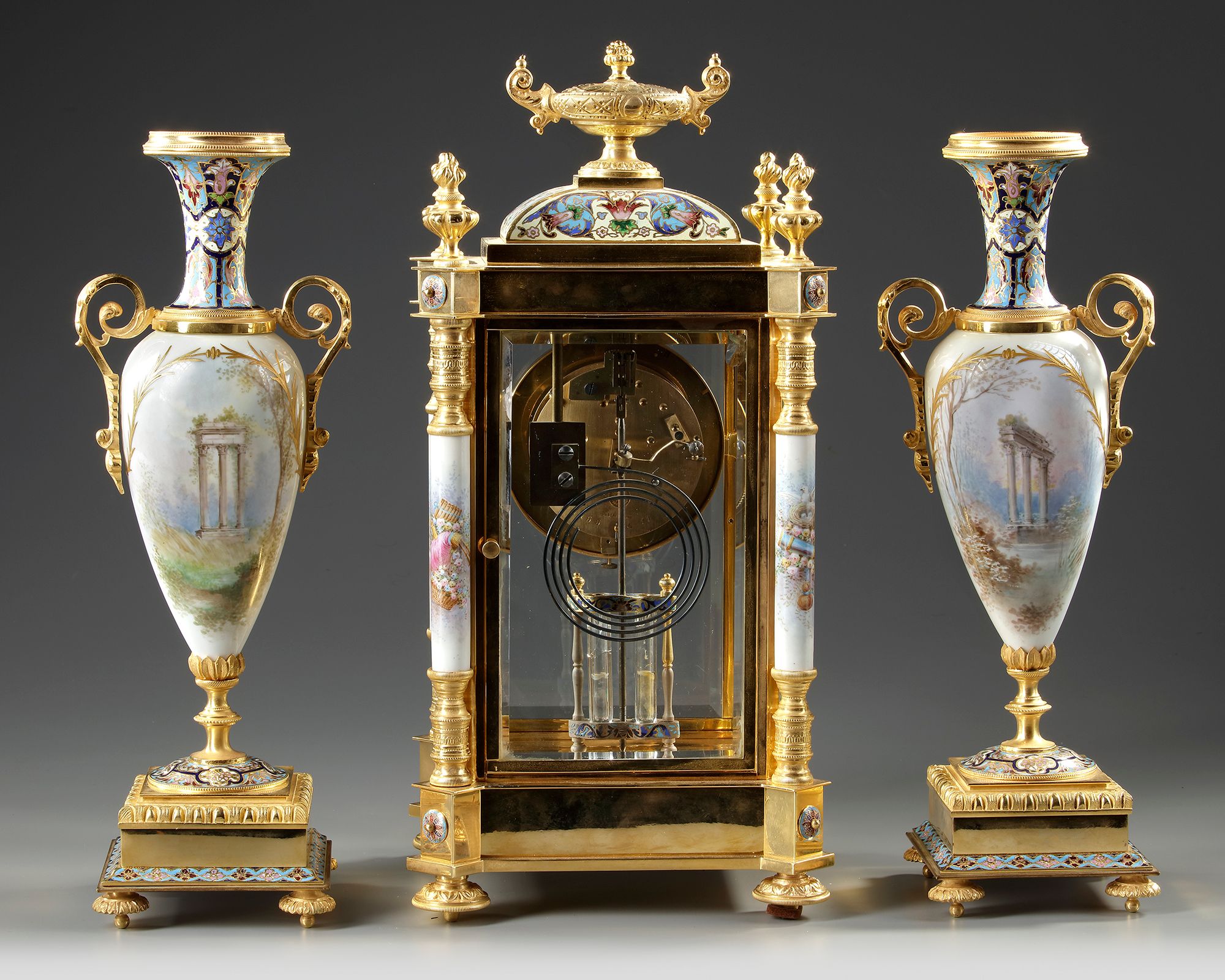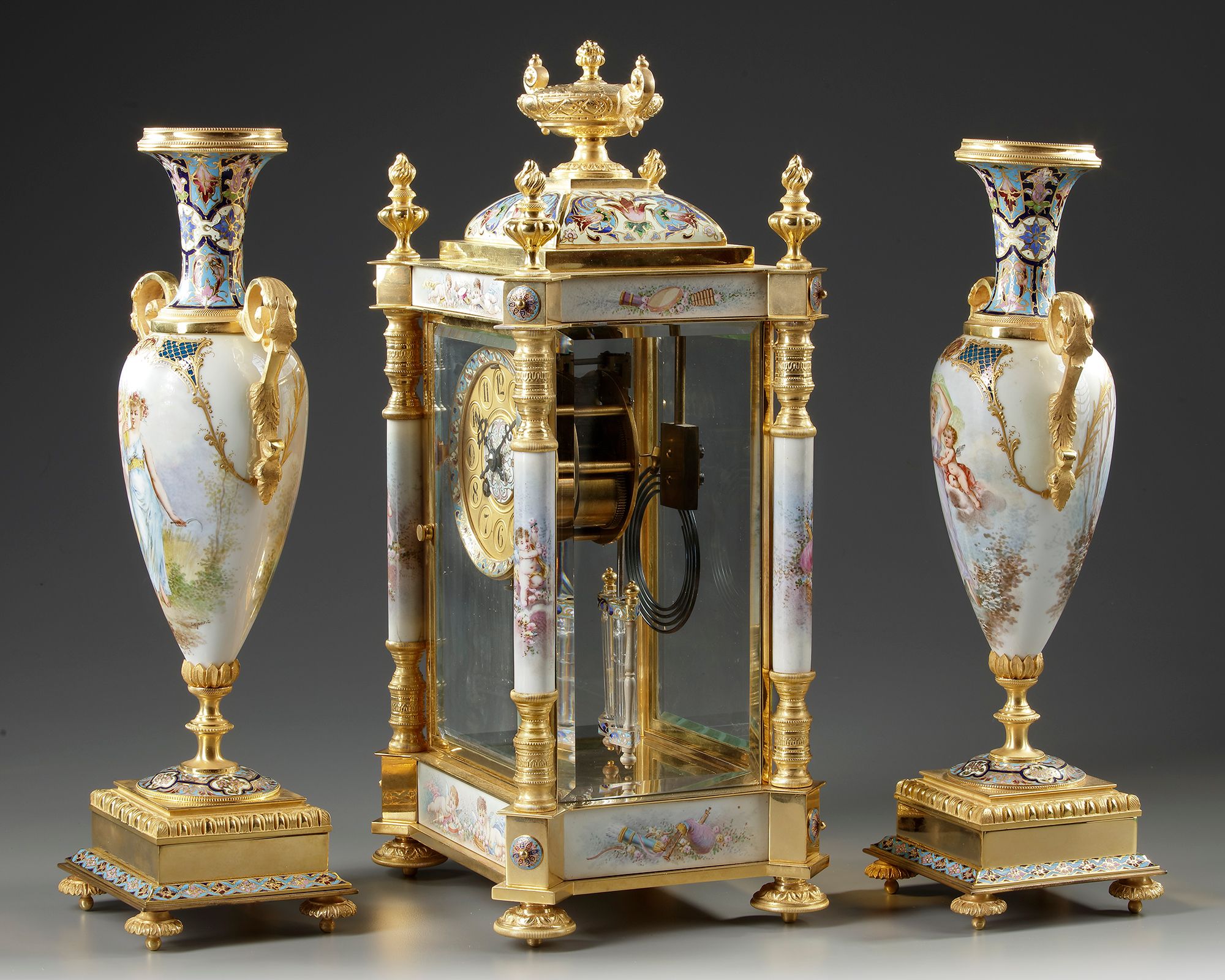 The clock set composed of a clock and a pair of vases. 'Sévres' porcelain and champlevé enameled gilt bronze. H 40 cm. H 37 cm.