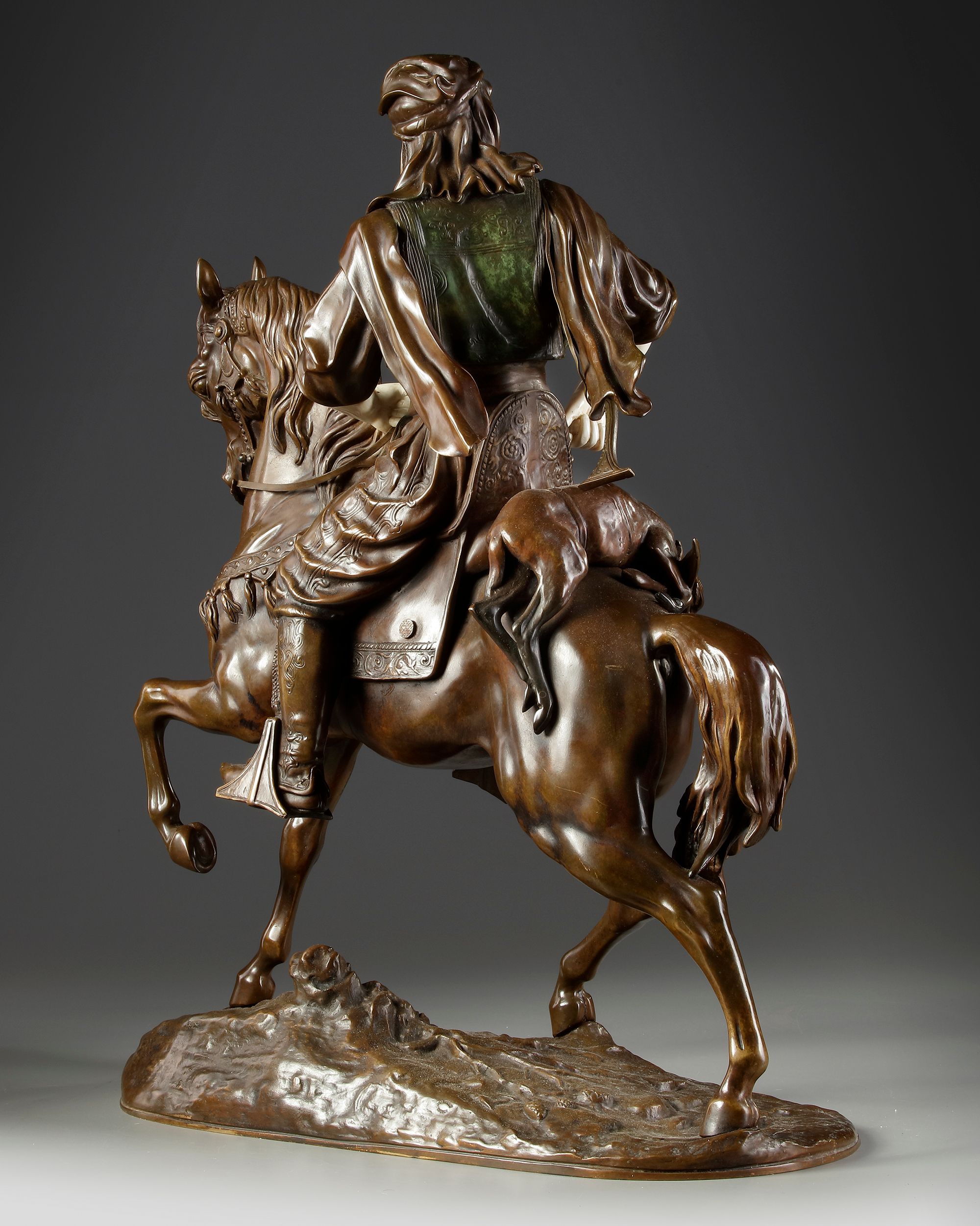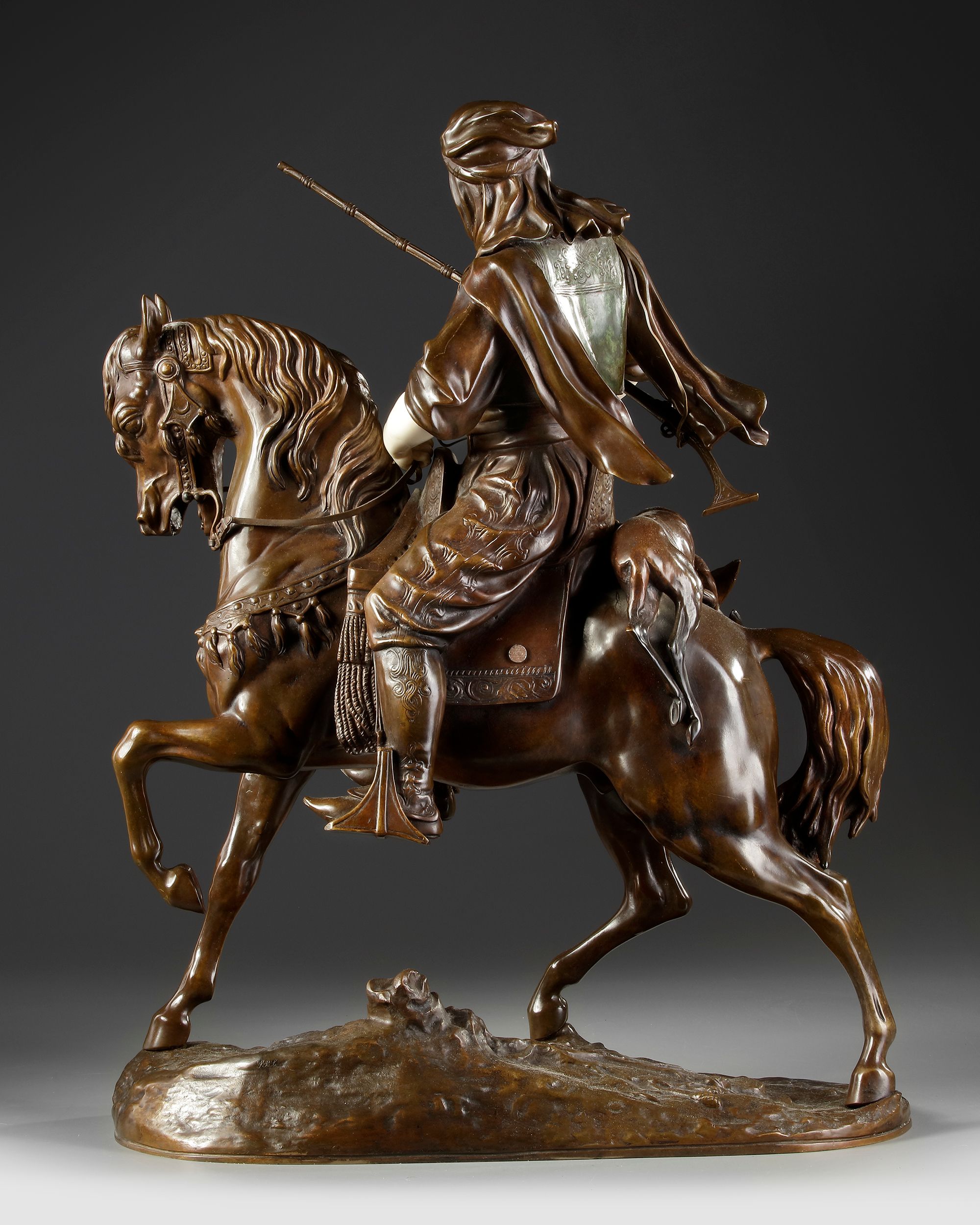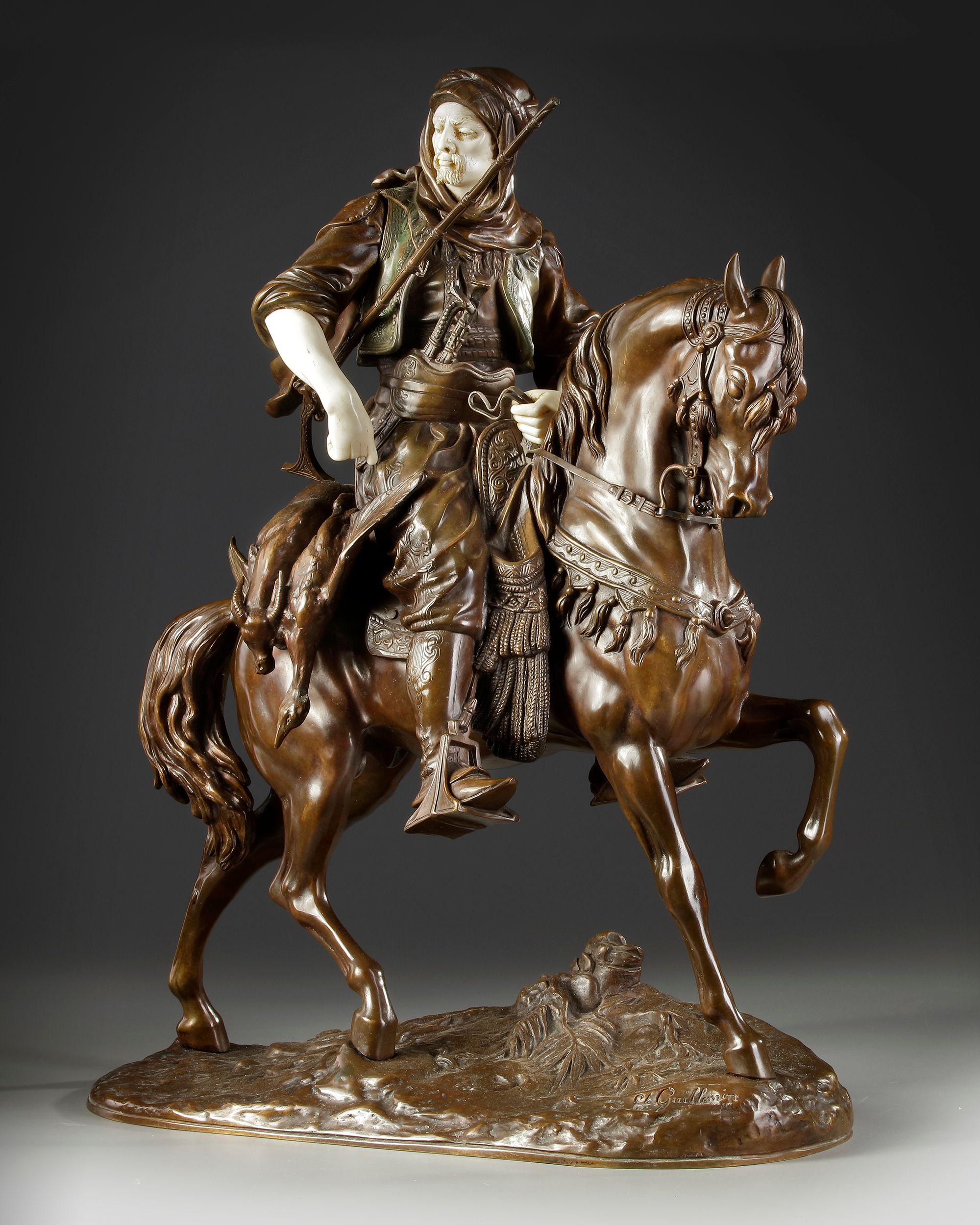 Superb bronze Alfred Barye (1839-1882) and Emile Guillemin (1841-1907). Arab horseman returning from hunting, bronze with brown patina and color. Chryséléphantine. Face, arms and hands from ivory. Signed on the base. In a perfect condition.