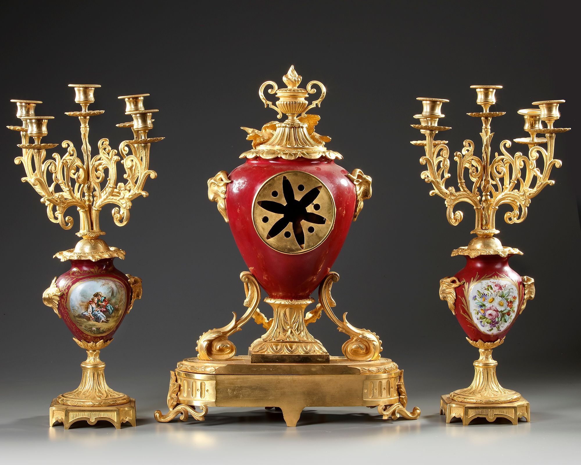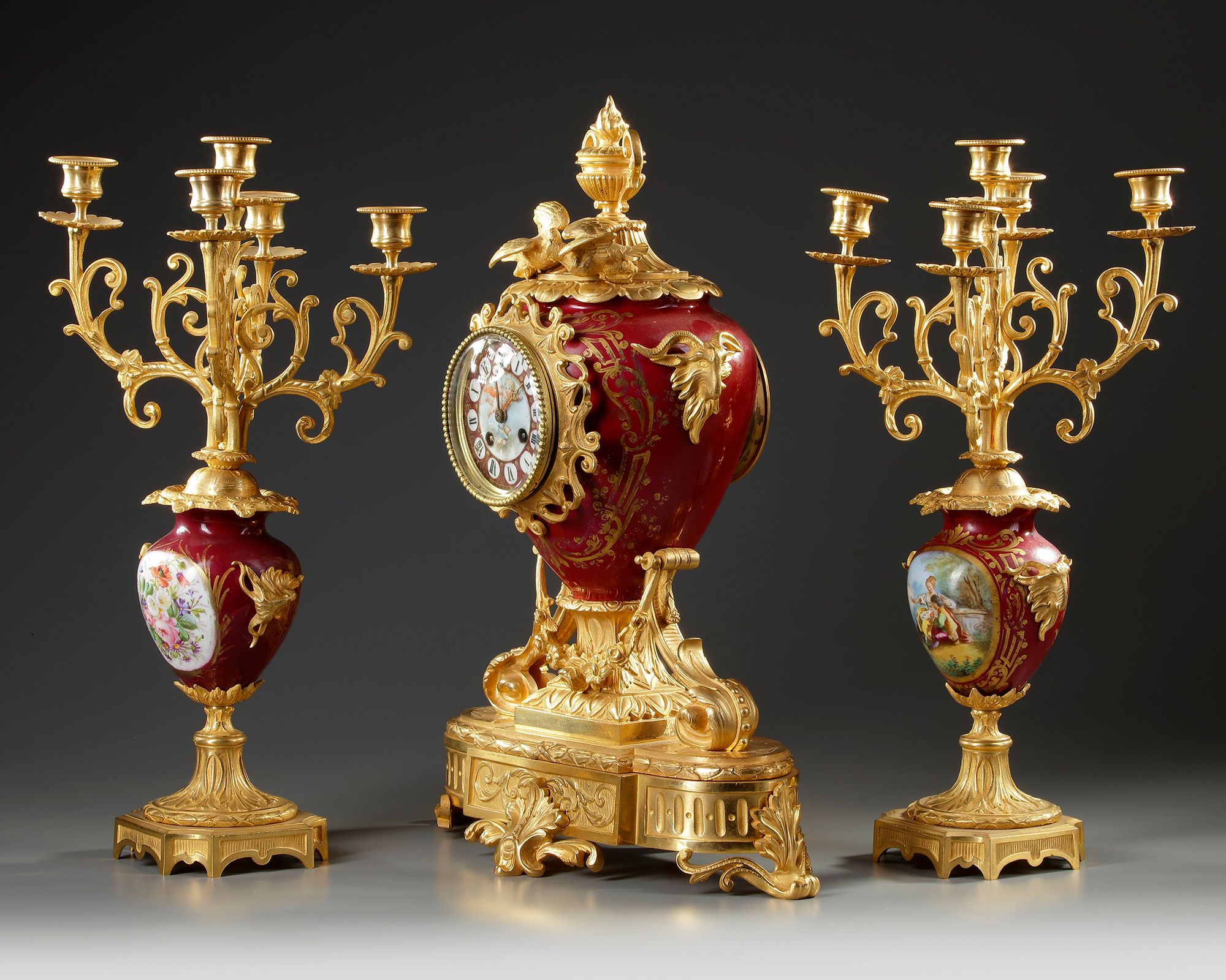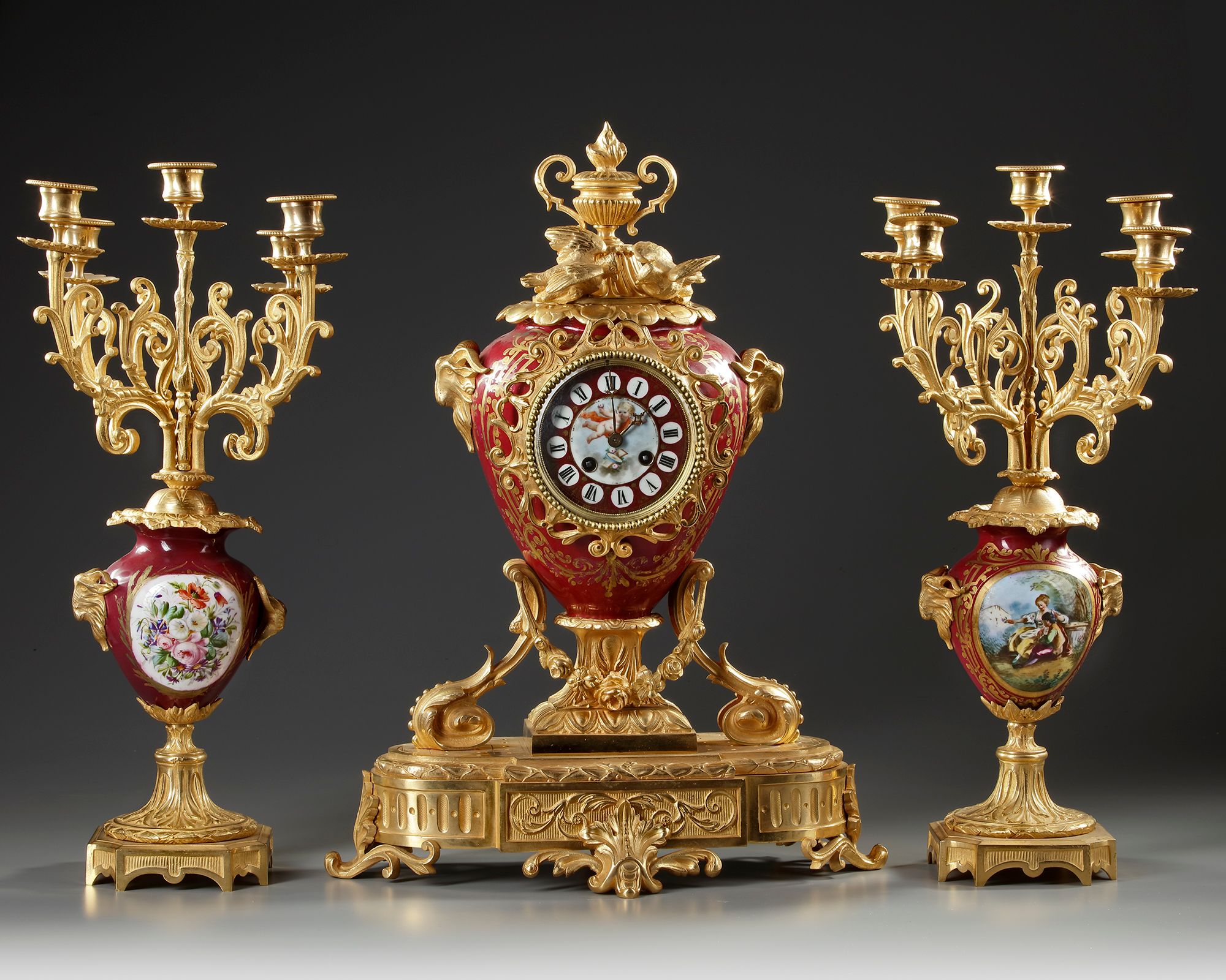 Comprising a large clock decorated with two doves, framing with Roman numerals adorned with a cherub, two rams' heads on the sides, rich foliage decoration on the base. Two cassolettes decorated with gallant scenes and bouquets of flowers forming the two five-branched W.40 cm Beautiful quality of carving and gilding. Late19th century, Napoleon III period.