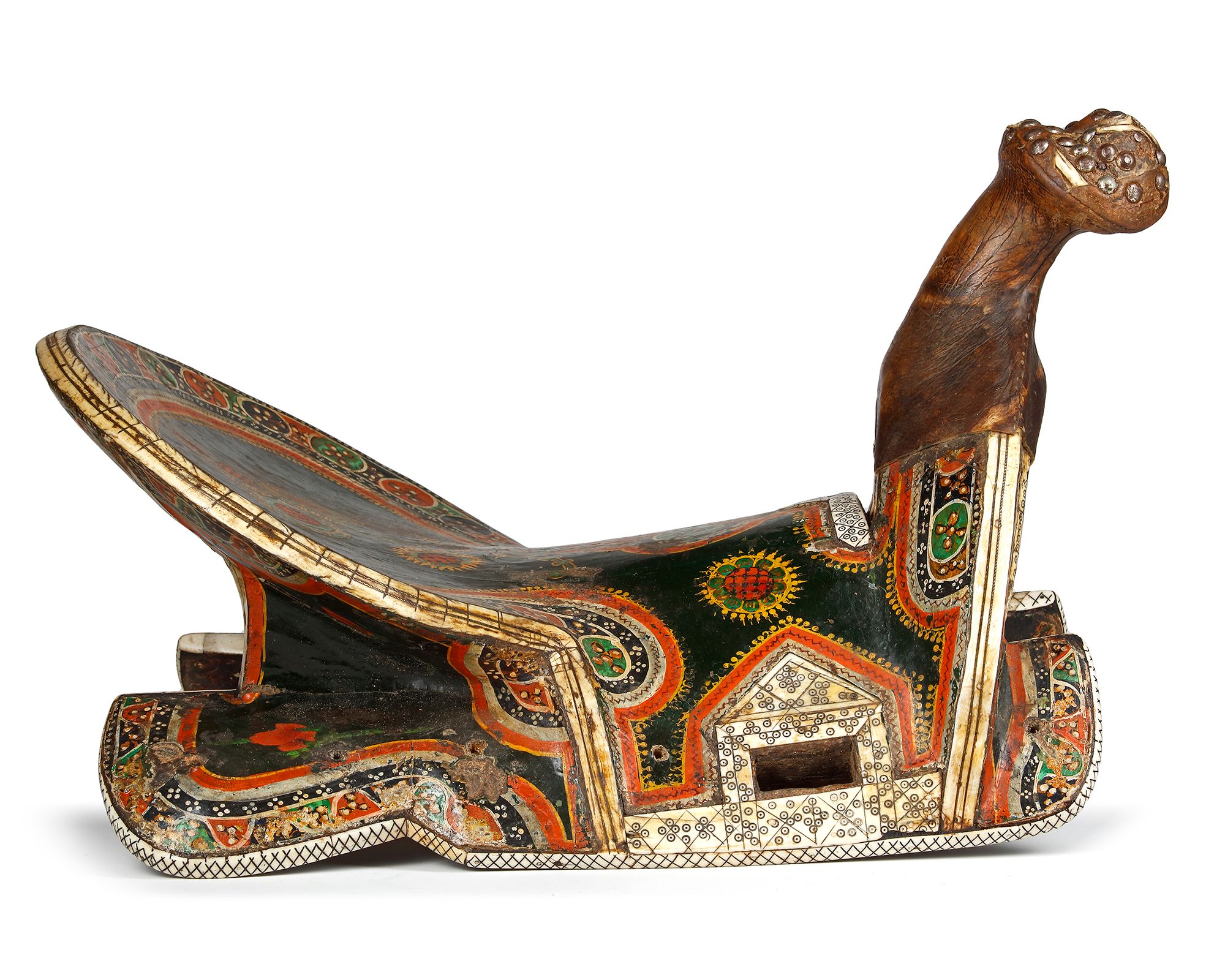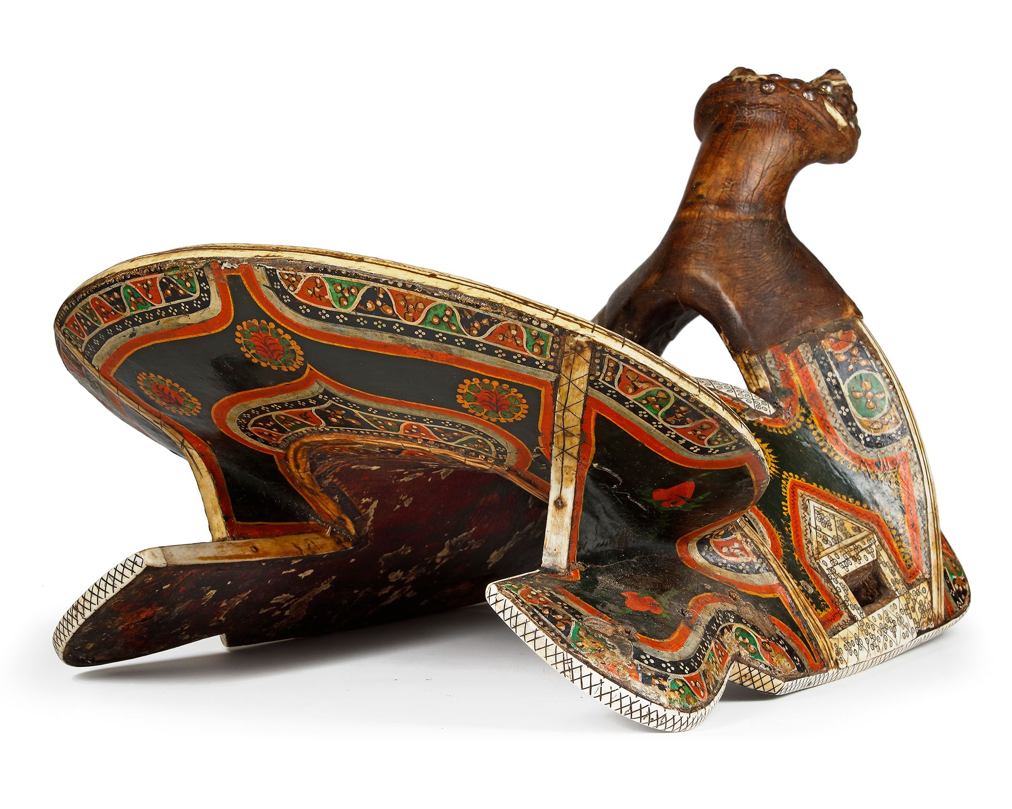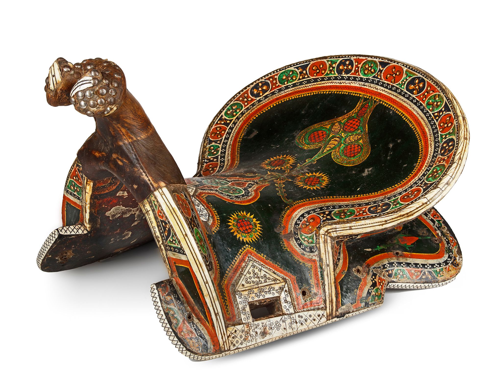 A polychrome-painted and lacquered wood saddle, of typical shape, the top painted in bright red, green, blue, black and white, circles, geometric fretwork bands to the edges, and abstract vegetal and geometric medallions in the centre, lined with thin bone slabs to the front and side edges, the pommel covered with brown leather.