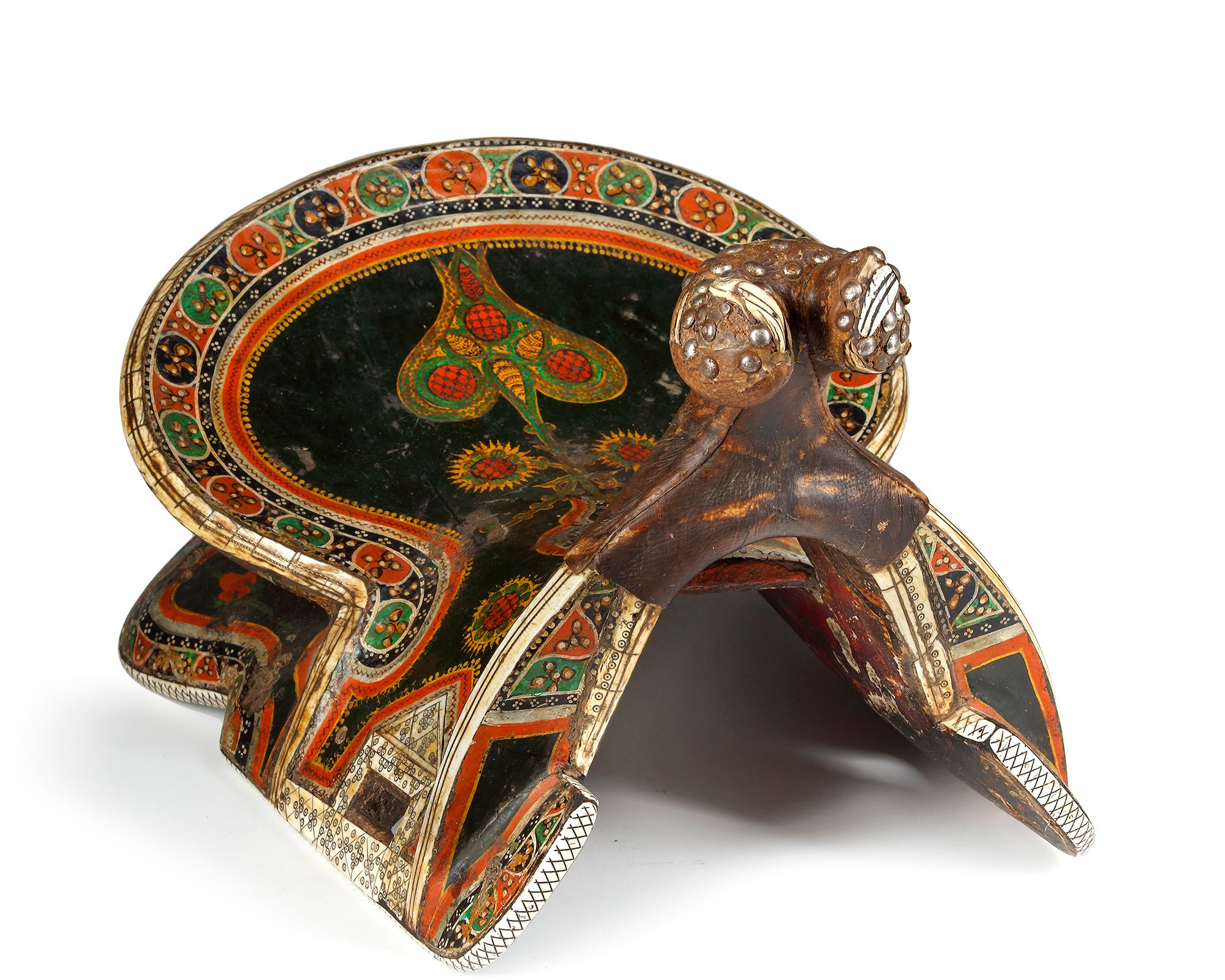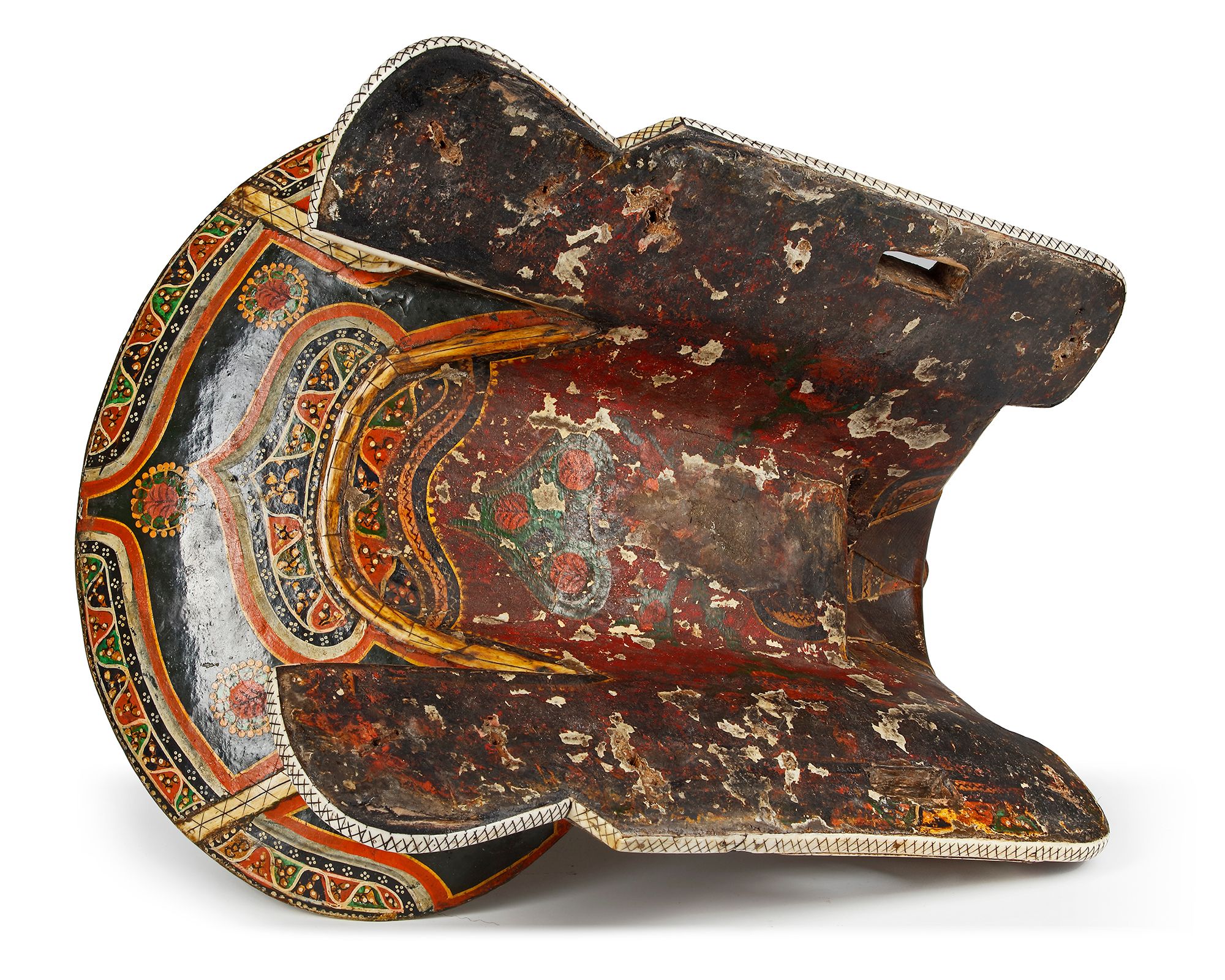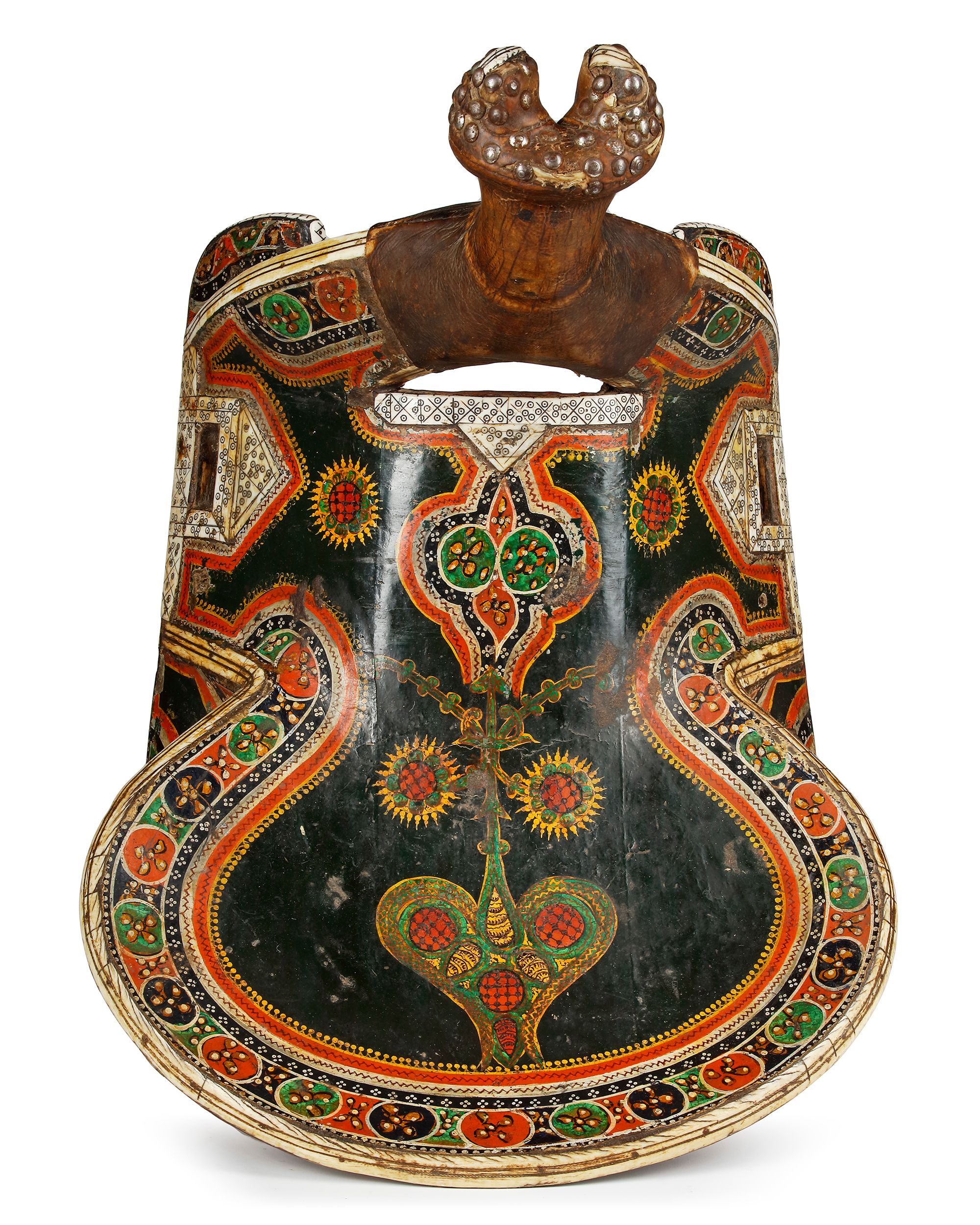 A polychrome-painted and lacquered wood saddle, of typical shape, the top painted in bright red, green, blue, black and white, circles, geometric fretwork bands to the edges, and abstract vegetal and geometric medallions in the centre, lined with thin bone slabs to the front and side edges, the pommel covered with brown leather.
