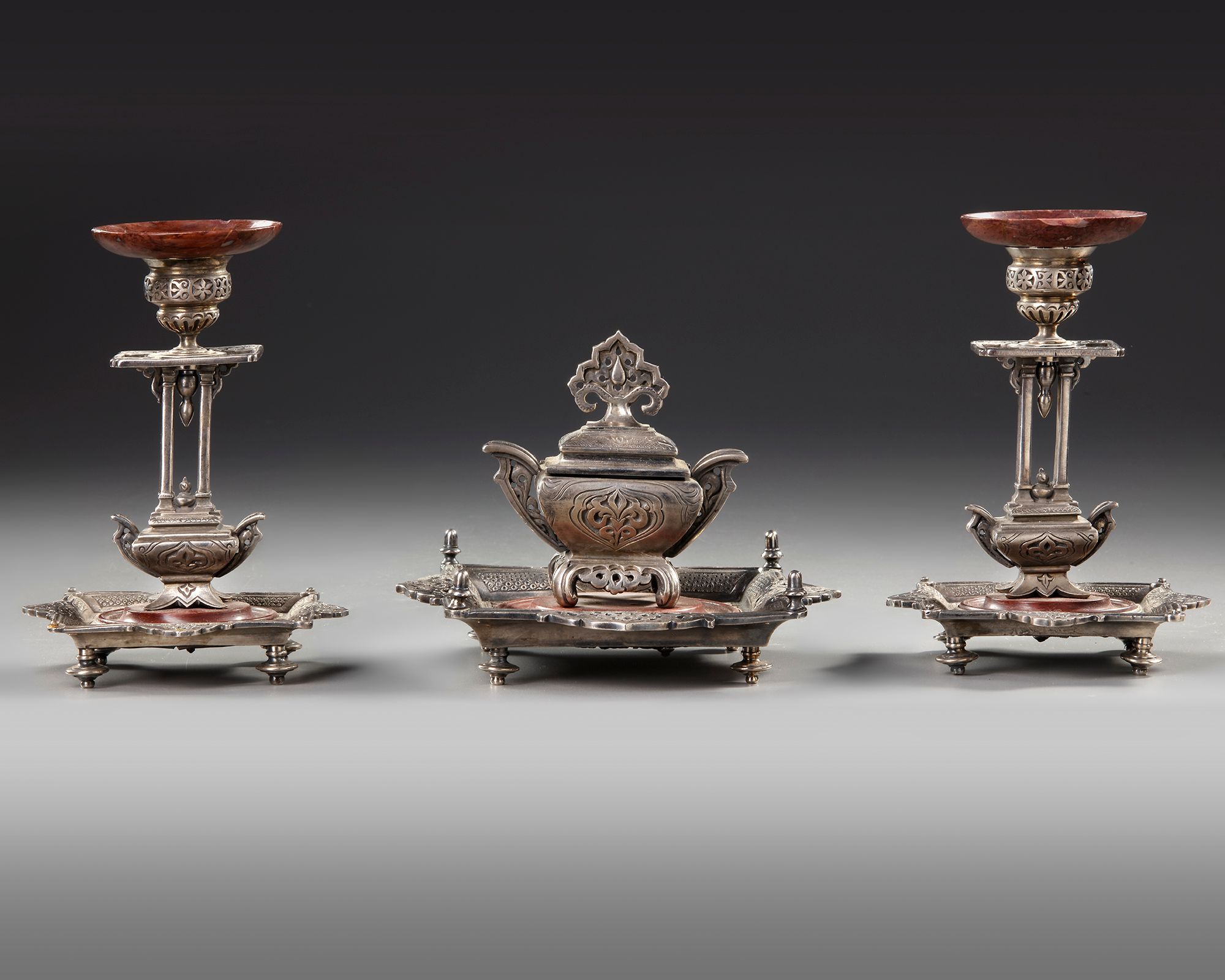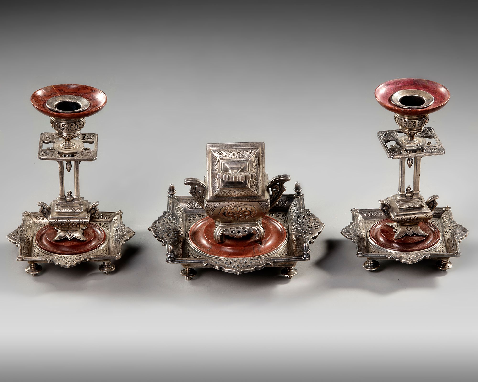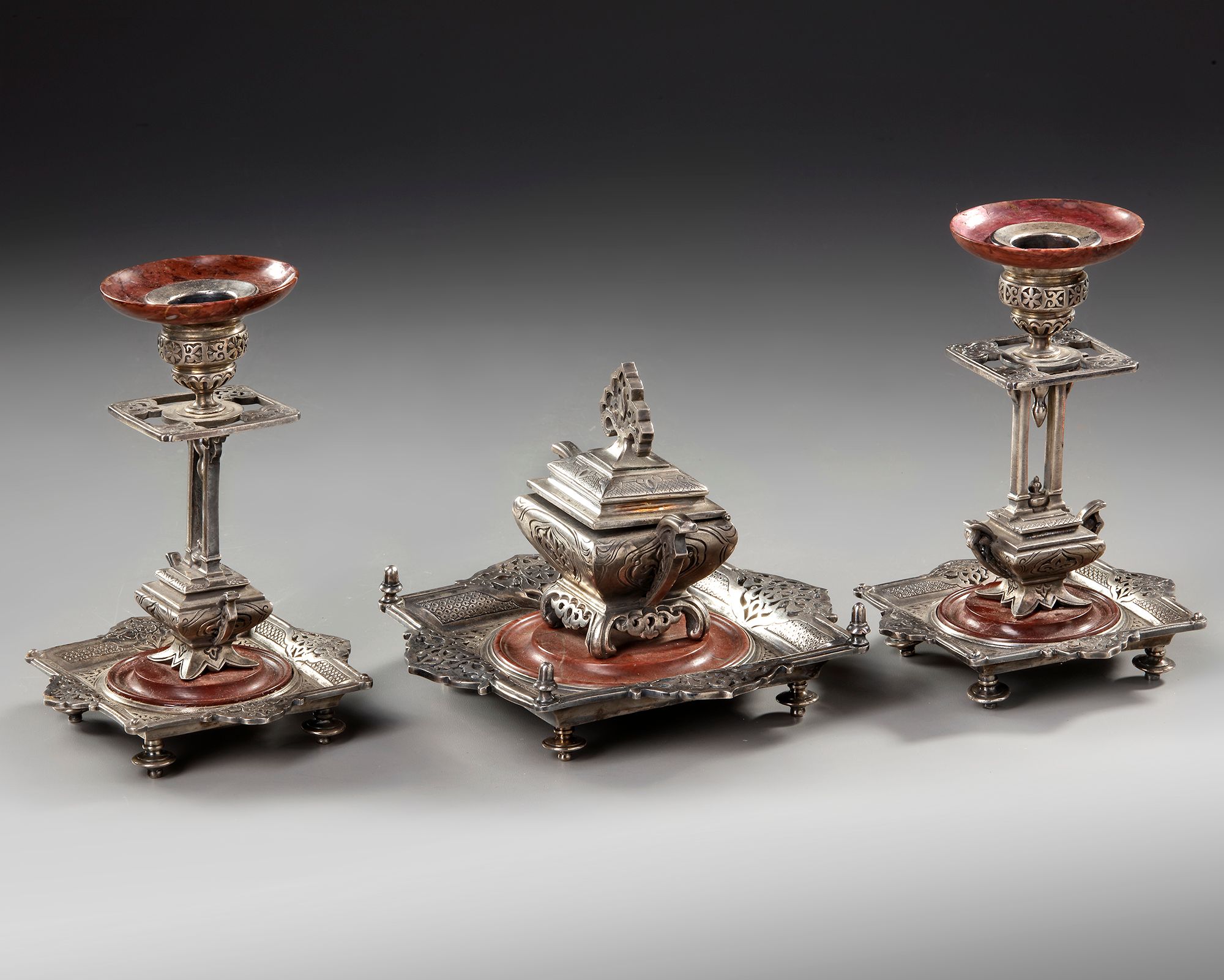 Composed of two candlesticks and an inkwell. Silver, bronze and red marble. Candlesticks 17 cm. Inkwell 15 cm. In a good condition.
