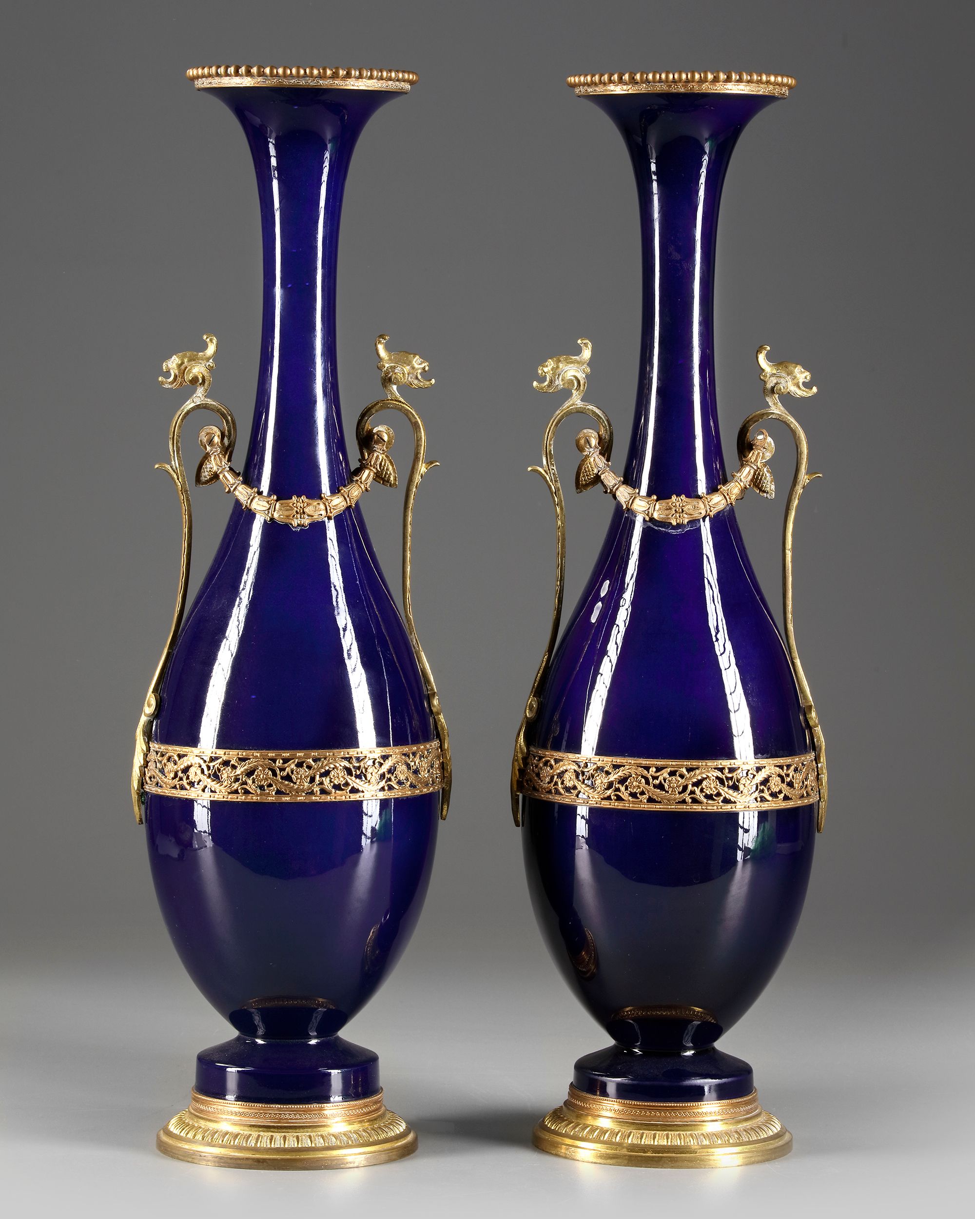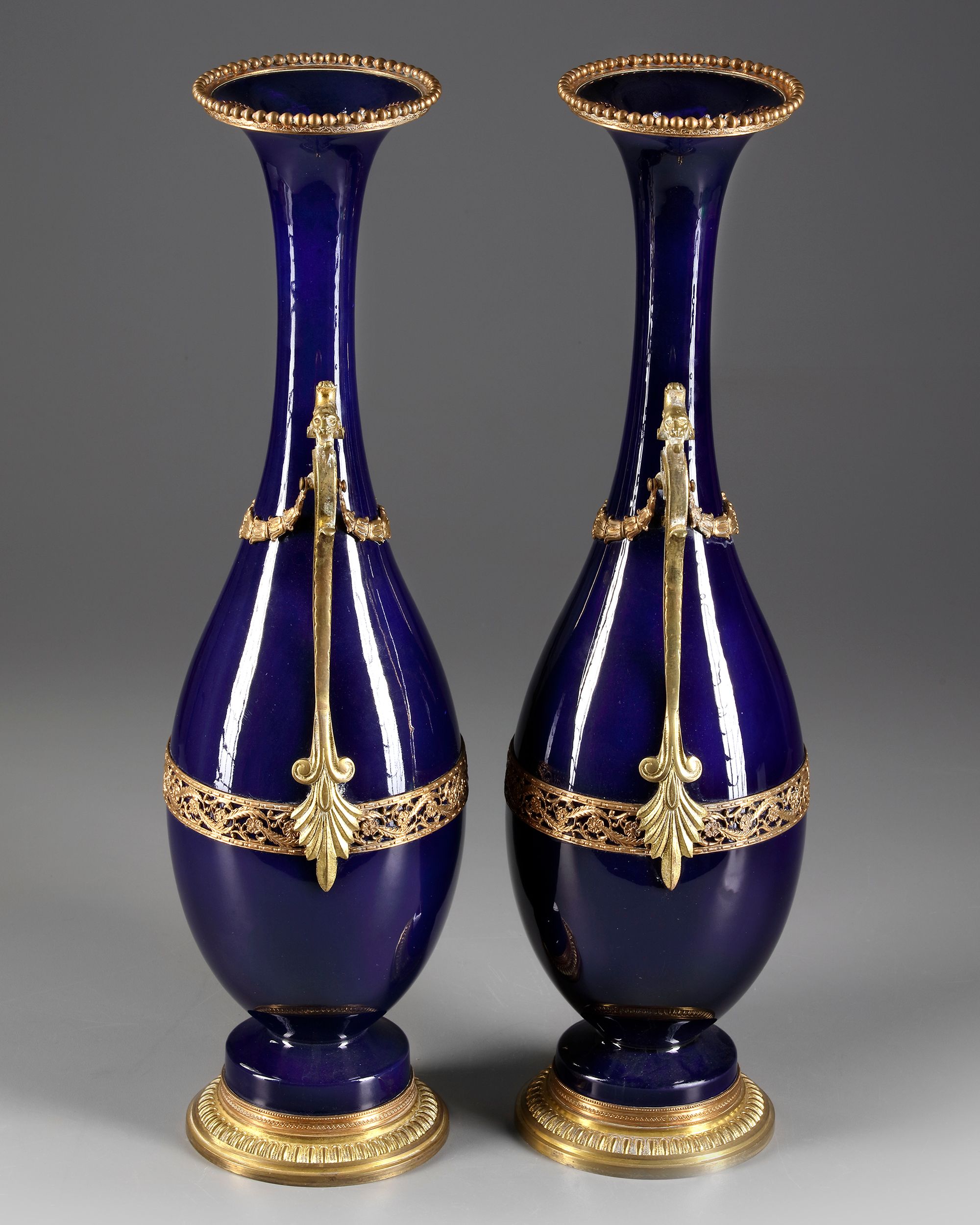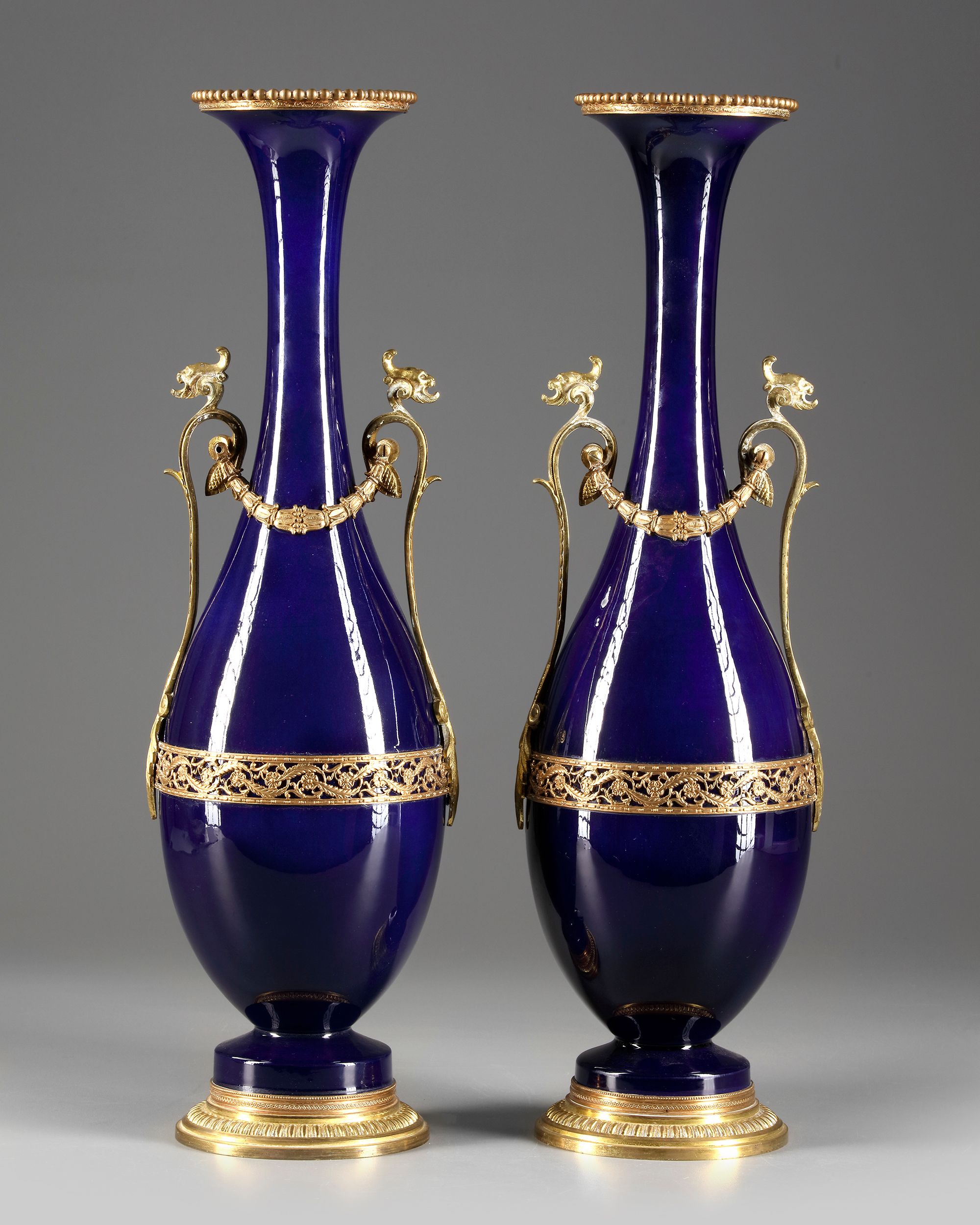 Of gilded bronze and blue porcelain. Circa 1900. Good condition H 47 cm.