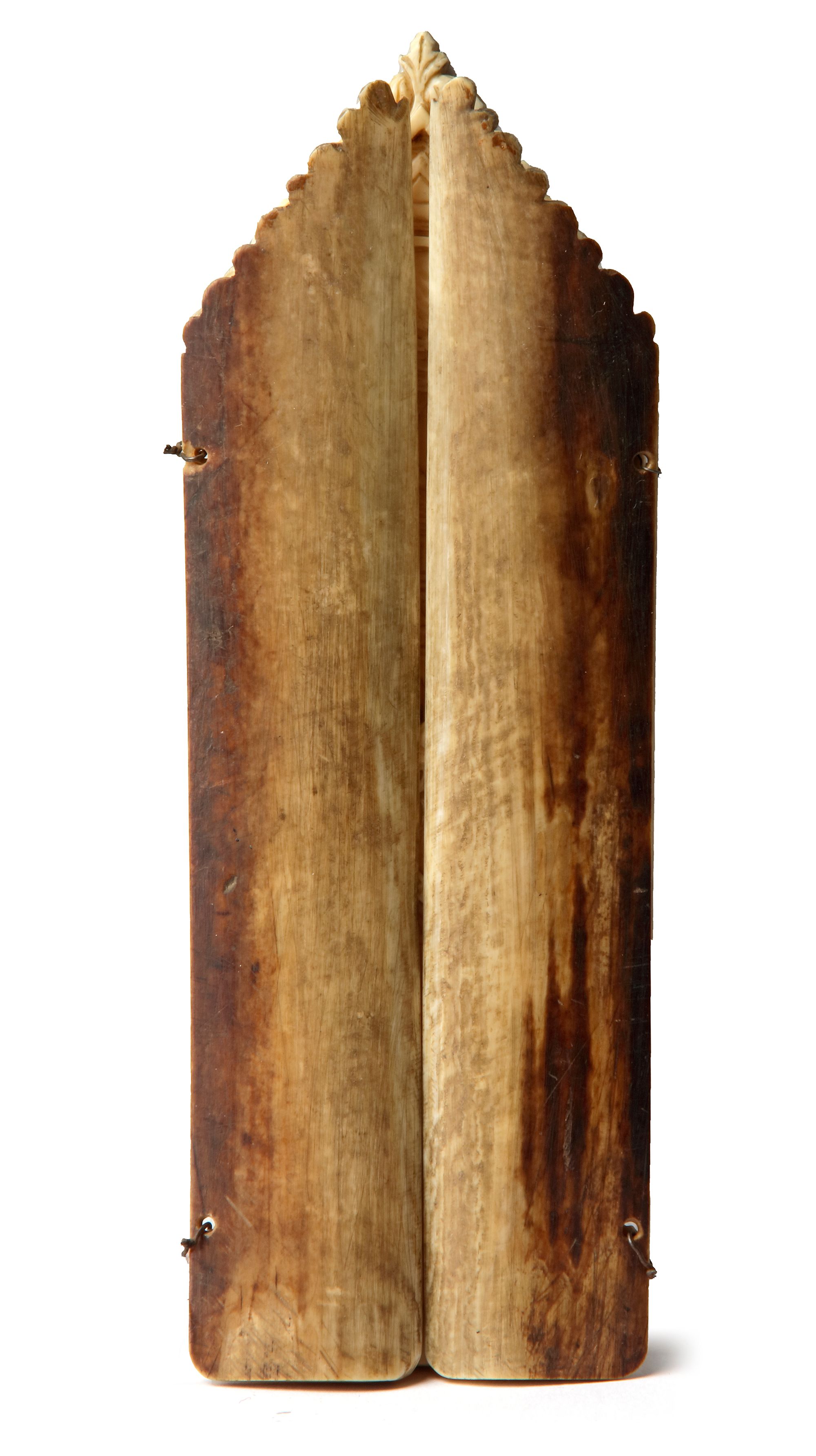 A carved ivory triptych depicting Christ and Mary Magdalene before a temple. Open: 11 by 15.2 cm.