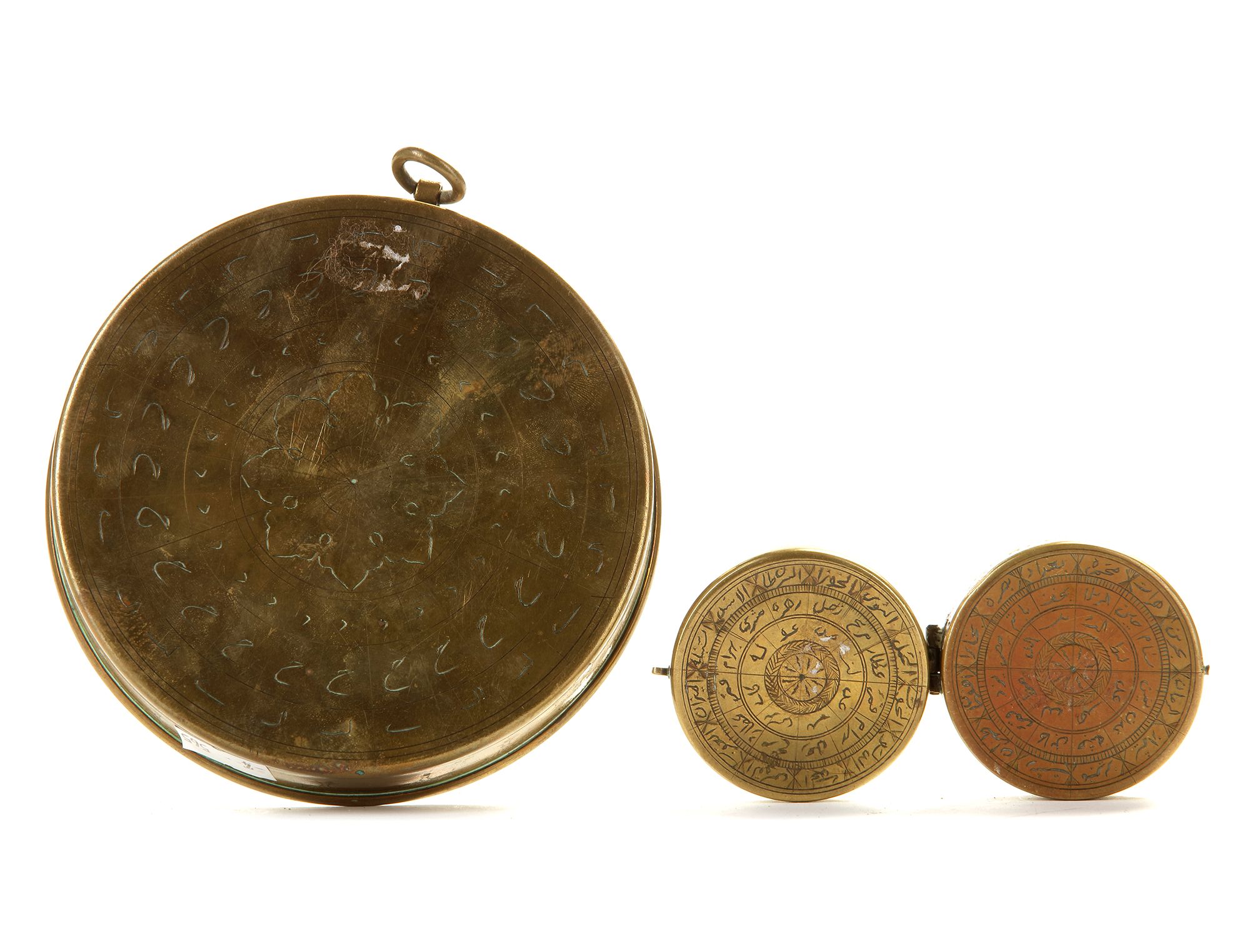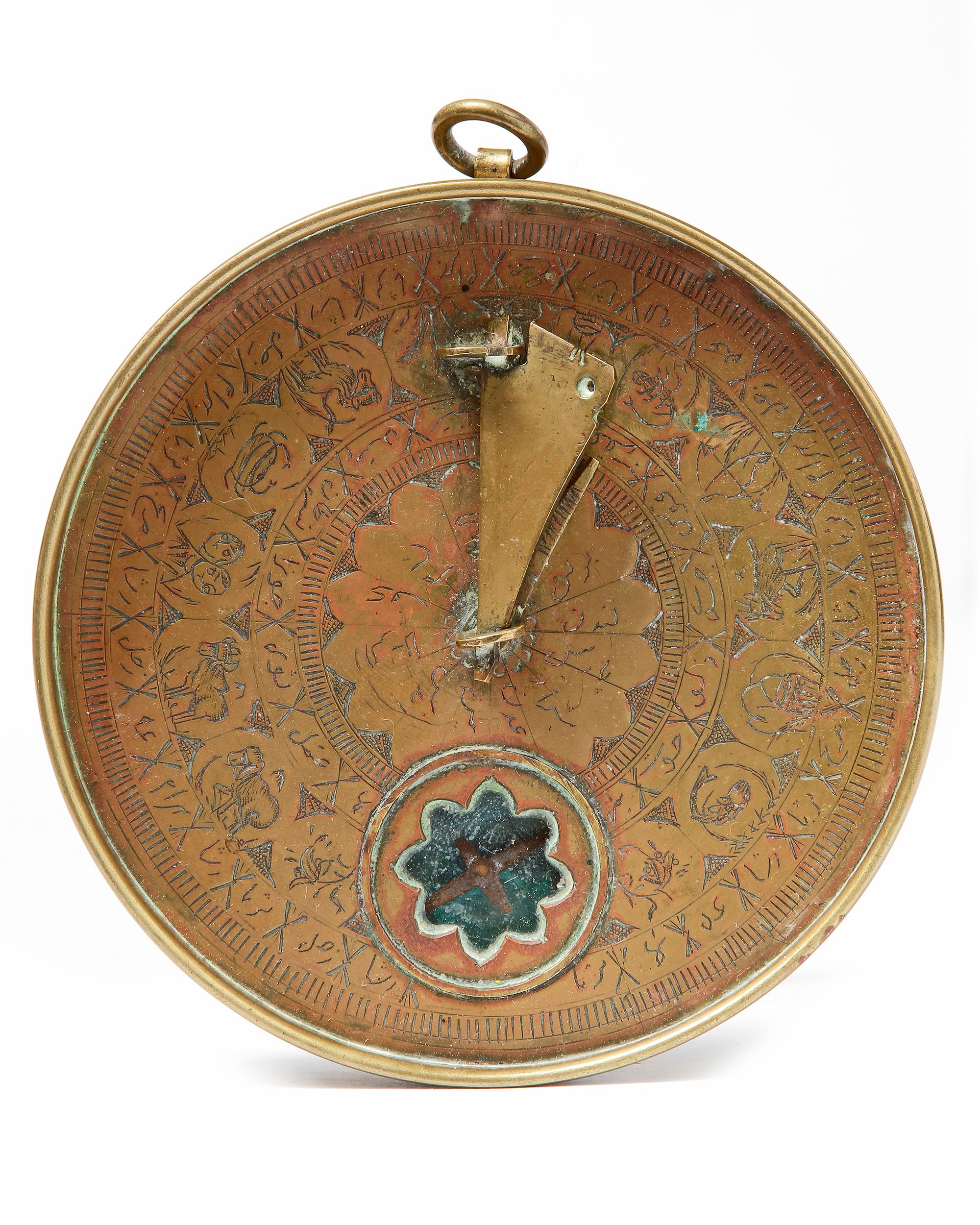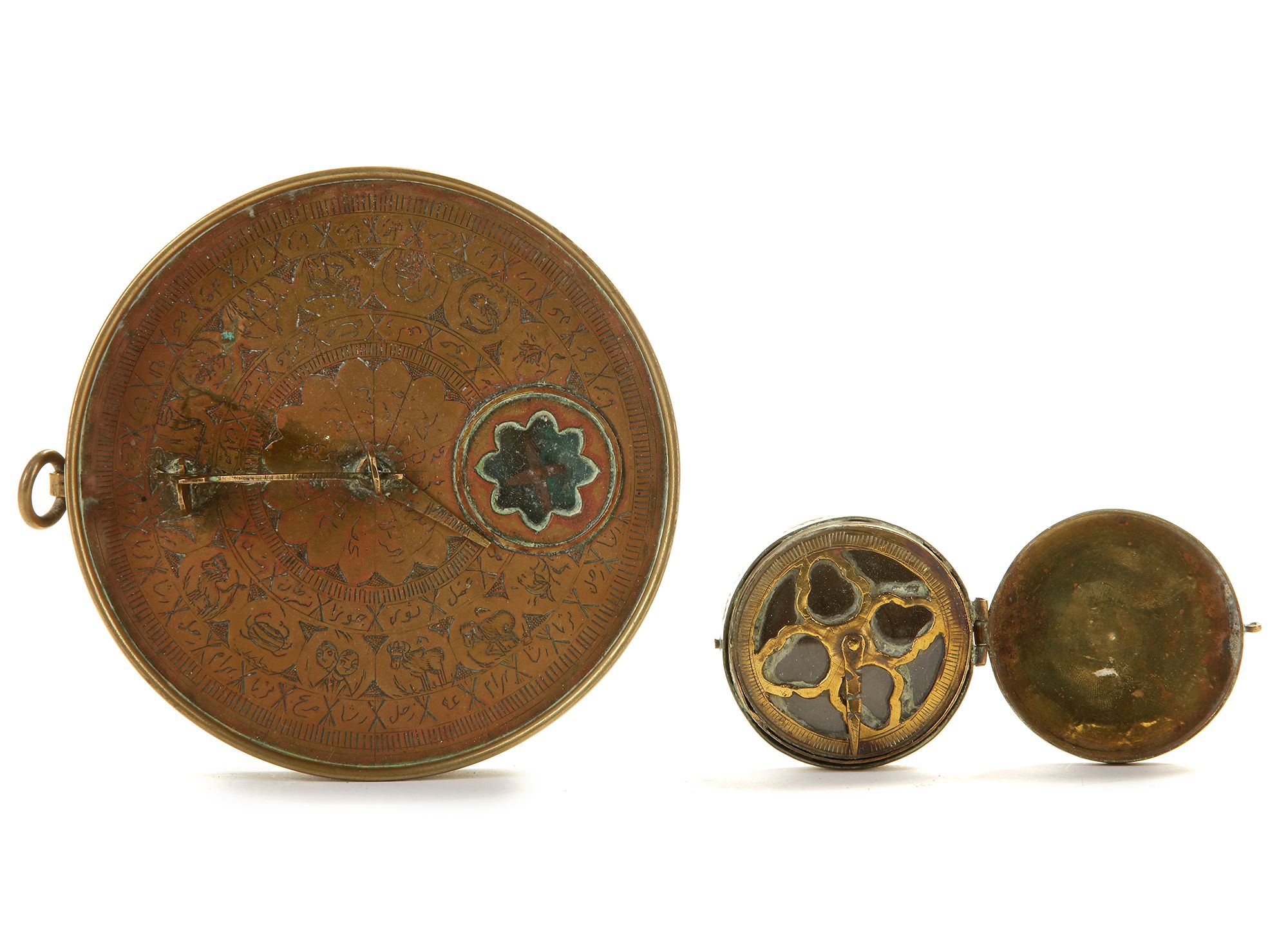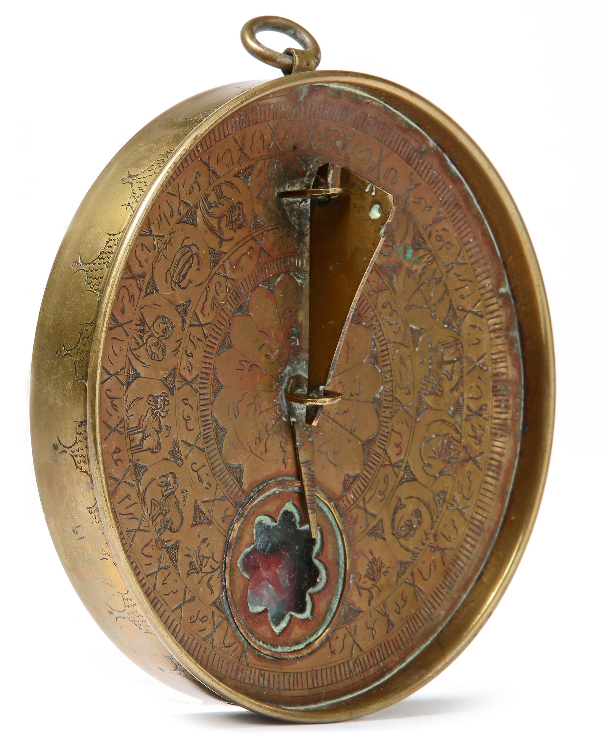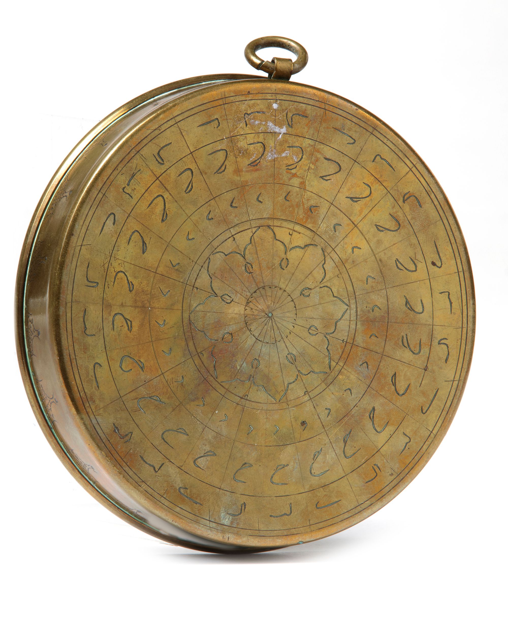 Of circular form with hinged lid and suspension loop, incised with inscriptions and zodiac signs. 12.5 cm. diam.