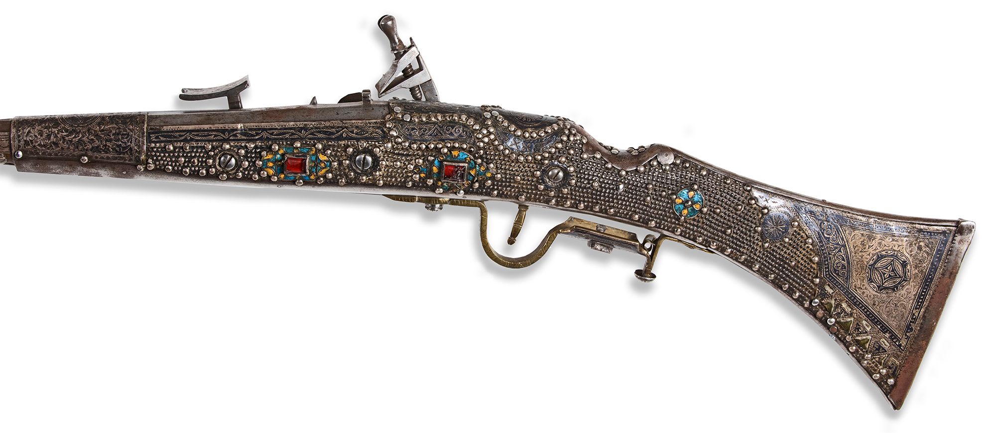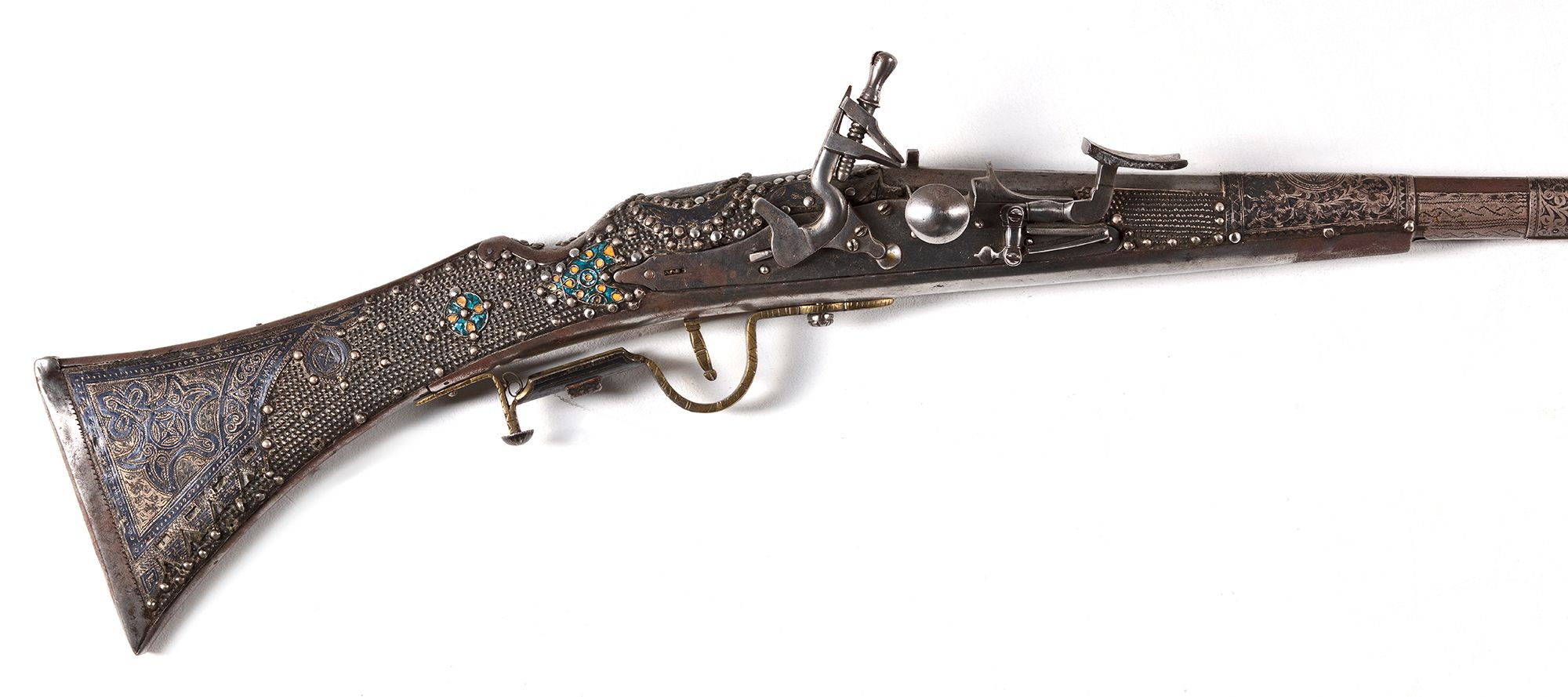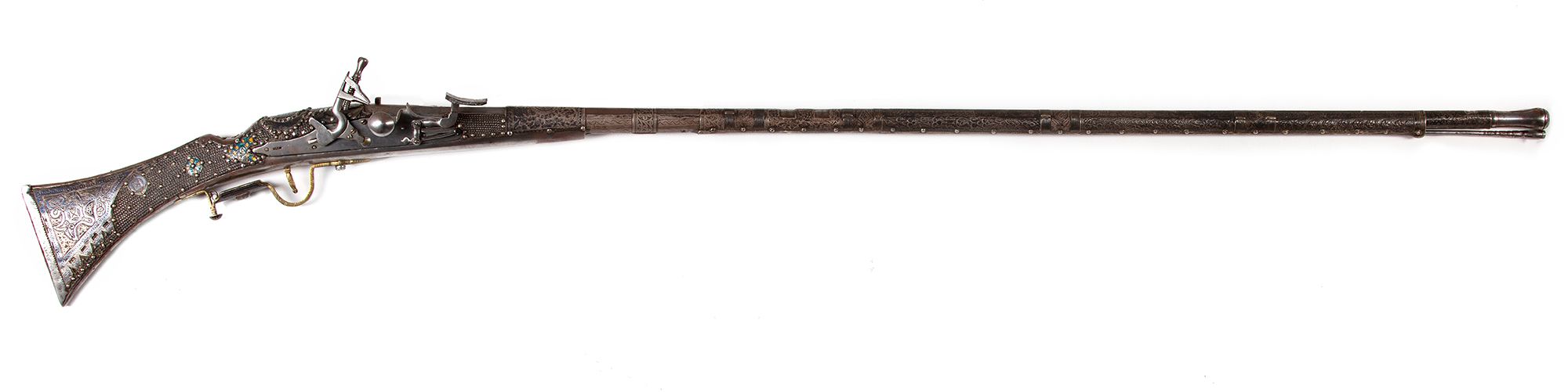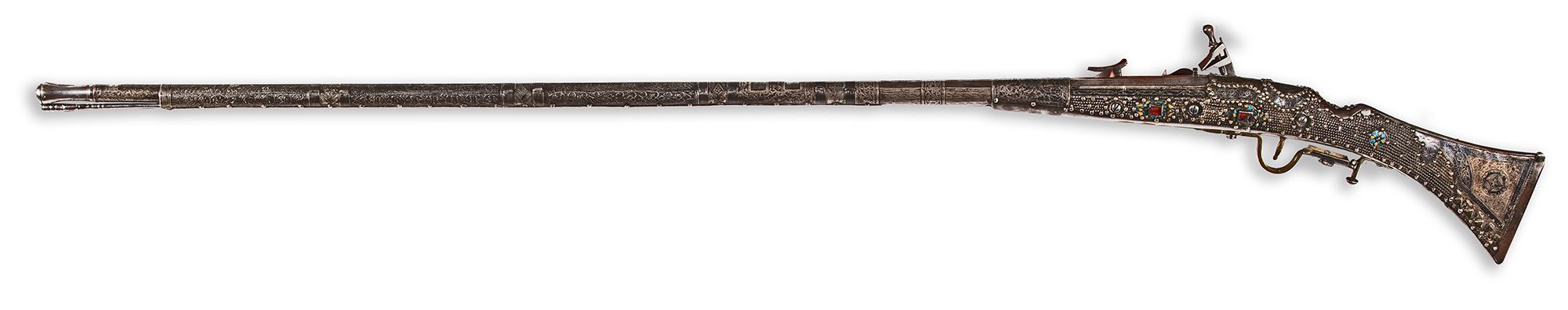 With russet swamped octagonal sighted barrel retained by silver barrel bands embossed with foliage. 160 cm.