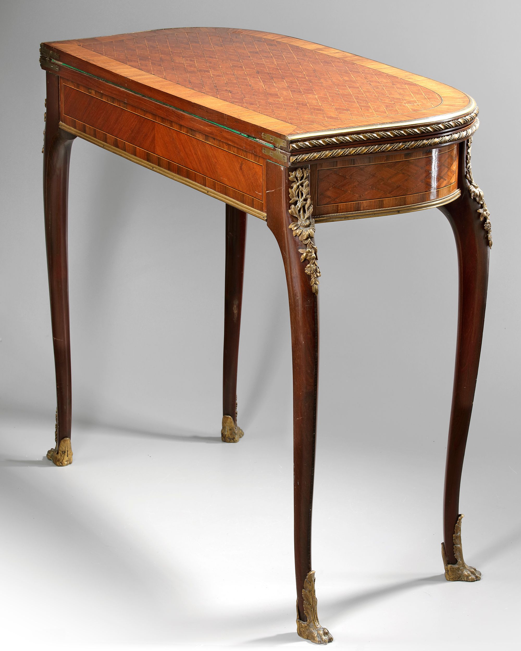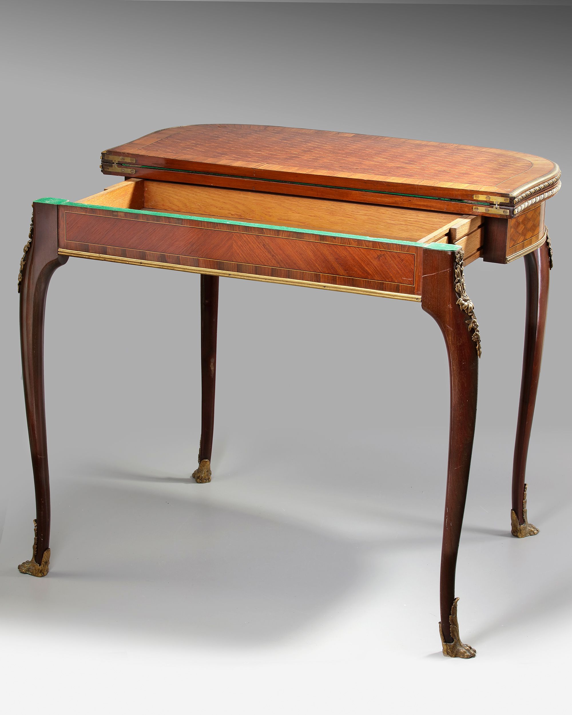 A French Louis XVI style, game table in mahogany wood and marquetry, which opens from two sides, ornamentation of gilded bronze, the tray reveals a flap covered with dark red felt, model of François Linke. In a good condition. H 78 cm. W 85 cm. D 43 cm.