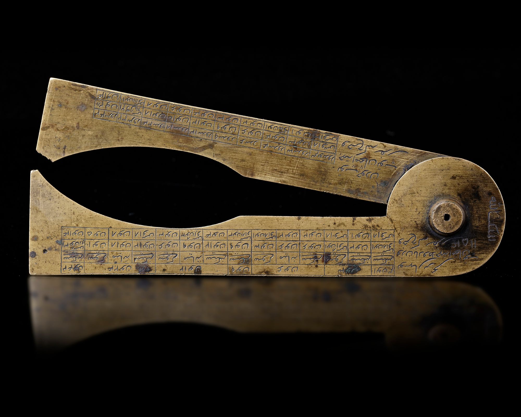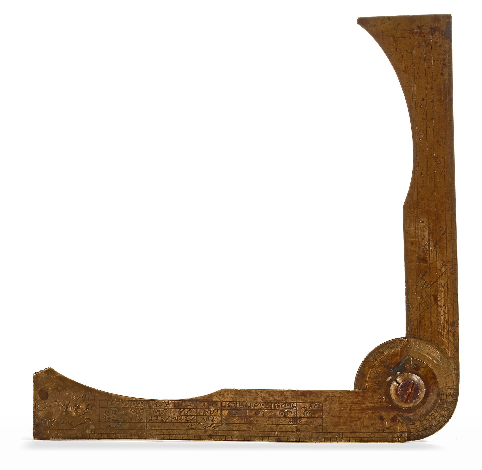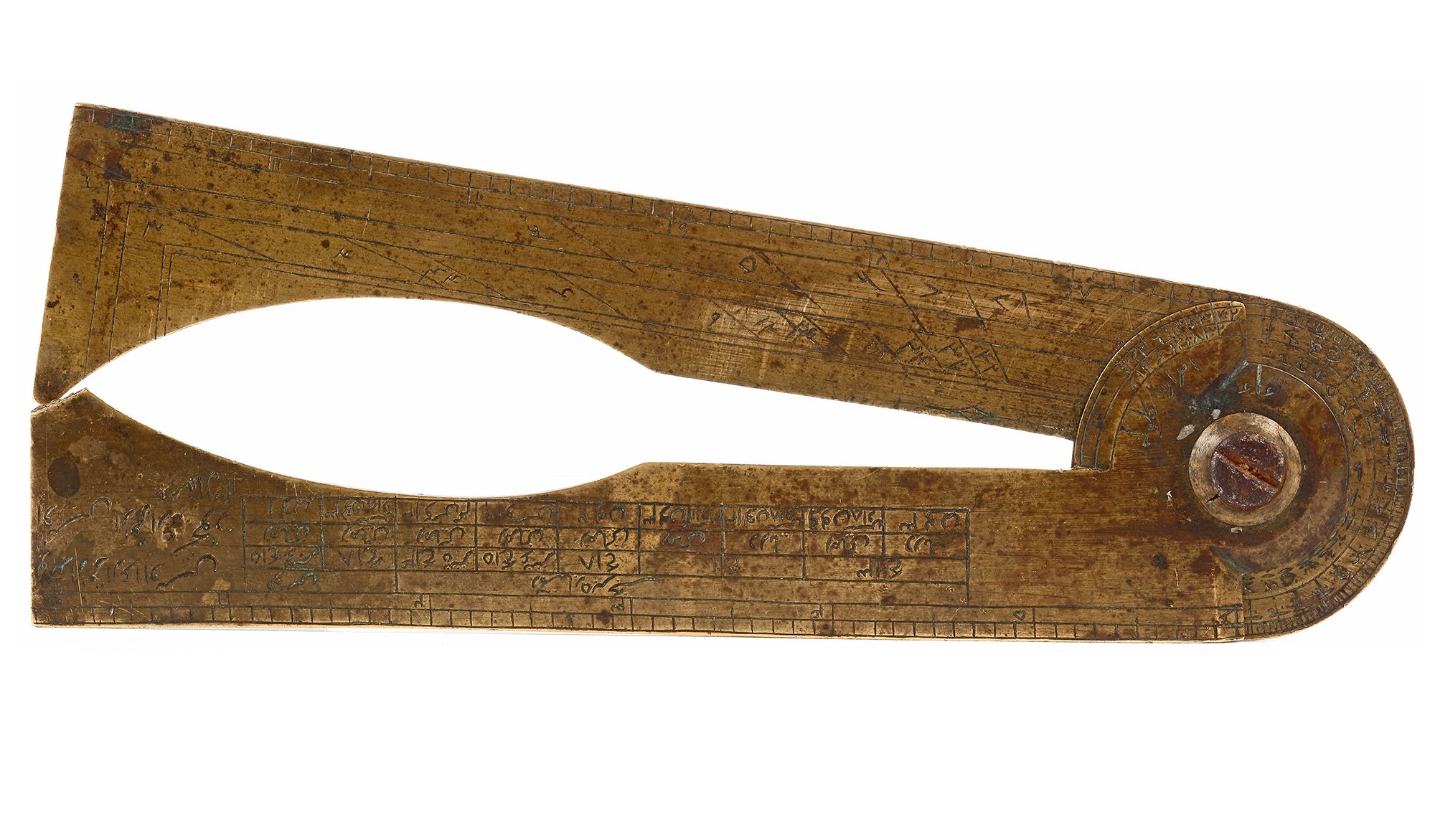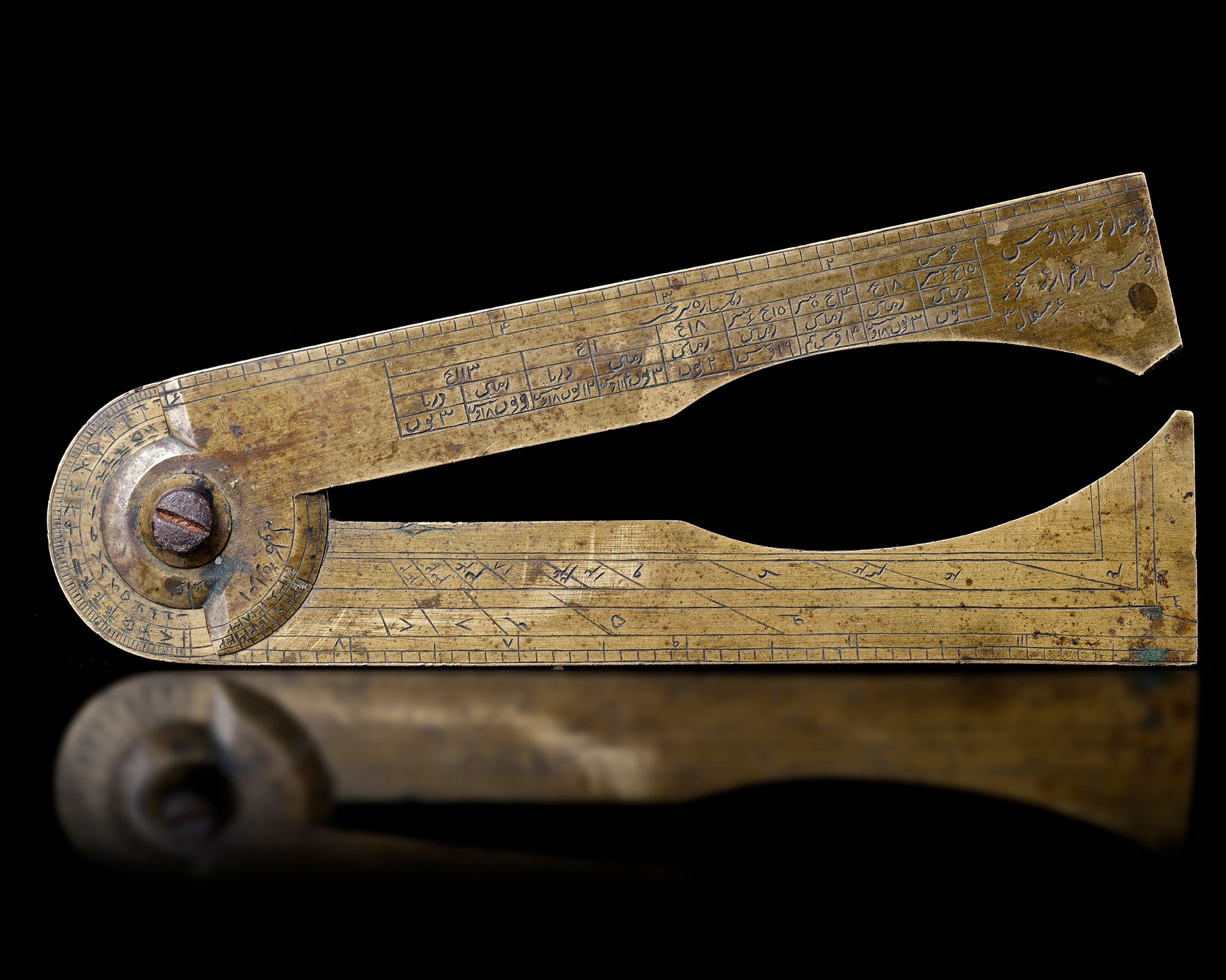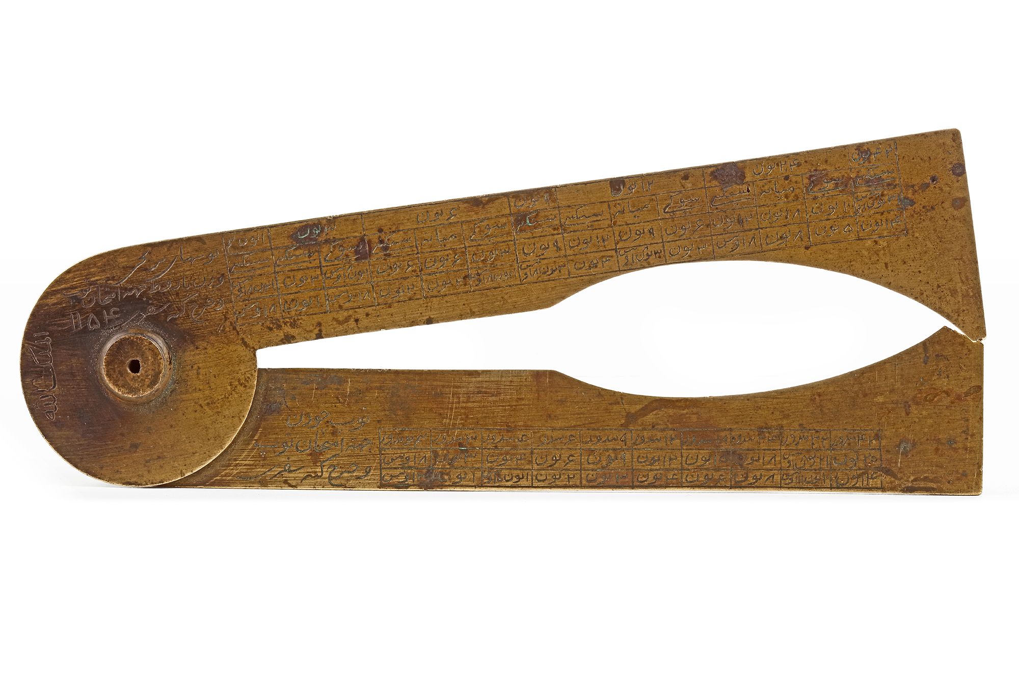 A very rare 18th century Persian gunner’s caliper (also known as gunner’s compass/ gunner’s sector) modelled after one of the various types of gunner’s calipers developed and produced in 18th century England. Despite the fact that English versions of this instrument are quite common, eastern versions seem to be very rare, since there are very few descriptions or references to similar instruments in literature. The Persian caliper at hand seems to be identical to an English gunners caliper auctioned 30th of October, 2019 at Morphy Auctions, as lot. 1187, made by “Gilkerson Tower Hill London”. A quick comparison shows that the numerical tables and engravings correspond almost identically.