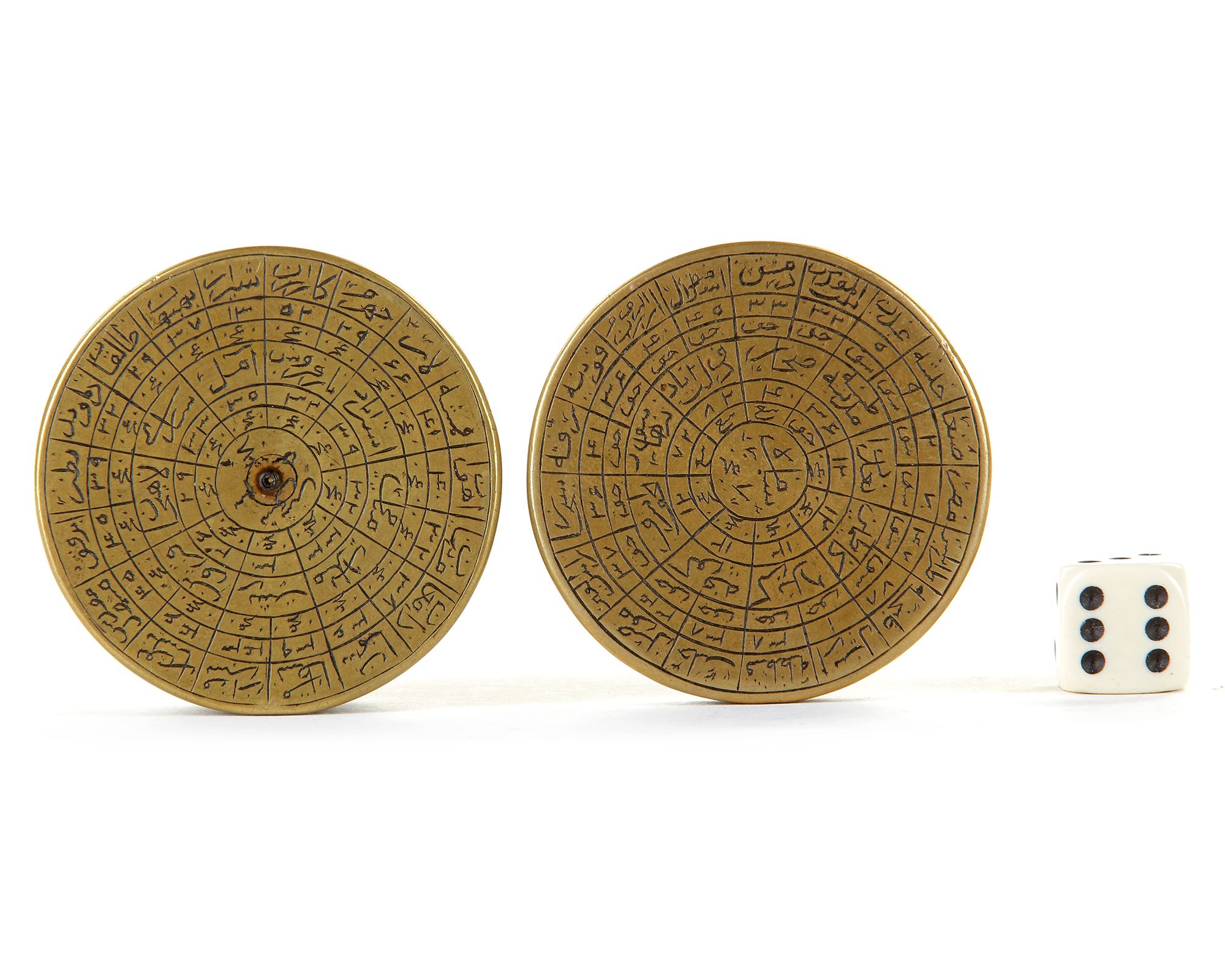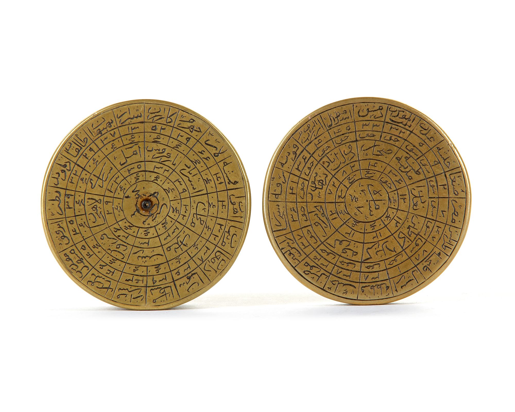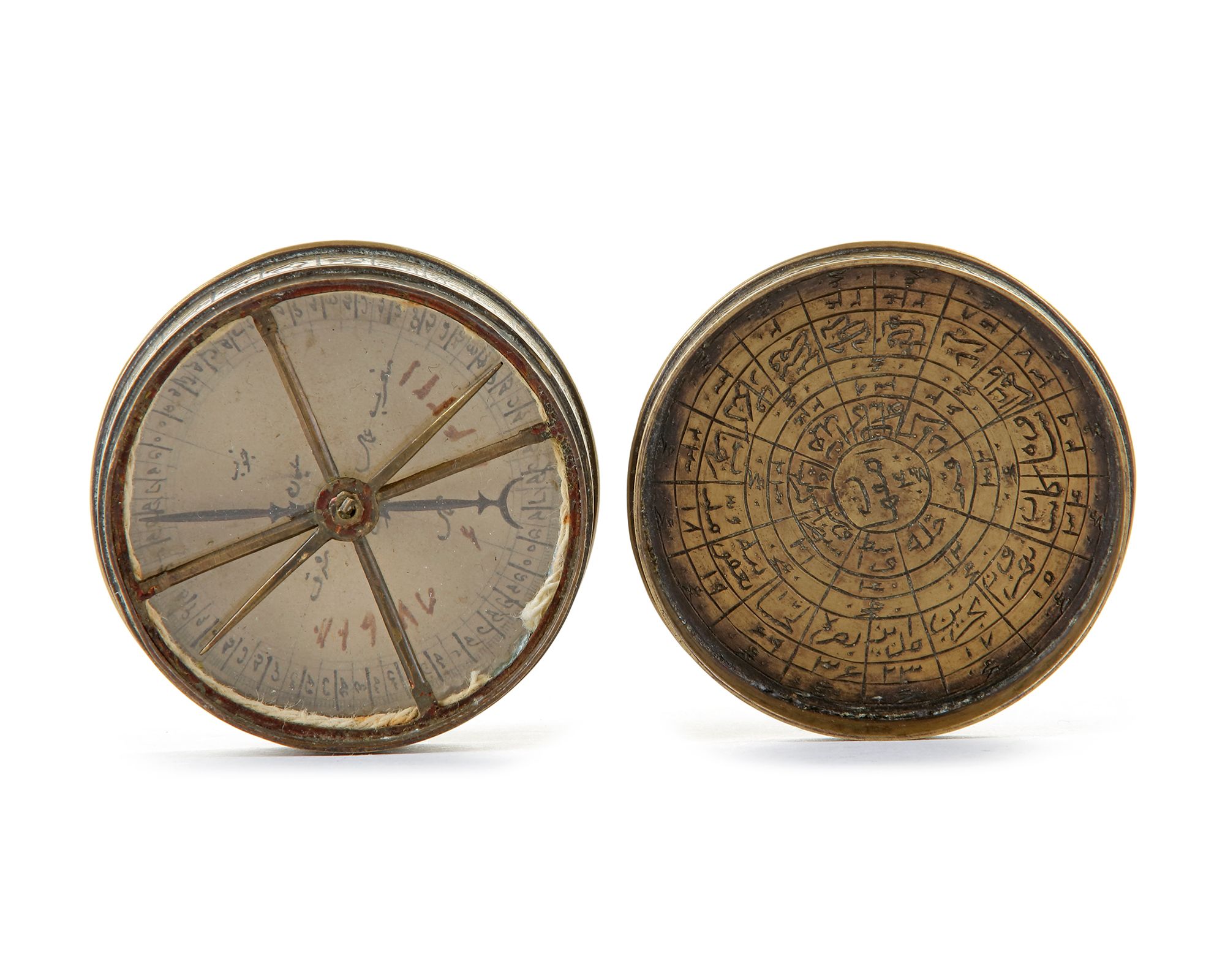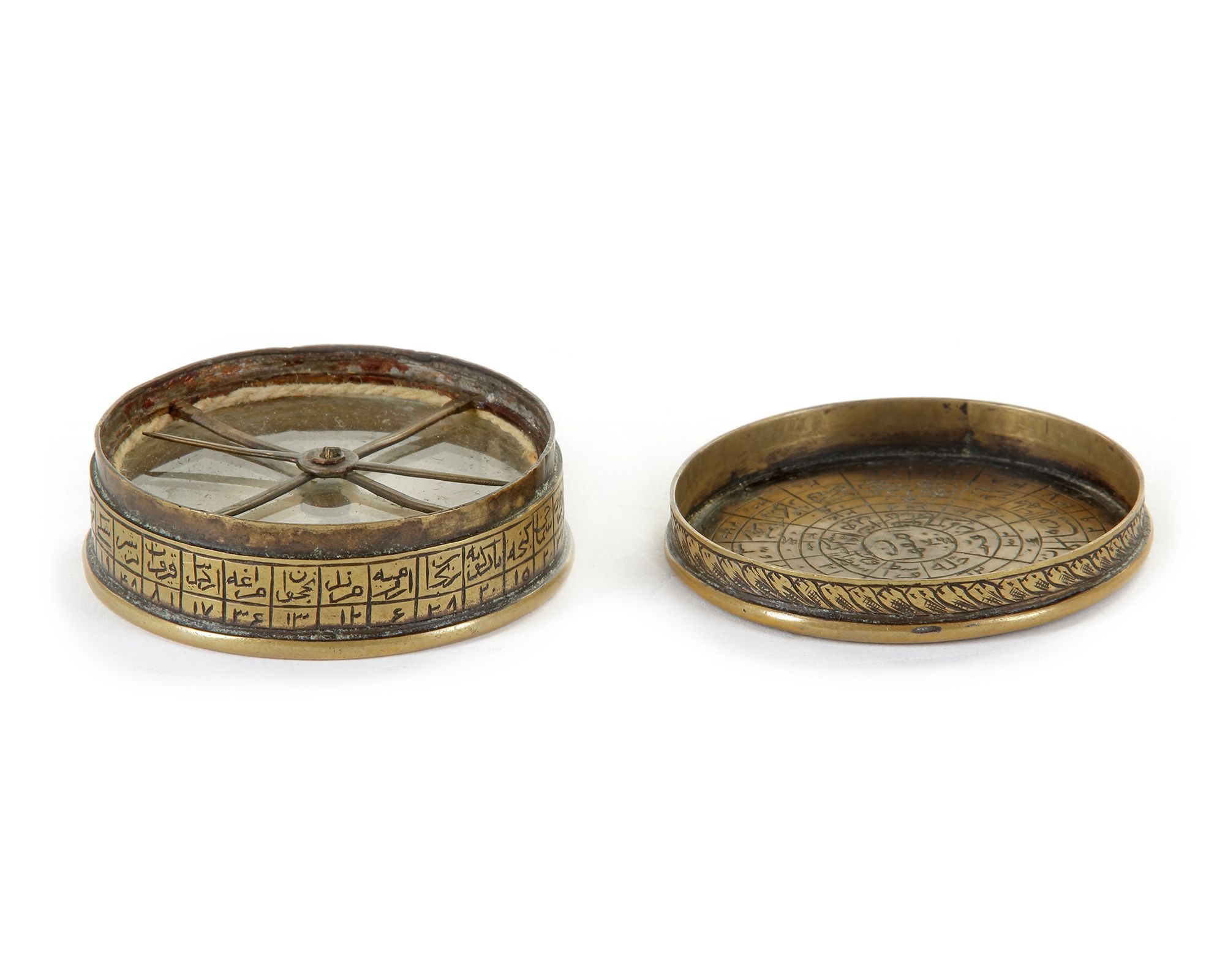 Of circular form with hinged lid, incised with inscriptions, some bands with a punched ground, the interior with glass frame and compass. 5 cm. diam.