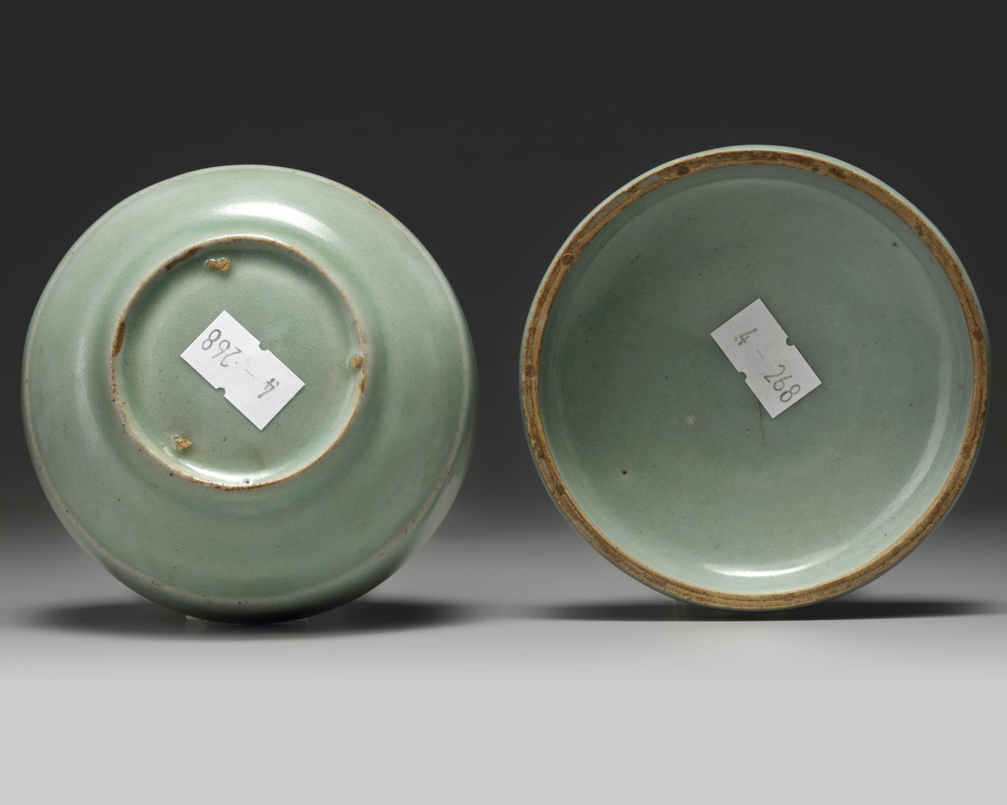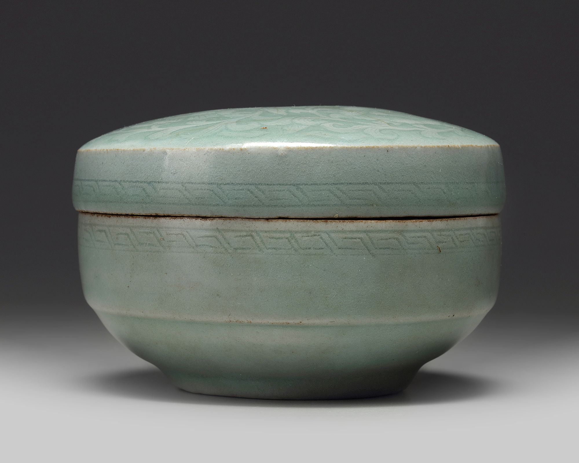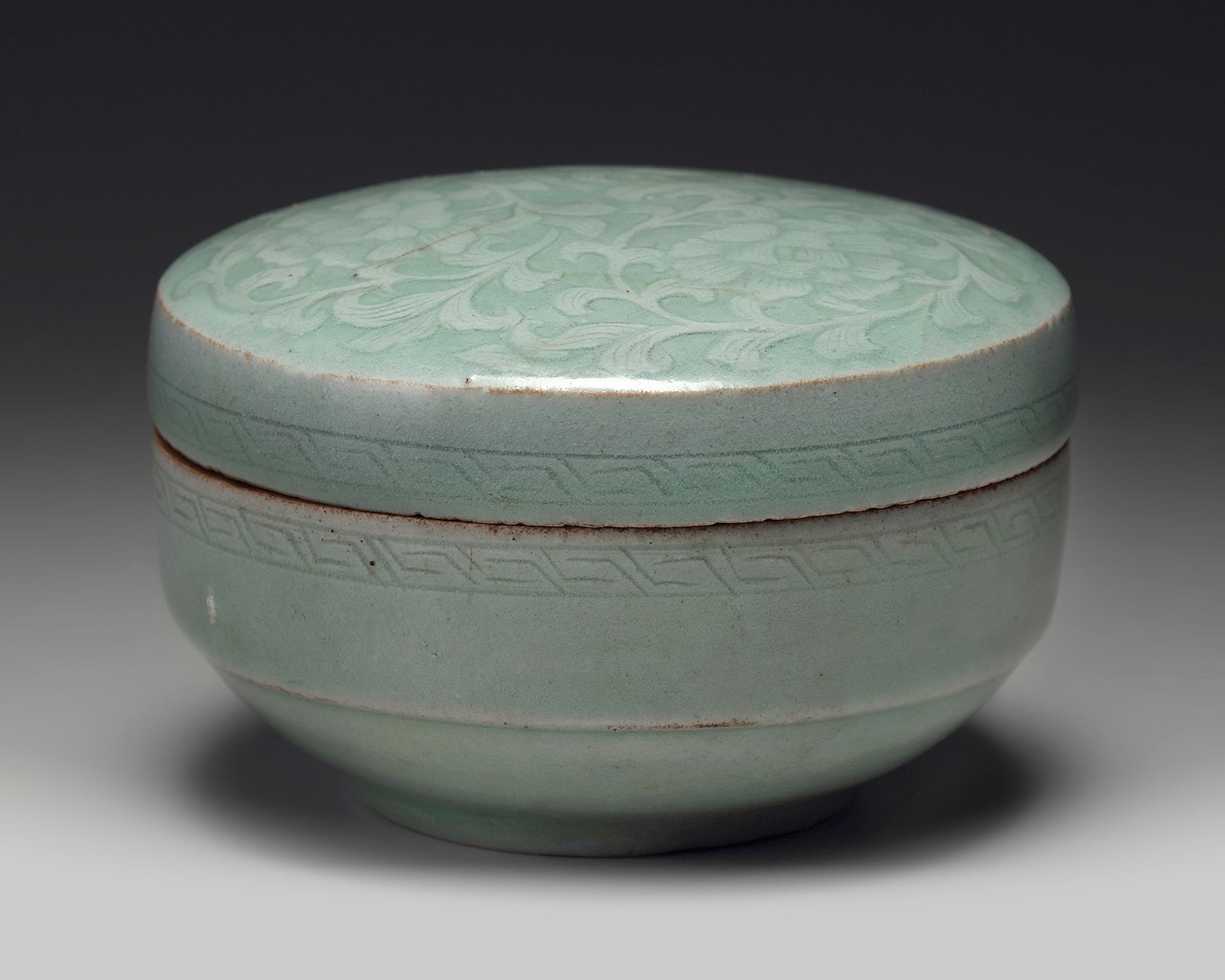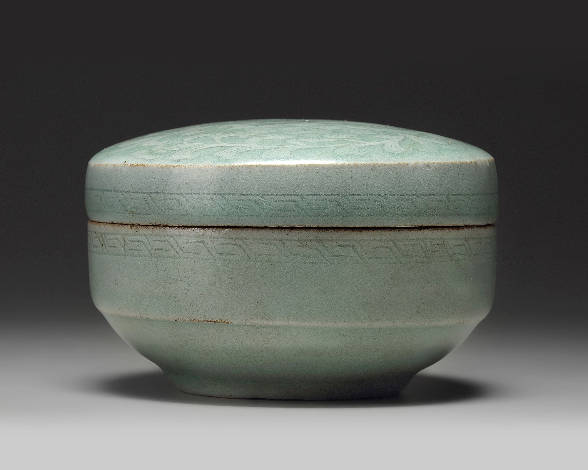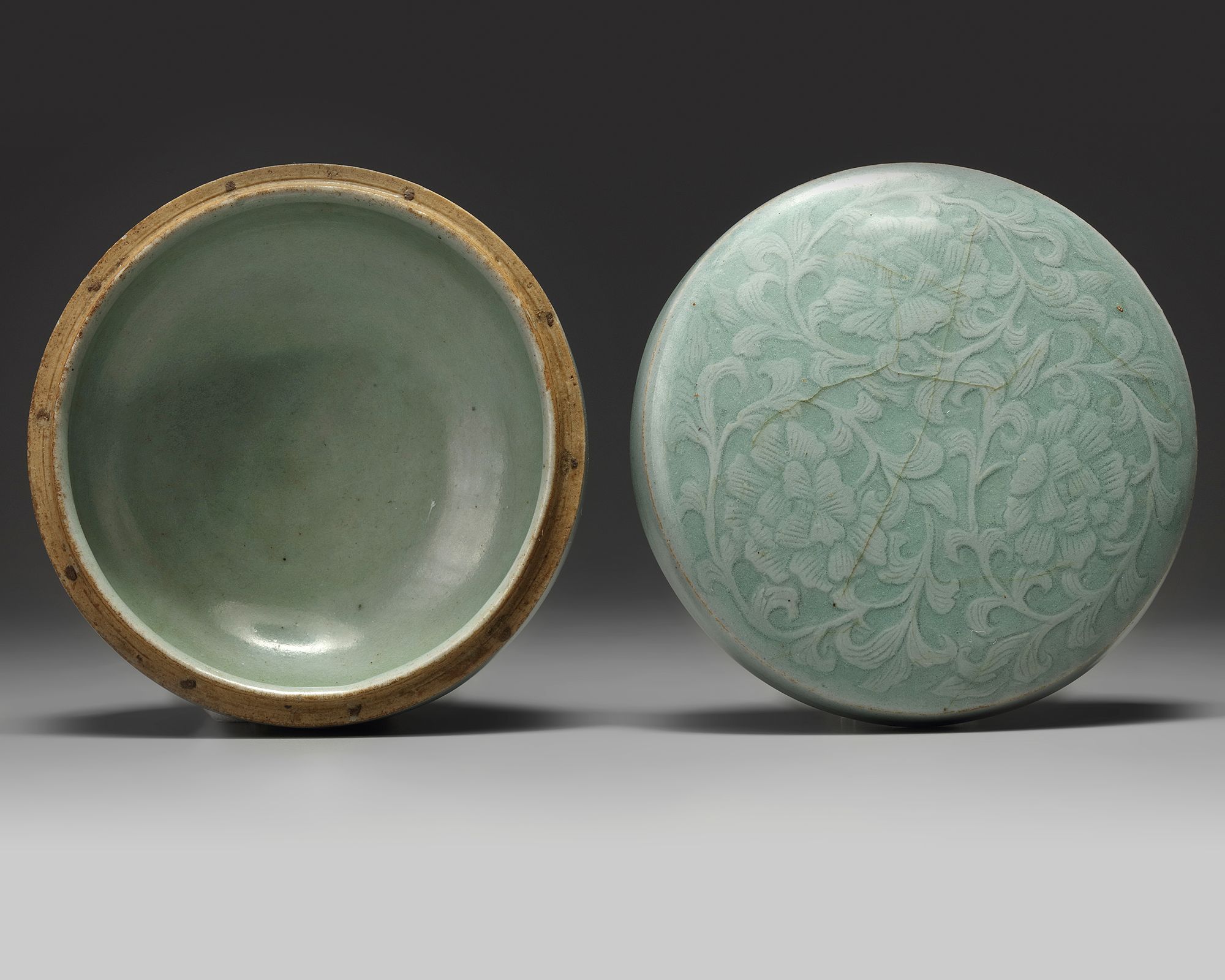 A KOREAN CELADON-GLAZED 'PEONIES' ROUND BOX AND COVER